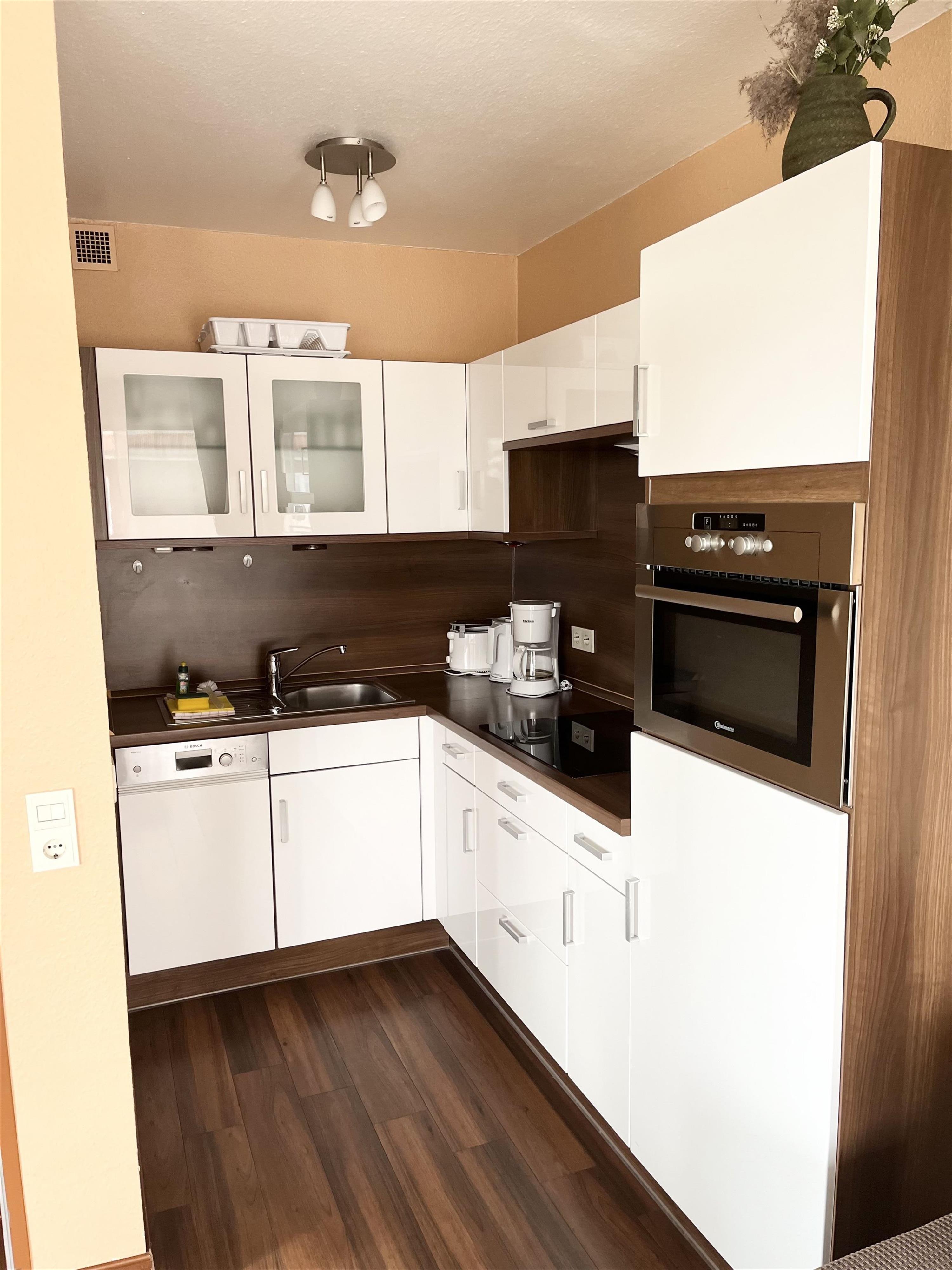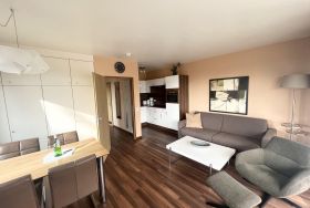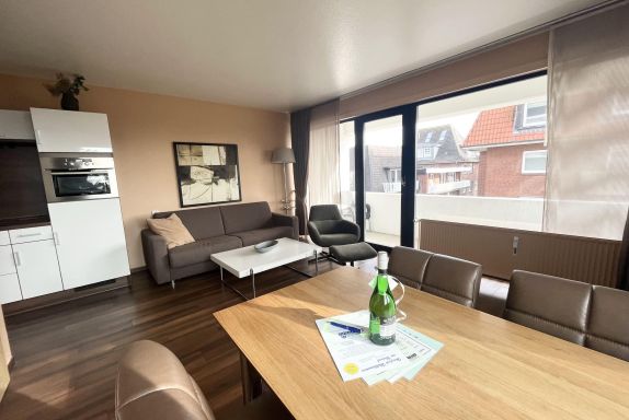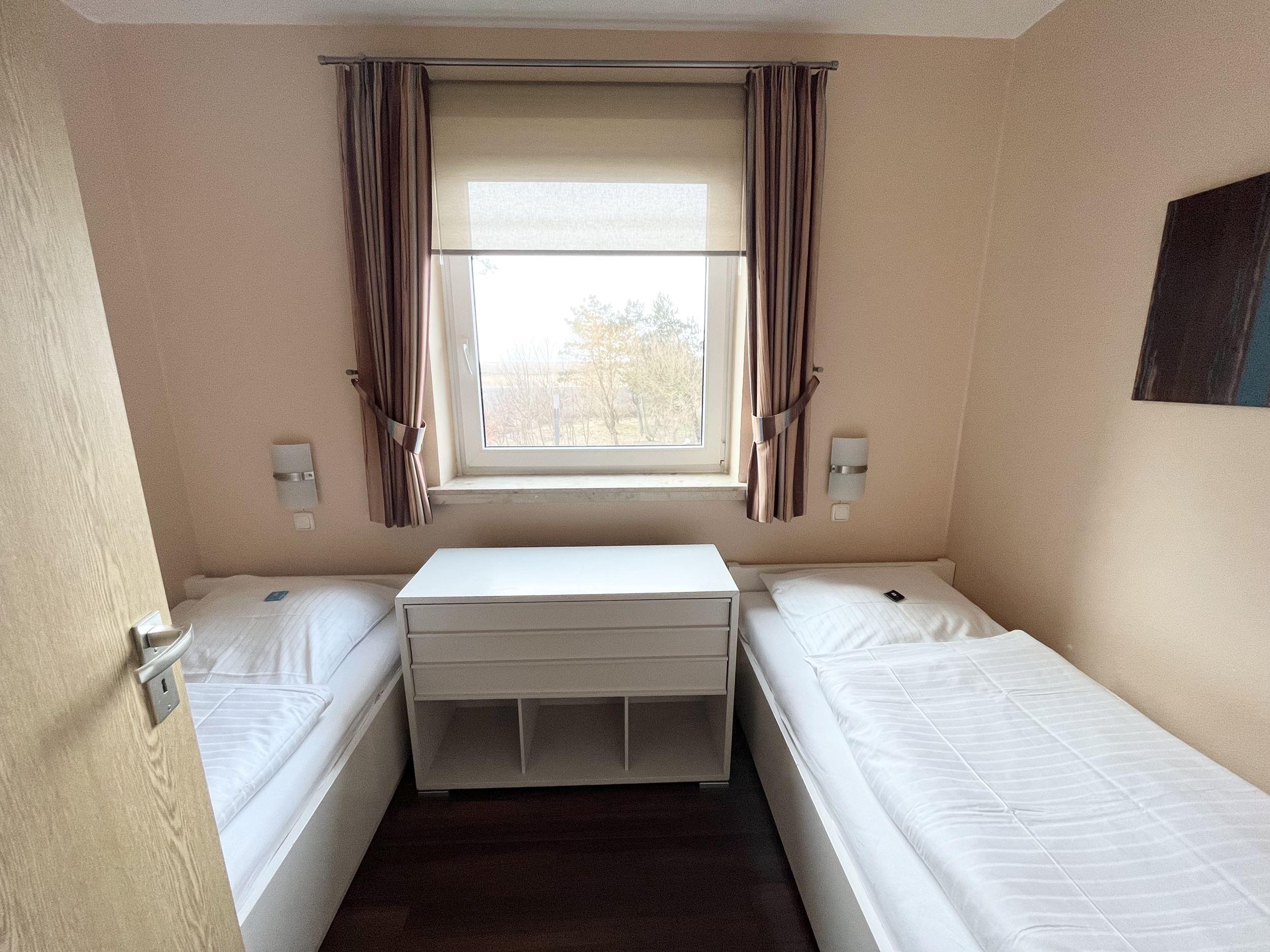 Schlafraum mit 2 Einzelbetten (je Bett 90 x 190), Wohn-Schlafraum mit Doppel-Schlaf-Couch, PVC-Fußboden, Essecke, Küchenzeile mit Mikrowelle, Backofen und Geschirrspüler, Dusche/WC, Kabel-TV, Durchwahltelefon, Balkon, PKW-Platz-Nr. 37, Aufzüge und Fahrradkeller vorhanden. Rezeption, Brötchenservice, Schwimmbad, Sauna kostenpflichtig, kostenfreier Internetzugang (LAN1-Germania).