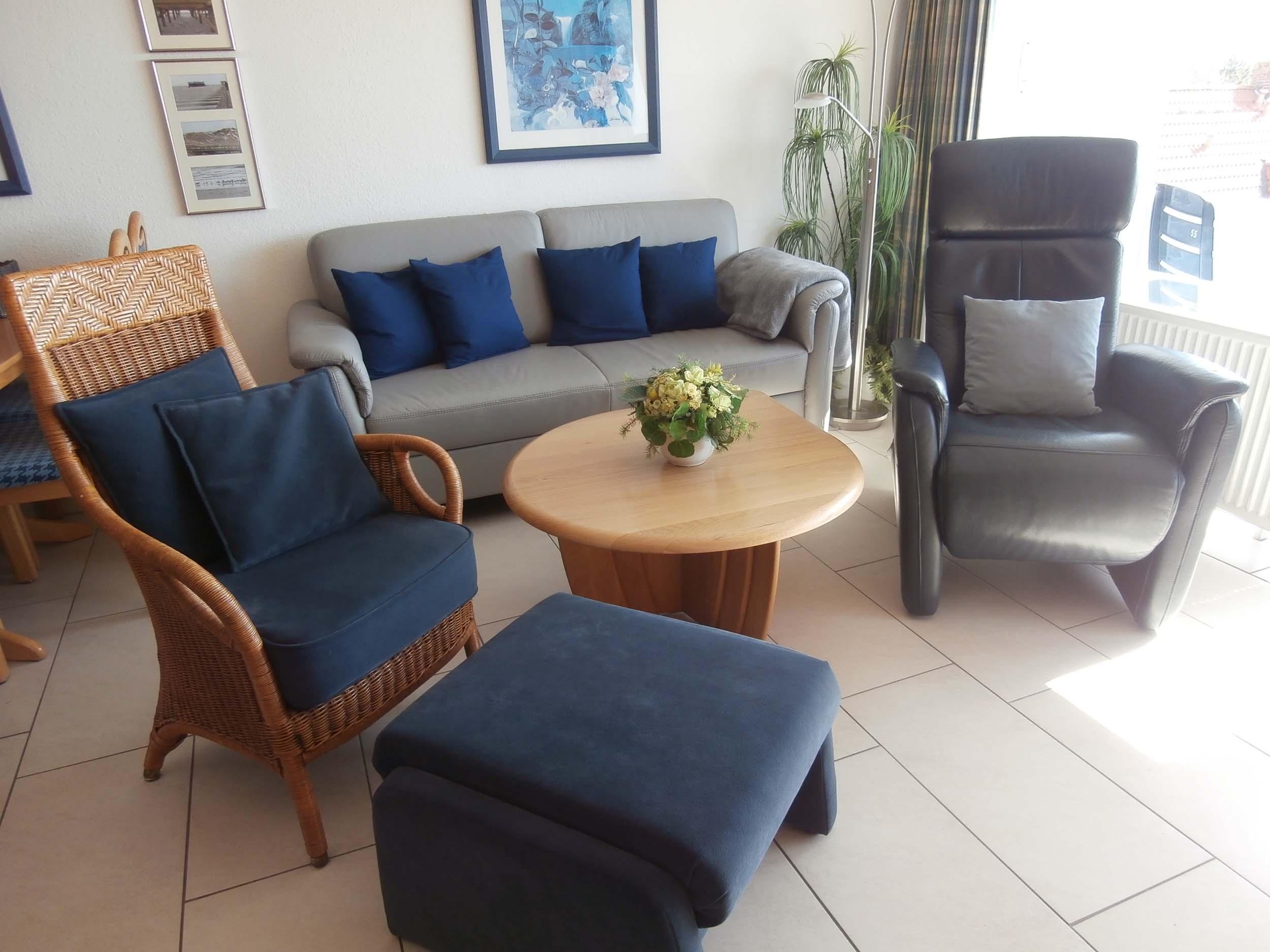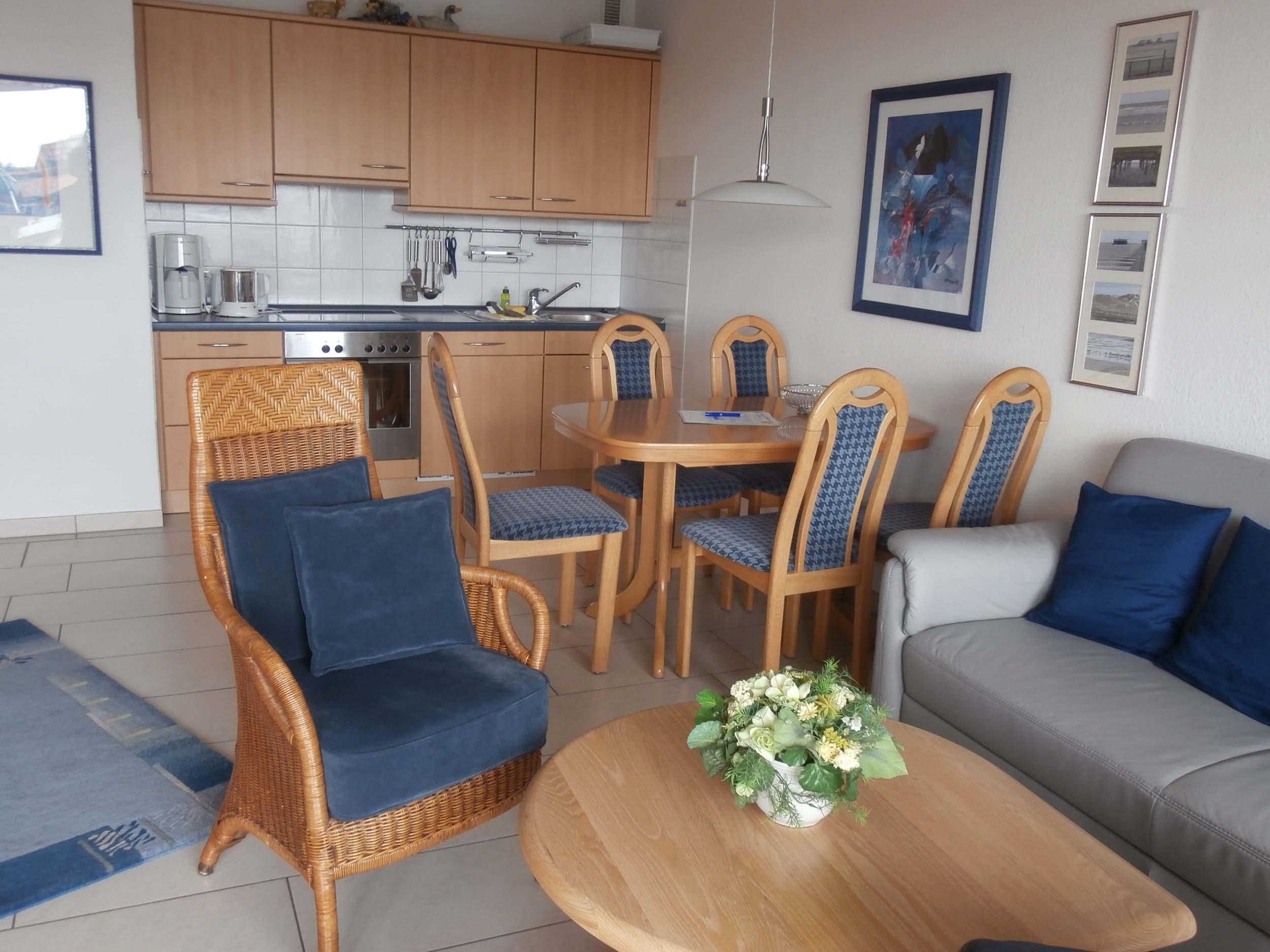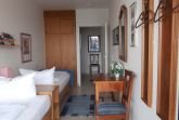 Schlafraum mit 2 Einzelbetten, Wohn-Schlafraum mit 2 Wandschrankbetten, Fußboden ist gefliest, Sitzecke, Essecke, Küchenzeile mit Backofen, Dusche/WC, Kabel-TV, Durchwahltelefon, Balkon, PKW-Platz-Nr. 55, Aufzug und Fahrradkeller.