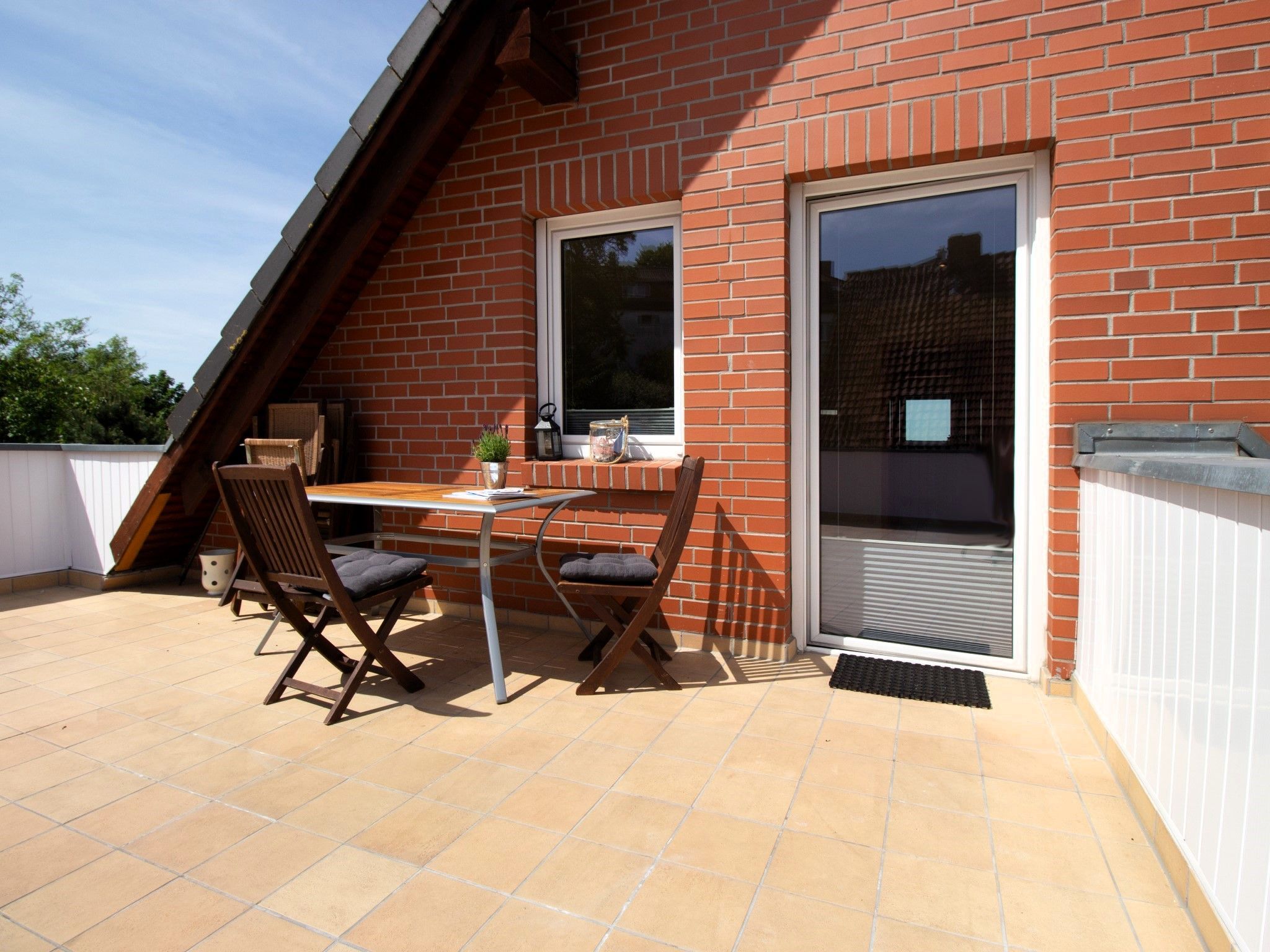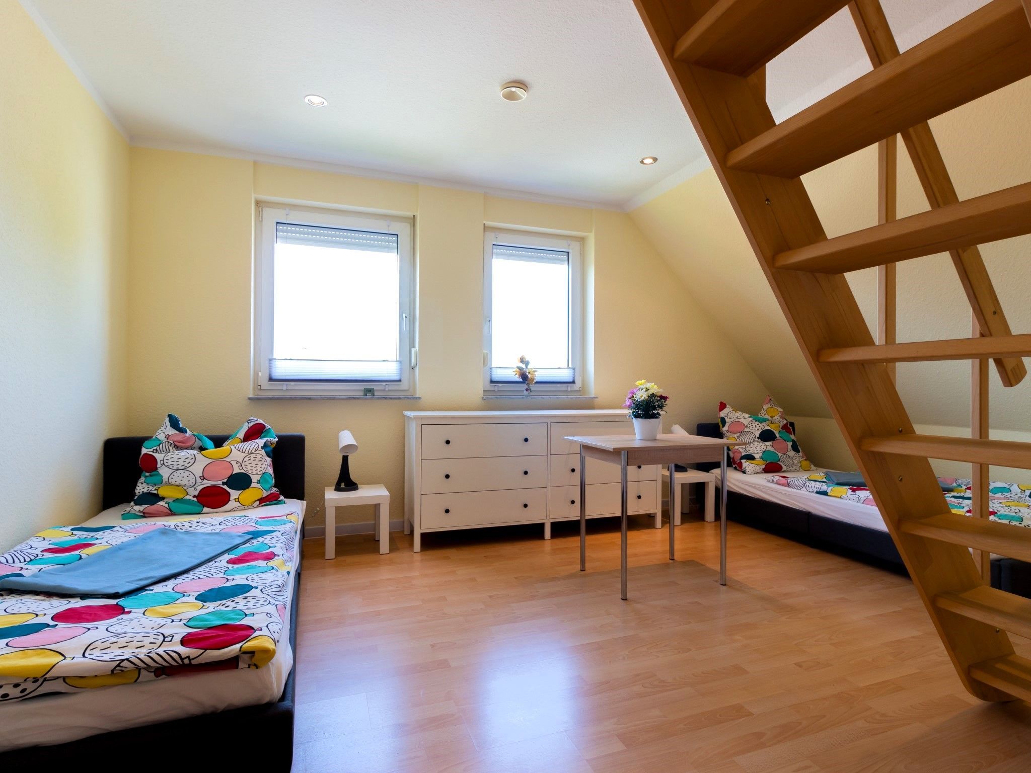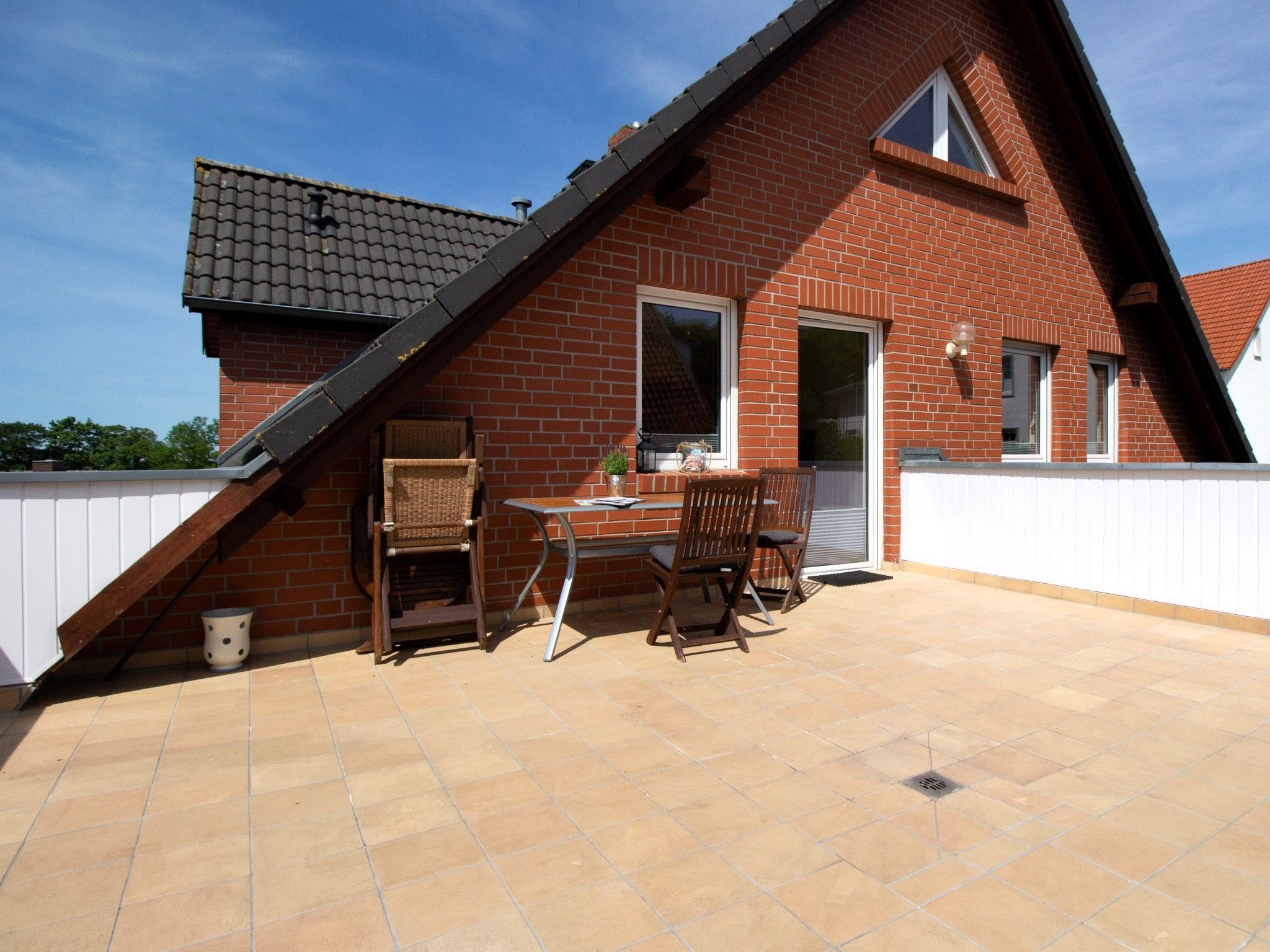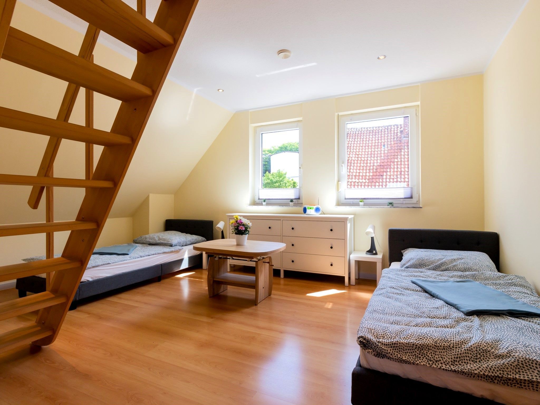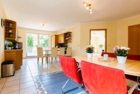 Die Wohnung bietet ein großes Wohnzimmer und eine vollausgestattete Küche sowie eine Gästetoilette in der ersten Etage. Von der Küche und vom Wohnzimmer hat man Zugang zum Südbalkon. In der zweiten Etage befinden ein Wohn- und Schlafbereich mit Zugang zur riesigen Terrasse. Des Weiteren befinden sich dort das Vollbad mit Dusche und Badewanne sowie drei Schlafzimmer mit insgesamt vier Einzelbetten und einem Doppelbett (160 x 200cm). Die Terrasse sowie der riesige Balkon sind Richtung Süden ausgerichtet und bieten einen sonnigen und grünen Blick bis über die anderen Häuser hinweg. Sie laden zum Verweilen beim Sonnenuntergang ein. Ein Garagenstellplatz mit direktem Zugang zur Wohnung und ein zusätzlicher PKW-Stellplatz sind auf dem Grundstück vorhanden.