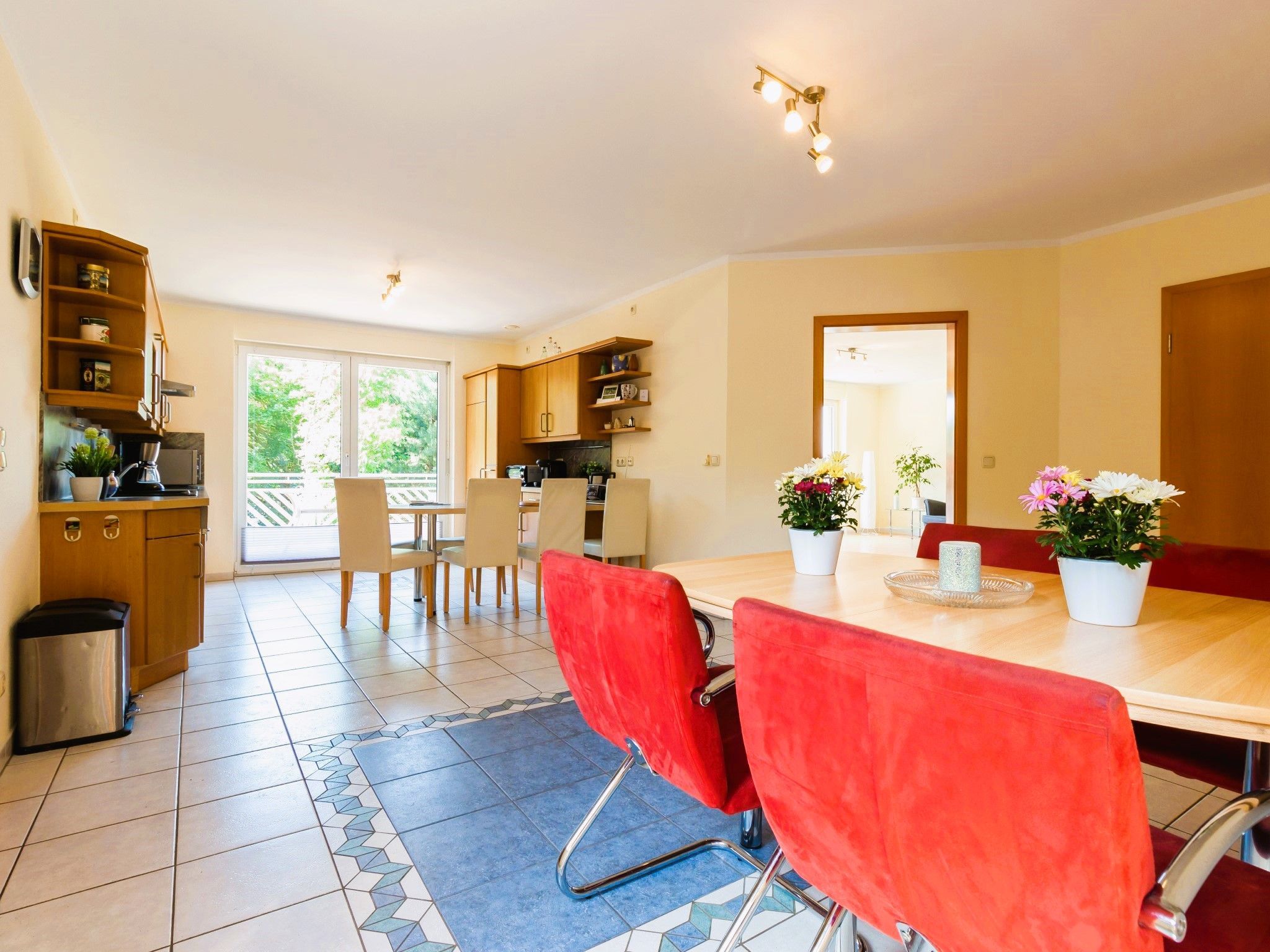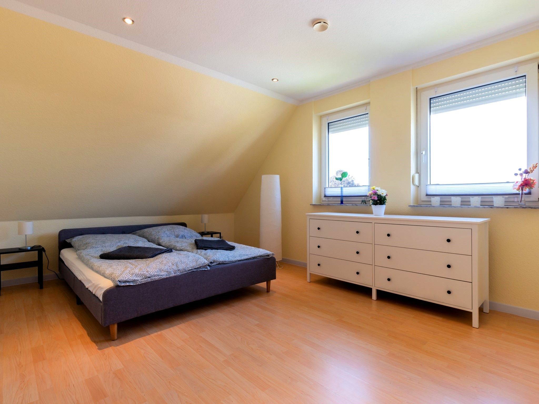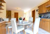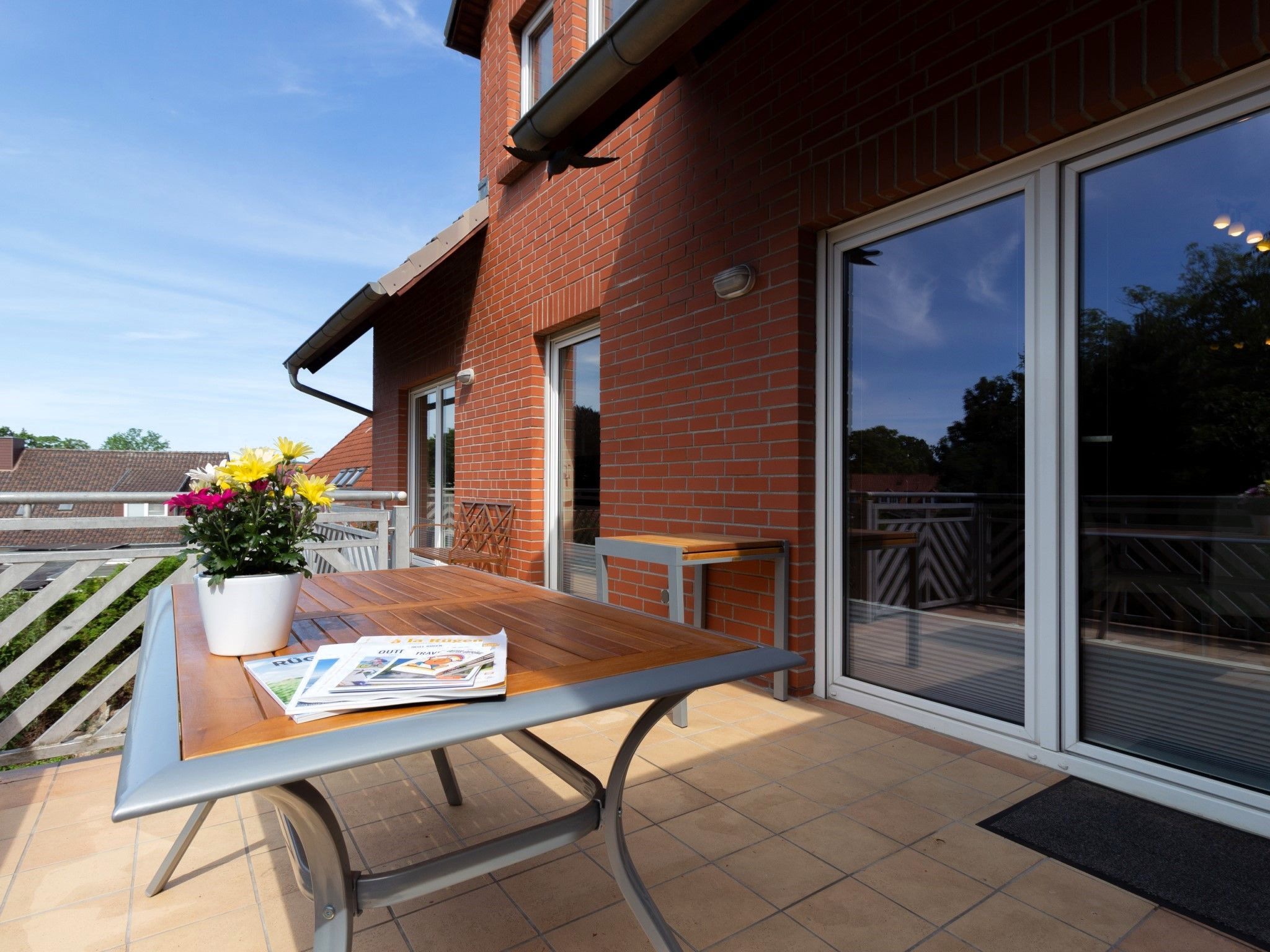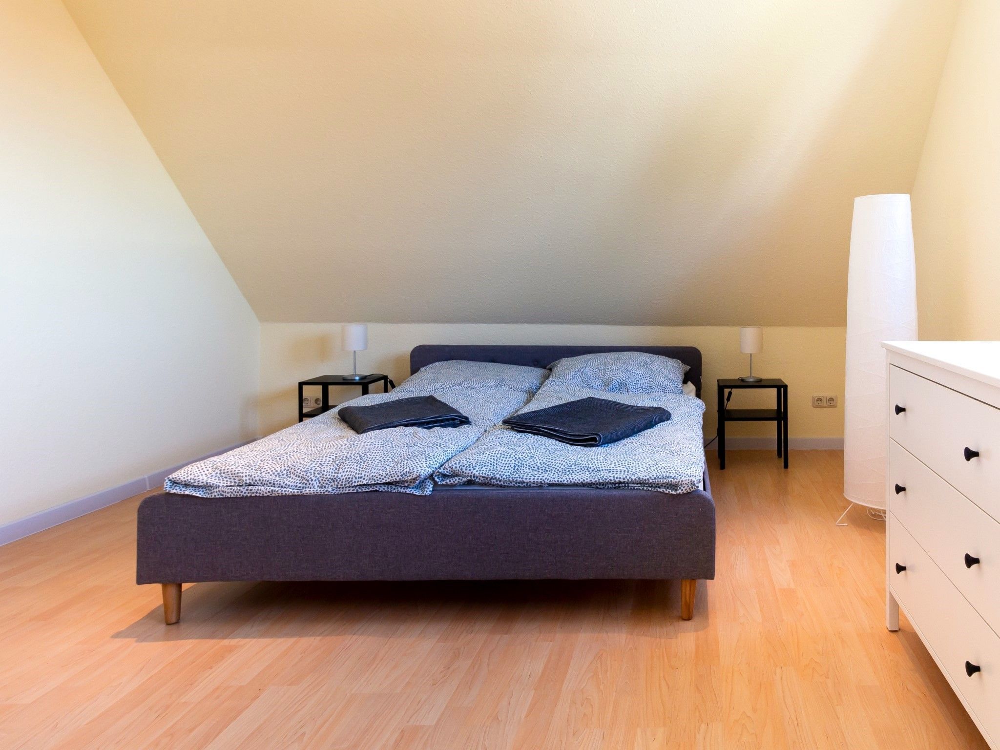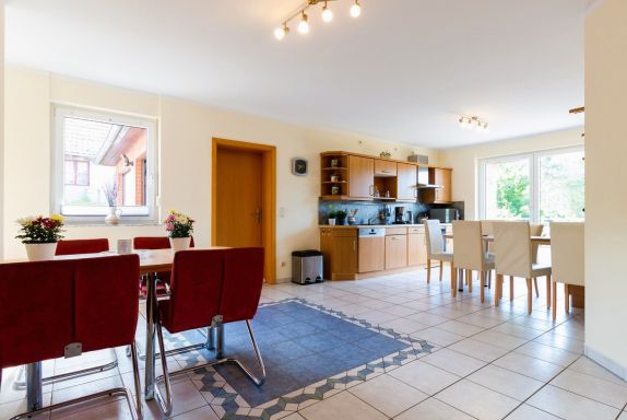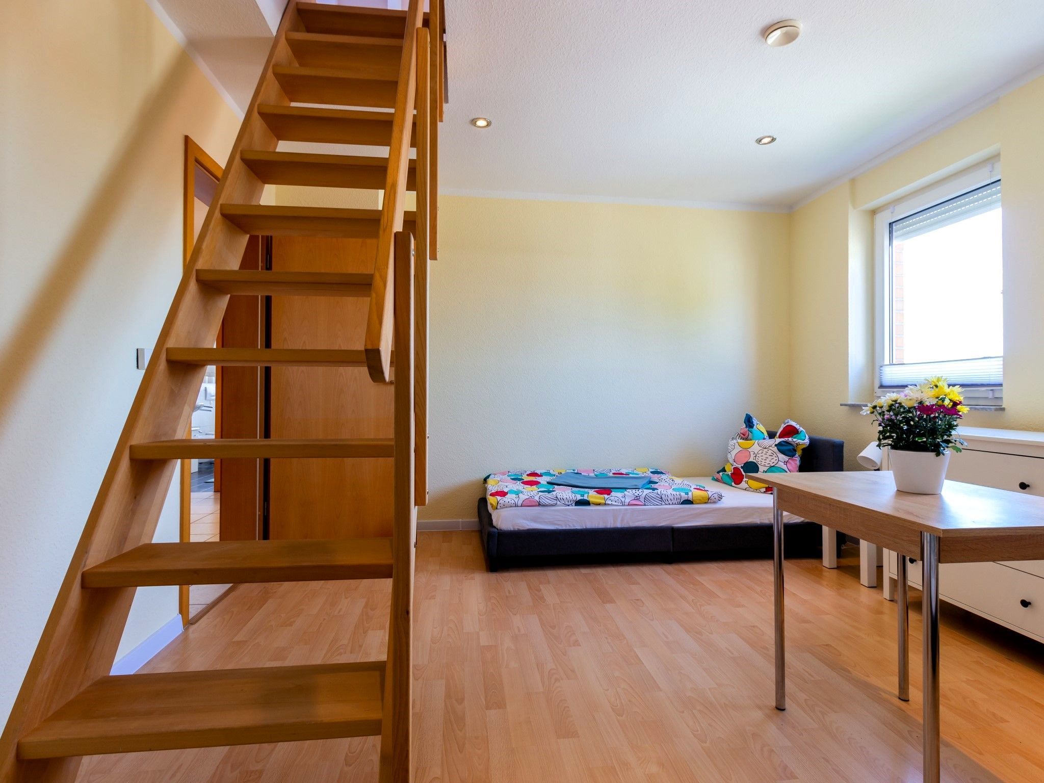Die Wohnung bietet ein großes Wohnzimmer und eine vollausgestattete Küche sowie eine Gästetoilette in der ersten Etage. Von der Küche und vom Wohnzimmer hat man Zugang zum Südbalkon. In der zweiten Etage befinden ein Wohn- und Schlafbereich mit Zugang zur riesigen Terrasse. Des Weiteren befinden sich dort das Vollbad mit Dusche und Badewanne sowie drei Schlafzimmer mit insgesamt vier Einzelbetten und einem Doppelbett (160 x 200cm). Die Terrasse sowie der riesige Balkon sind Richtung Süden ausgerichtet und bieten einen sonnigen und grünen Blick bis über die anderen Häuser hinweg. Sie laden zum Verweilen beim Sonnenuntergang ein. Ein Garagenstellplatz mit direktem Zugang zur Wohnung und ein zusätzlicher PKW-Stellplatz sind auf dem Grundstück vorhanden.