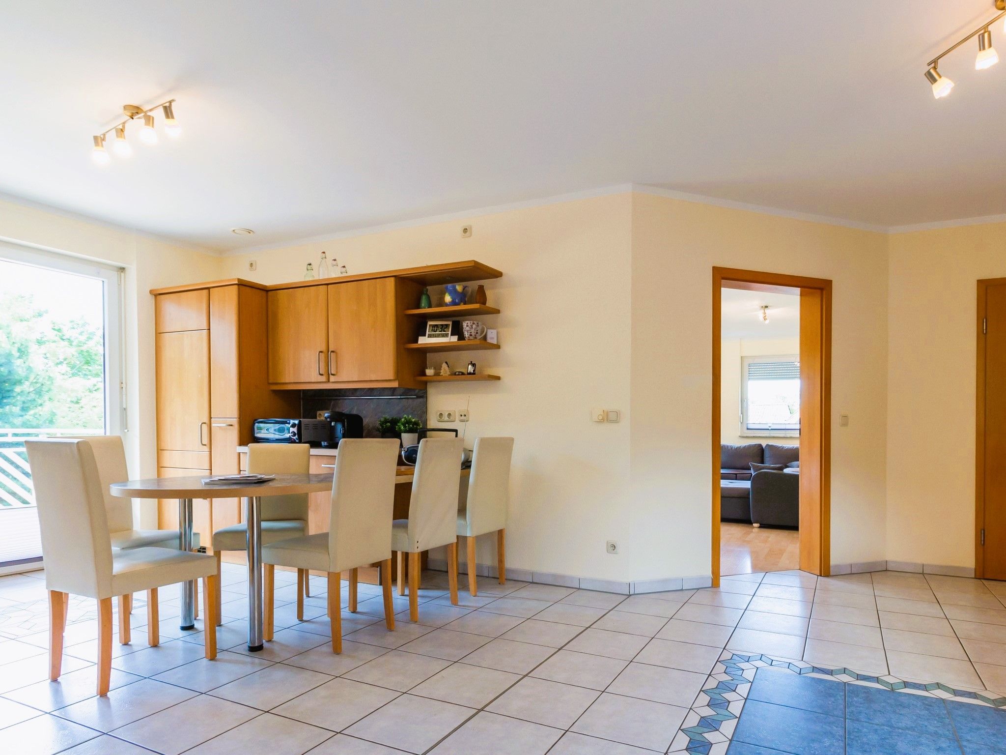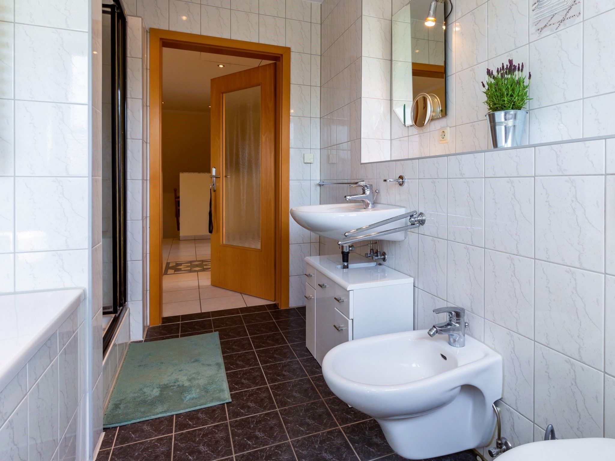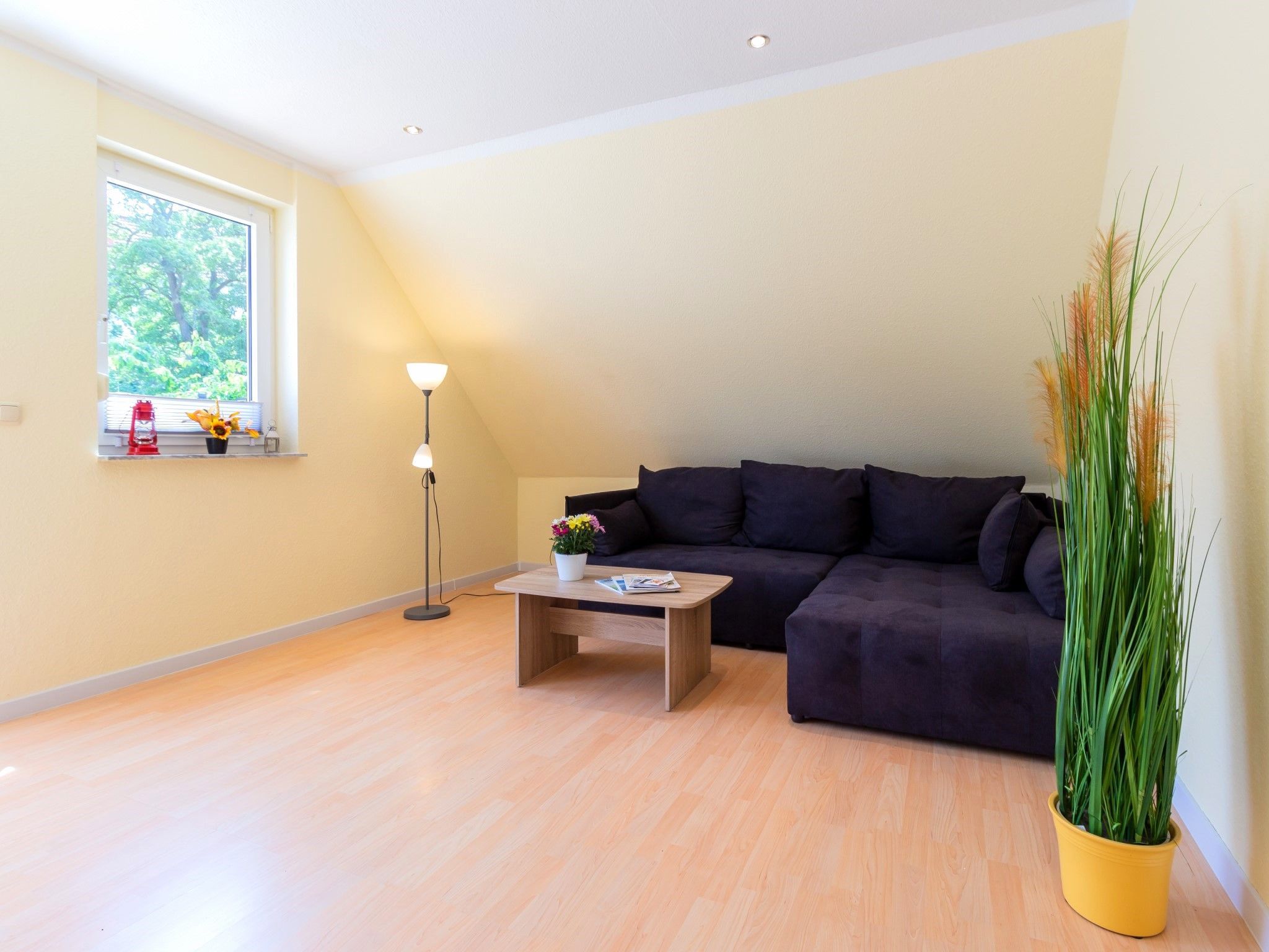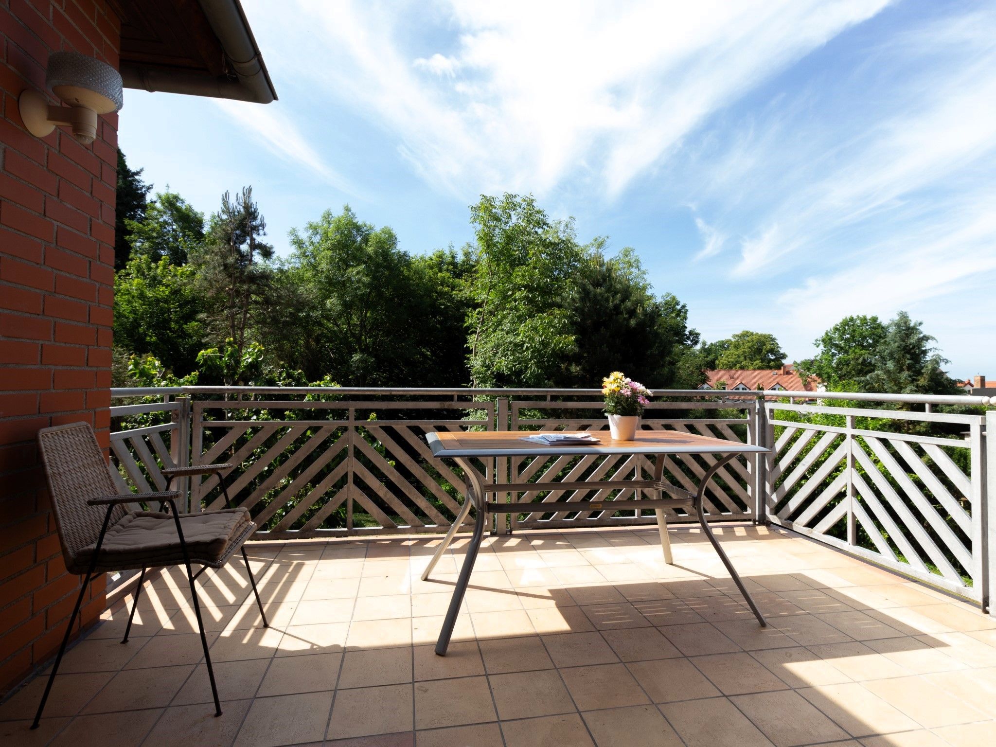 Die Wohnung bietet ein großes Wohnzimmer und eine vollausgestattete Küche sowie eine Gästetoilette in der ersten Etage. Von der Küche und vom Wohnzimmer hat man Zugang zum Südbalkon. In der zweiten Etage befinden ein Wohn- und Schlafbereich mit Zugang zur riesigen Terrasse. Des Weiteren befinden sich dort das Vollbad mit Dusche und Badewanne sowie drei Schlafzimmer mit insgesamt vier Einzelbetten und einem Doppelbett (160 x 200cm). Die Terrasse sowie der riesige Balkon sind Richtung Süden ausgerichtet und bieten einen sonnigen und grünen Blick bis über die anderen Häuser hinweg. Sie laden zum Verweilen beim Sonnenuntergang ein. Ein Garagenstellplatz mit direktem Zugang zur Wohnung und ein zusätzlicher PKW-Stellplatz sind auf dem Grundstück vorhanden.