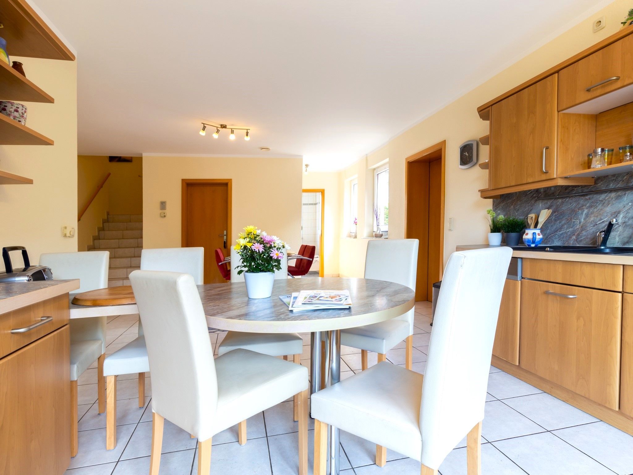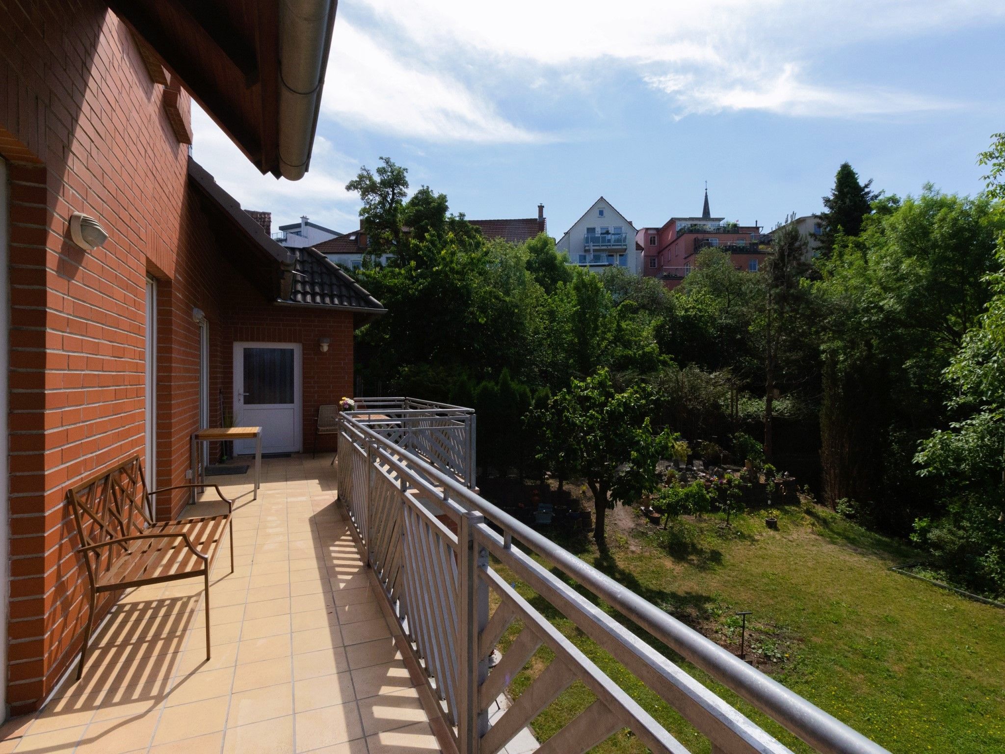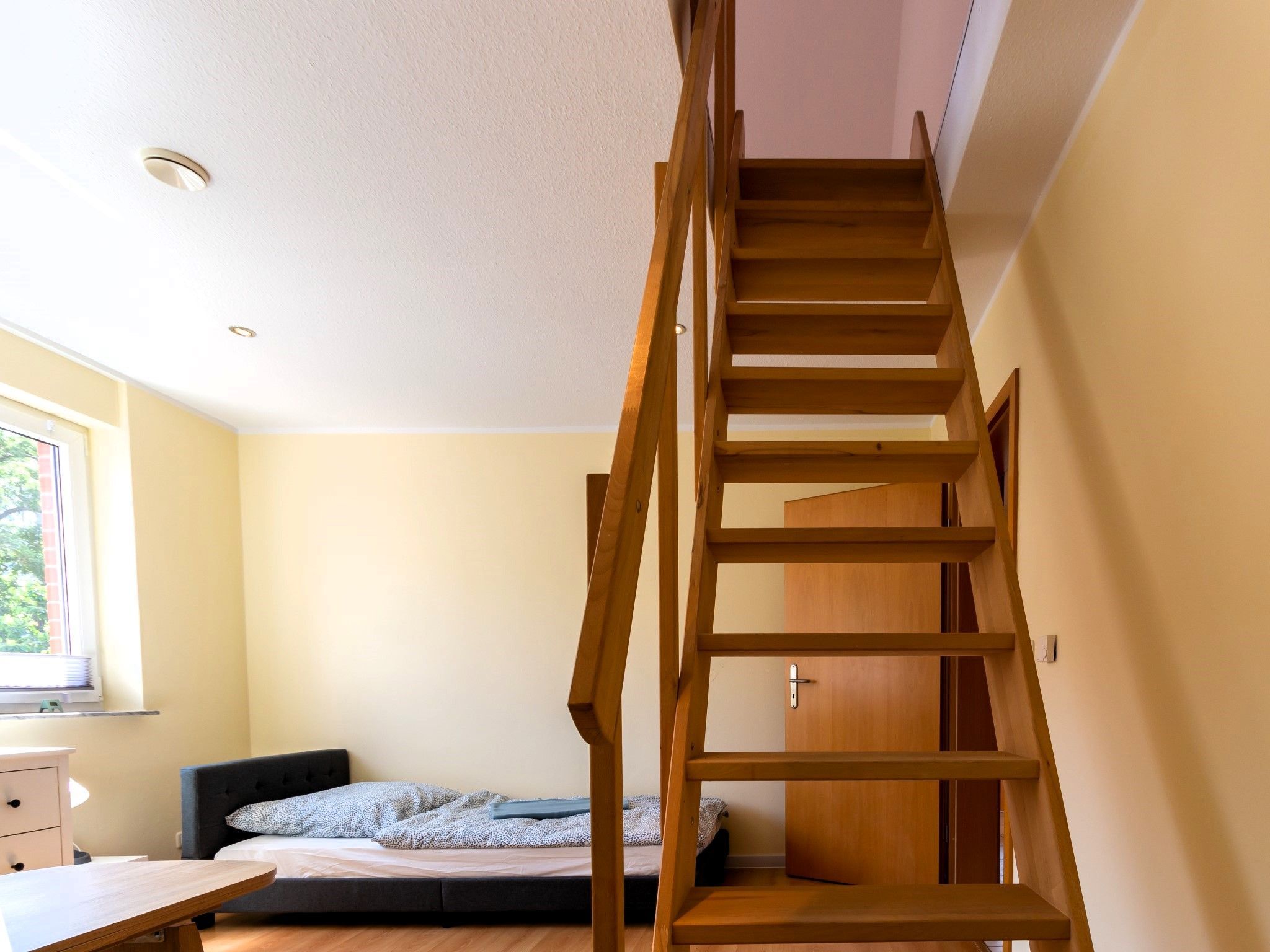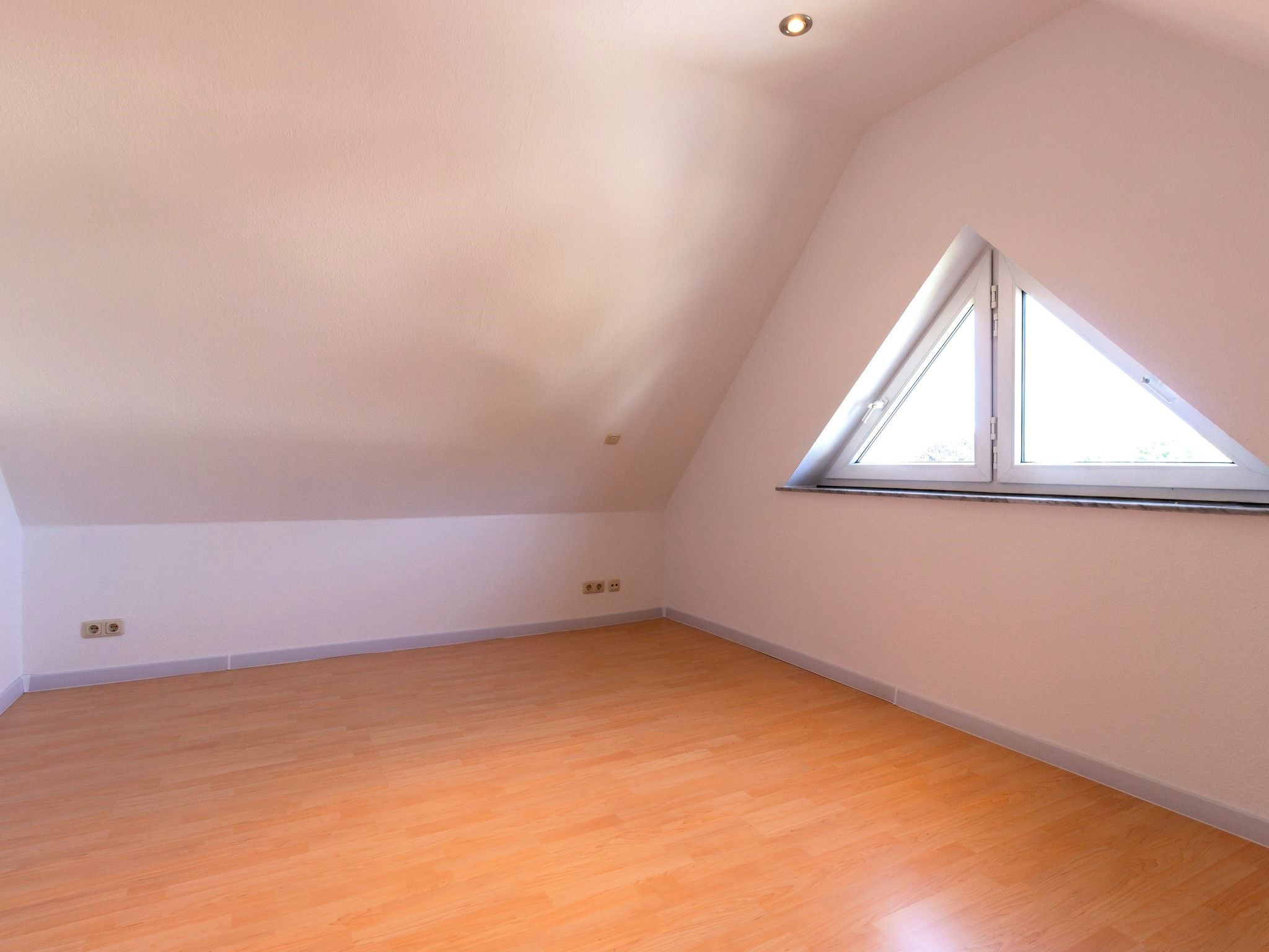 Die weitläufige Wohnung befindet sich in einem Einfamilienhaus. Sie erstreckt sich über die komplette erste und zweite Etage des Hauses. Die Einliegerwohnung im Erdgeschoss ist bewohnt.