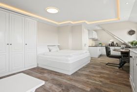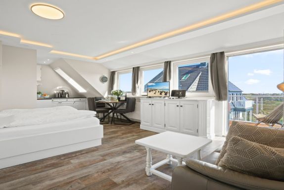 Atemberaubender Meerblick aus einer hellen 1-Zimmer-Suite mit offen abgetrennter Pantry-Küche. Diese gemütliche Suite bietet Ihnen neben dem tollen Meerblick auch einen malerischen Fern-Blick über die Dünenlandschaft bis hin zum charmanten Ortszentrum von Hörnum und auf den Leuchtturm. Mit einem großem Doppel-Bett mit luxuriösen Geltopper-Komfortmatratzen und stilvollen Tischlermöbeln ausgestattet bietet die Suite viel Platz für einen entspannten Aufenthalt für 2 Personen.