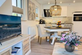 In der modernen Küche bereiten Sie ganz bequem kleine Köstlichkeiten zu, während das komfortable Boxspringbett im Schlafzimmer für erholsamen Schlaf sorgt – begleitet vom sanften Rauschen des Meeres in der Ferne.