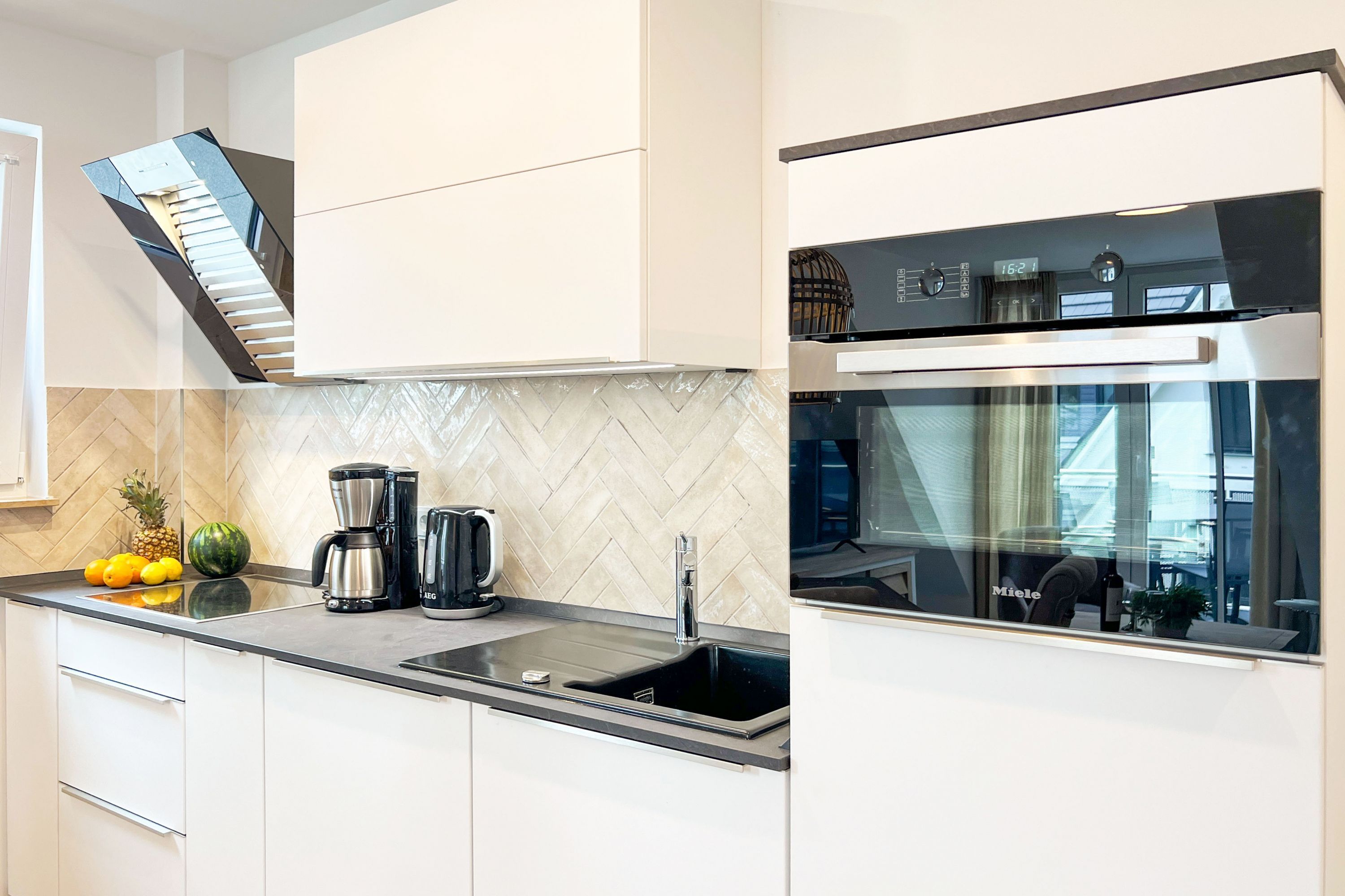 • Voll ausgestattete Küchenzeile mit Backofen, Kochfeld, Kühlschrank, Spülmaschine, Toaster, Wasserkocher und Filterkaffeemaschine