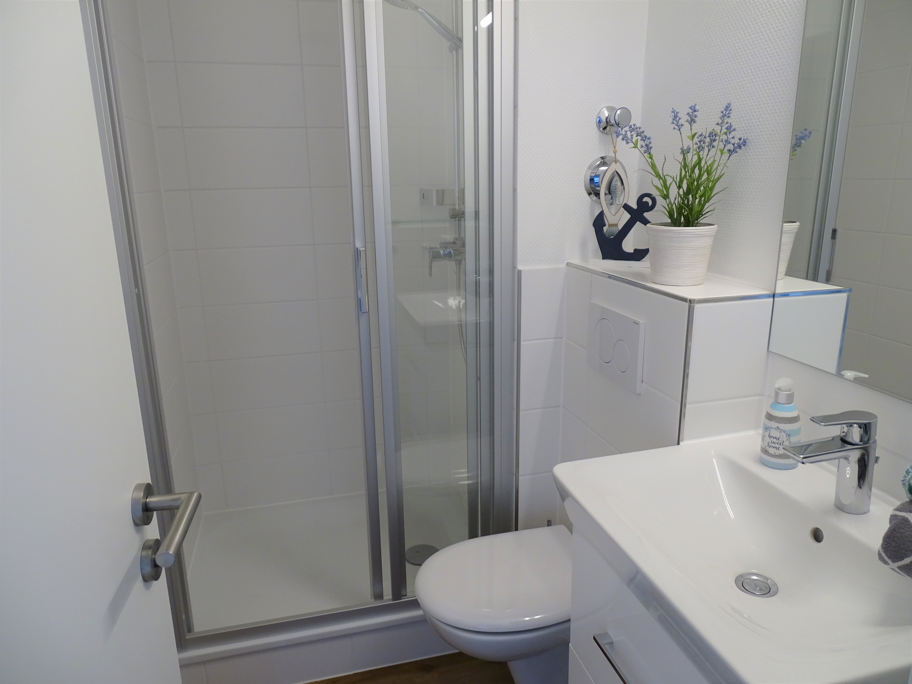 Im Duschbad gibt es neben der Handtuchtrockner-Heizung, einen Schrank, Regale und einen Föhn.