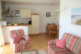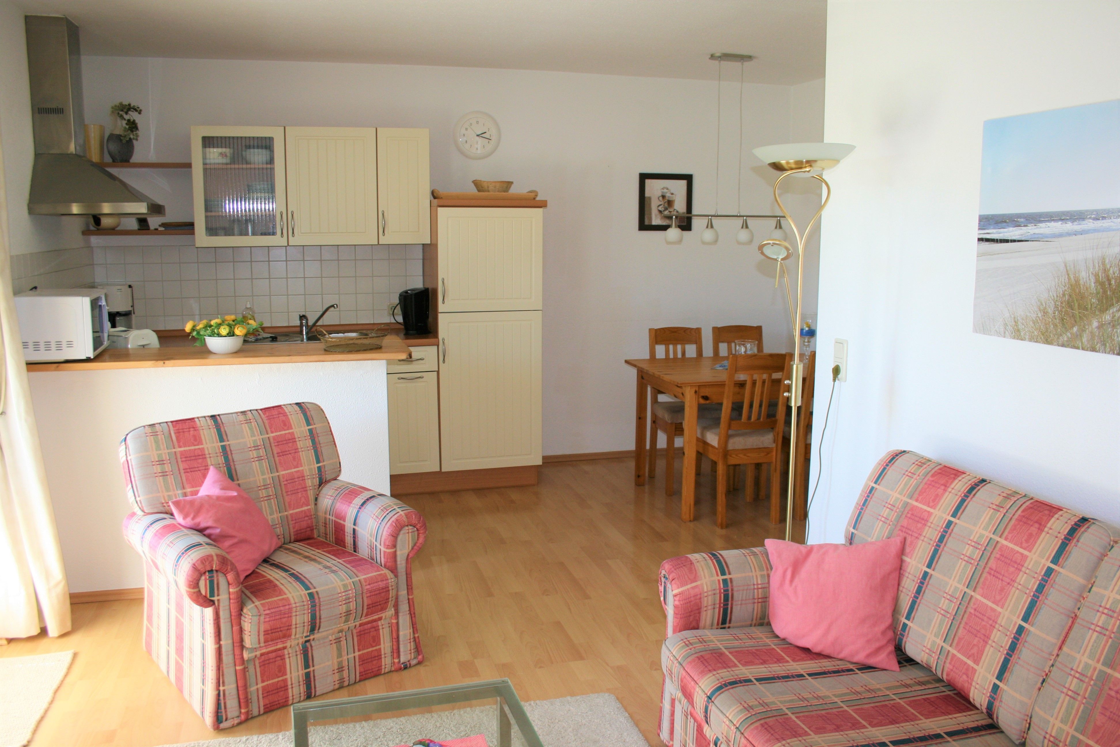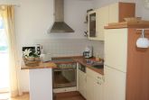 Im großzügigen Wohnzimmer mit einem gemütlichen Sofa und einem Sessel ist neben einer Essecke, einem Netflix-fähigem Sat-Flachbild-TV und einer Stereoanlage auch eine gut eingerichtete Einbauküche integriert. Sie ist mit Kühl-/Gefrierkombination, Geschirrspüler, Herd mit Cerankochfeld, Backofen und Mikrowelle ausgestattet. Alle üblichen Geschirr- und Küchenutensilien sind vorhanden. Der Balkon ist nach Süden ausgerichtet und lädt zum Sonnenbaden und Frühstücken ein.
