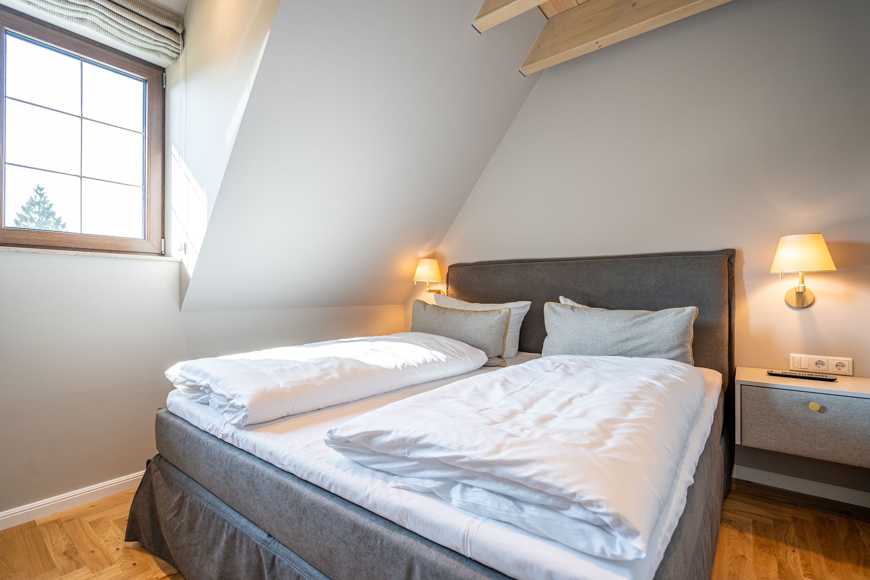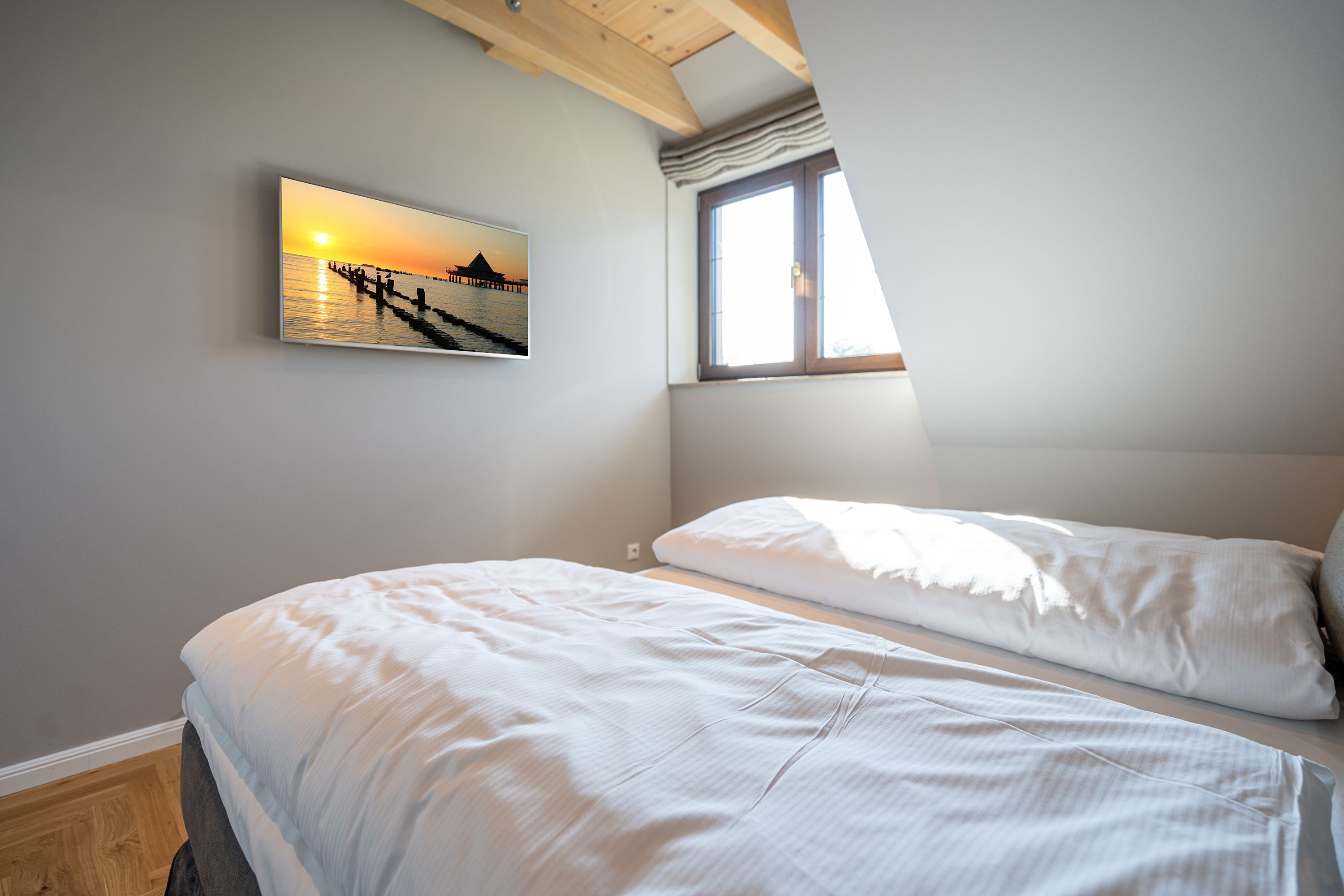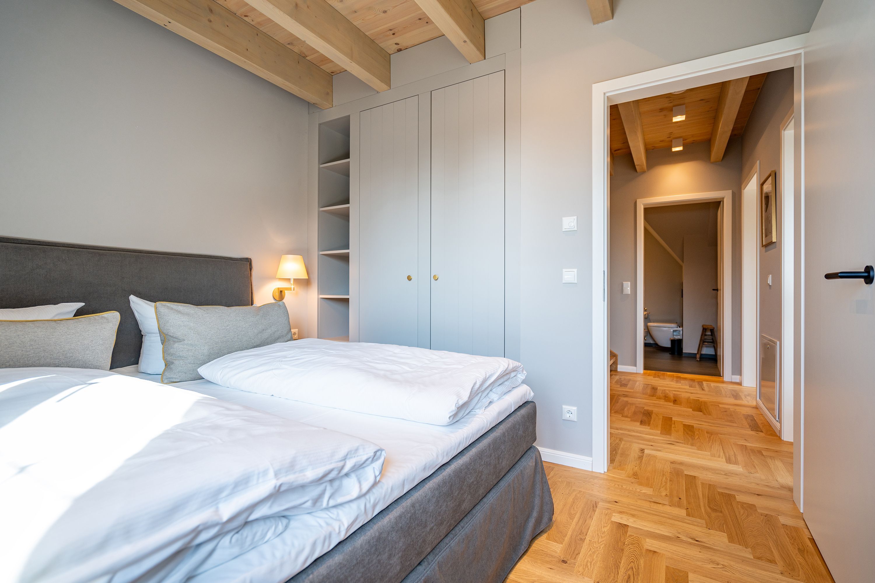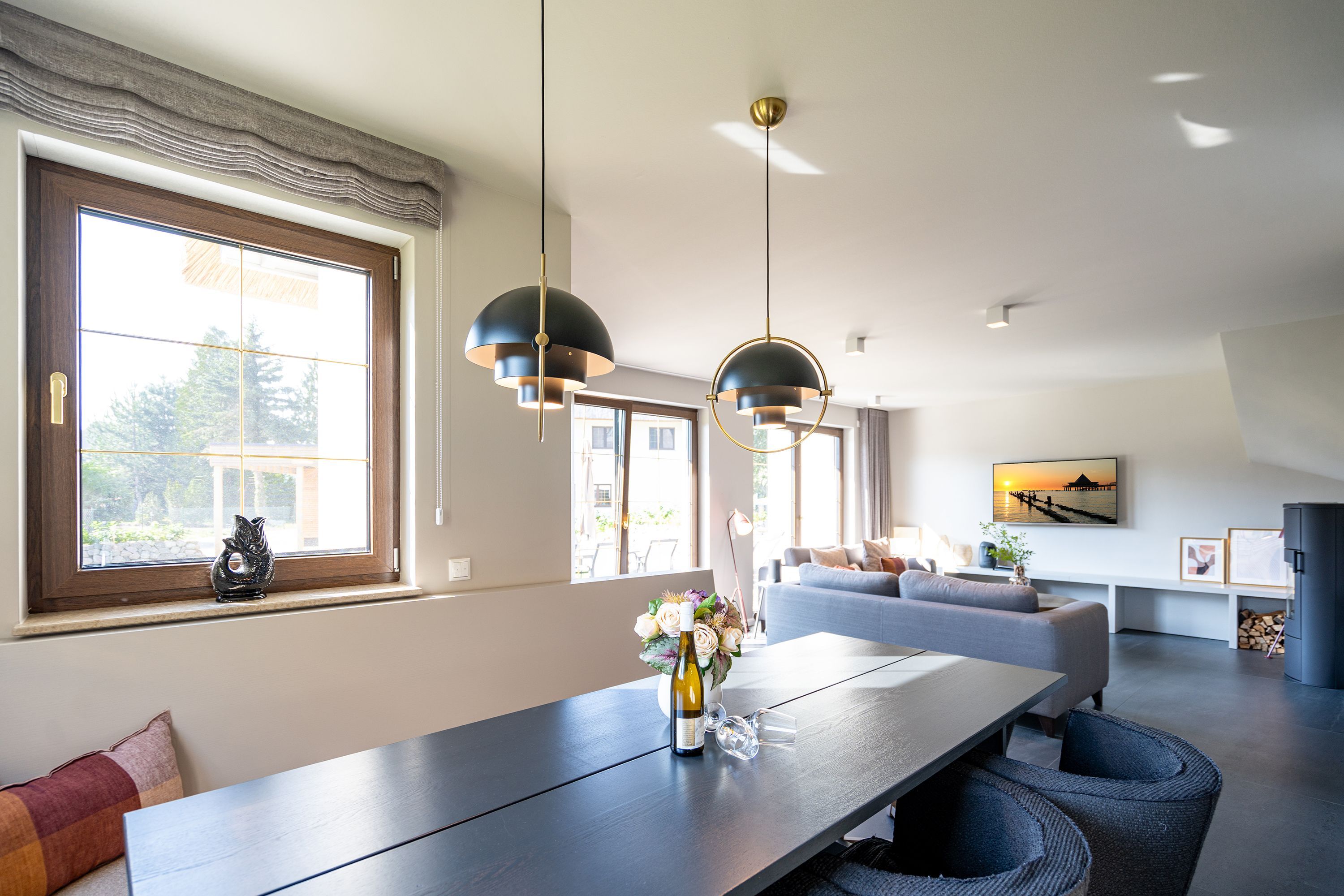 Gemütlich, stilvoll und großzügig - sind die richtigen Attribute für das Ferienhaus Reet & Meer N° 4. Auf den insgesamt 129 Quadratmetern und drei Etagen haben bis zu 8 Personen Platz für einen erholsamen Urlaub auf der Sonneninsel Usedom. Die Sonne können Sie auch von Ihrer großzügigen Terrasse oder vom Garten aus genießen. Hierfür stehen Ihnen zwei Sonnenliegen zur Verfügung. Ein großer Esstisch mit Sitzmöglichkeiten für bis zu 8 Personen befindet sich hier ebenfalls und lässt ein Frühstück unter freiem Himmel wahr werden. Die von Innenarchitekten konzipierte Einrichtung zieht sich wie ein roter Faden durch alle Etagen. Ein besonderes Augenmerk wurde auf die Gemütlichkeit gelegt. Der Wohn-Essbereich mit seinen komfortablen Sitzlandschaften und einer zusätzlichen Bank laden zum gemeinsamen Verweilen mit der Familie oder Freunden ein. Ein Flat-TV sowie ein Holzkamin bringen auch an kühleren Abenden Abwechslung in Ihren Urlaub. Keine Wünsche beim Zubereiten Ihrer Speisen lässt die angrenzende Küche offen. Bei einem gemeinsamen Glas Wein lässt es sich ganz wunderbar miteinander Kochen. Für lange Spieleabende oder Gesprächsrunden eignet sich der große Holztisch mit seiner Sitzbank und den bequemen Armlehnstühlen. Selbstverständlich haben Sie von hier aus einen Zugang zum Außengelände. Ein Masterbad mit Finnischer Sauna darf im Erdgeschoss ebenfalls nicht fehlen. Mit Dusche, Waschtisch und WC ausgestattet, können Sie hier nicht nur im Winter wohlige Stunden verbringen. Eine Etage höher befinden sich drei von insgesamt vier Schlafzimmern, die alle mit Boxspringbetten (1,80m x 2,00m) ausgestattet sind. Erholsamer Schlaf garantiert. Besonderen Charme versprühen die offen gehaltenen Dachbalken und der schöne Parkettboden mit Fischgrätmuster. Zwei Schlafzimmer verfügen zusätzlich über einen Flat-TV und einen gemeinsamen Zugang zu einem kleinen Balkon. Ausreichend Schrankraum (beleuchtet) für Ihre Urlaubsgarderobe steht Ihnen in allen Zimmern zur Verfügung. Ein weiteres Badezimmer mit begehbarer Dusche, Waschtisch und WC rundet diese Etage ab. Unter dem Dach geht es ebenfalls gemütlich her: Ein Schlafzimmer mit Boxspringbett (1,60m x 2,00m) sowie ein Flat-TV und ein separates Gäste-WC stehen Ihnen unter dem Dach zur Verfügung. Ein Gaubenfenster (aktuell noch ohne Verdunklungsmöglichkeit) rundet das vierte Schlafzimmer ab. Für Ihren Komfort sind die Betten bei Anreise bezogen und Handtücher liegen für Sie bereit. Zudem befinden sich unter dem Carport zwei PKW-Stellplätze am Haus N° 4 sowie ein Schuppen für Ihre Fahrräder. Ein Waschtrockner sowie kostenfreies W-Lan runden dieses Urlaubsdomizil ab.