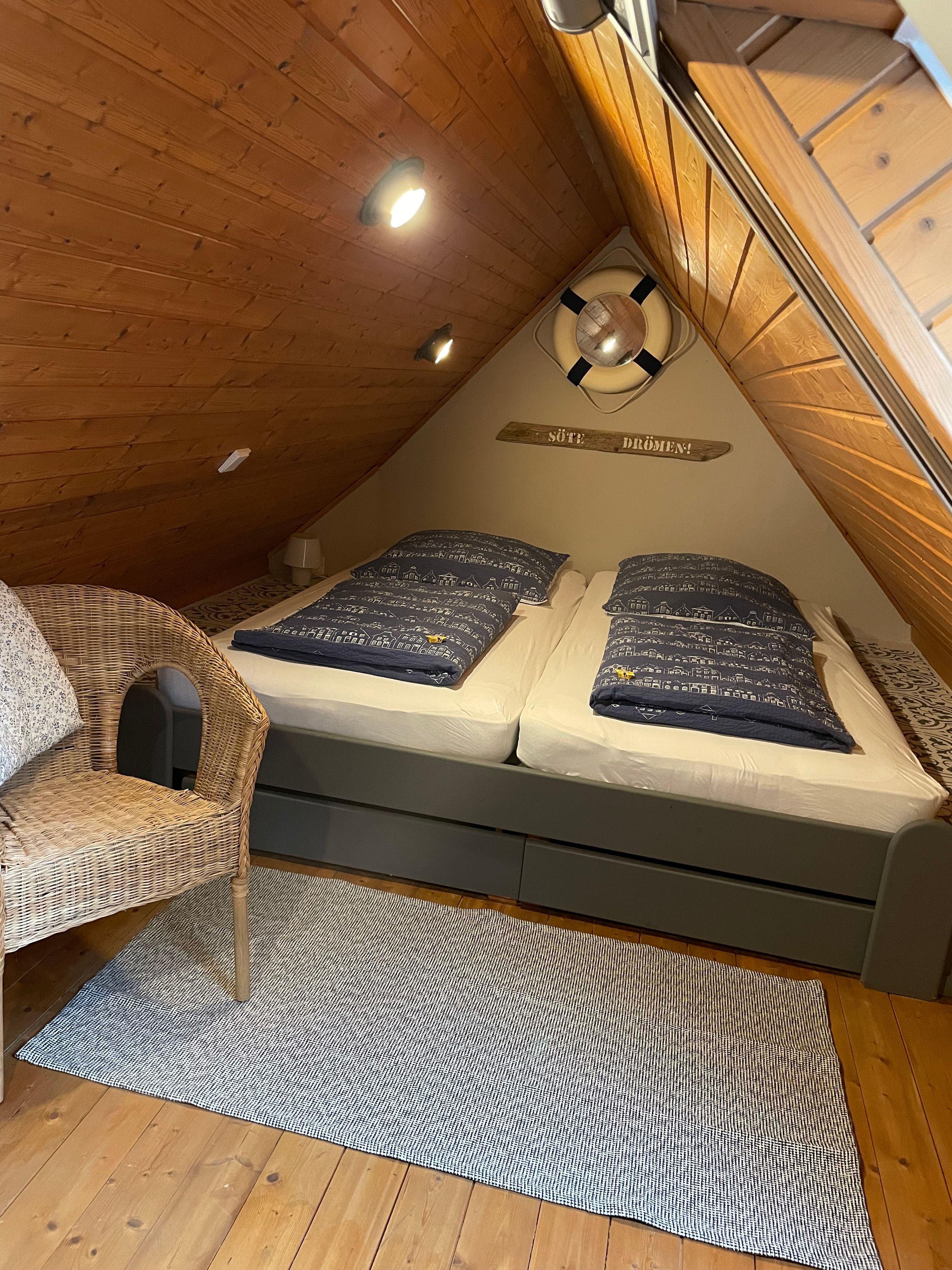 Bei unseren Gästen sehr beliebt ist unser Ferienhaus Uns Huuske. Dieses schnuckelige Häuschen bietet Ihnen auf 2 Etagen alles, was Sie für Ihren Wohlfühl-Urlaub benötigen: kleine Küchenecke, Dusche mit WC im Erdgeschoss, Wohnzimmer mit Couch Sat-Farb-TV mit DVD, Radio/CD. Bettwäsche, Handtuchpaket und Endreinigung sind im Preis inbegriffen Über eine Wendeltreppe gelangen Sie in den Schlafraum im Dachgeschoss.
