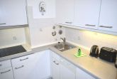 Küche: 4-Zonen-Cerankochfeld, Dunstabzugshaube, Einbauküche, Geschirr, Kaffeemaschine, Kochtöpfe, Kühlschrank mit Gefrierfach, Mikrowelle, Spülmaschine, Toaster, Wasserkocher