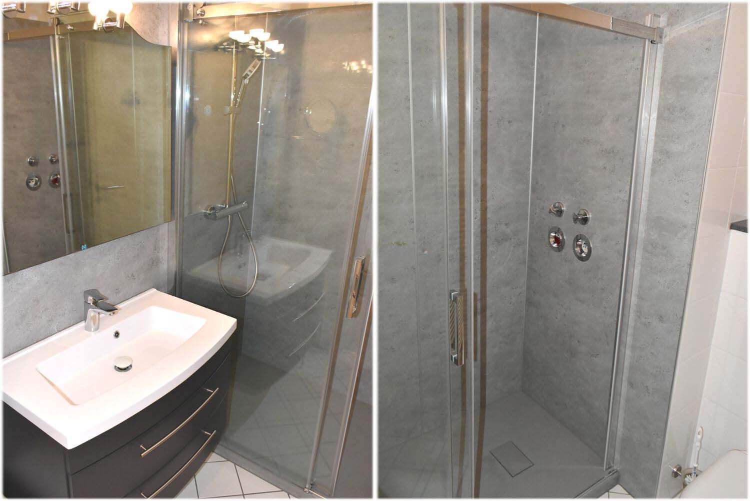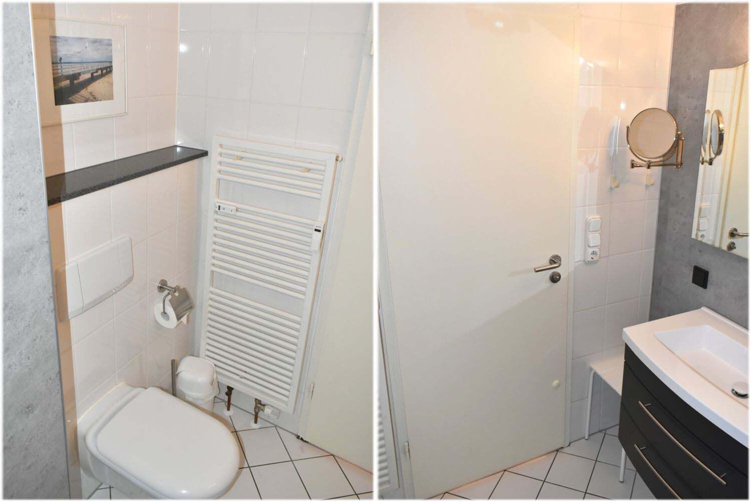 Bad 1: Dusche, Duschkabine, Fön, Handtuchheizung, Kosmetikspiegel, Regal, Regendusche, Spiegel, Waschtisch, WC