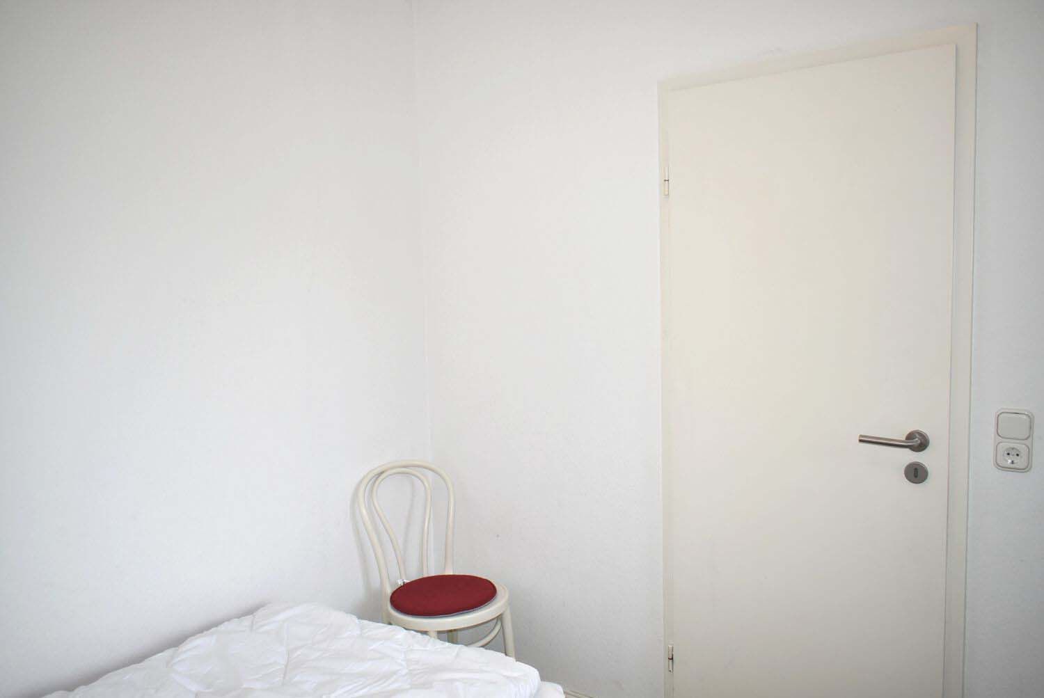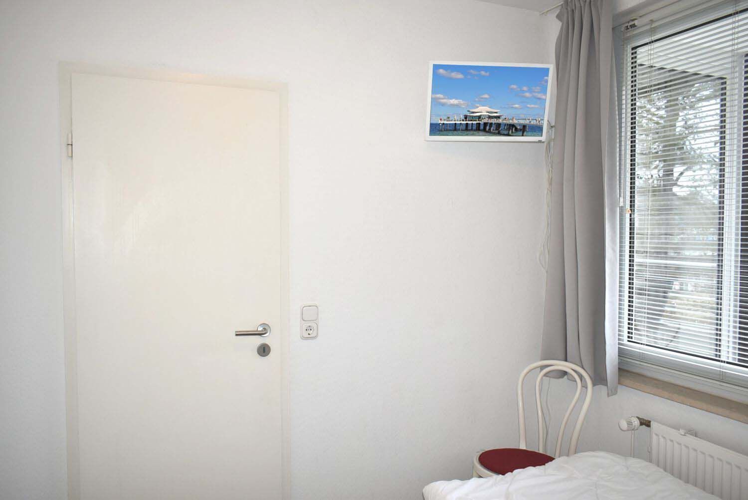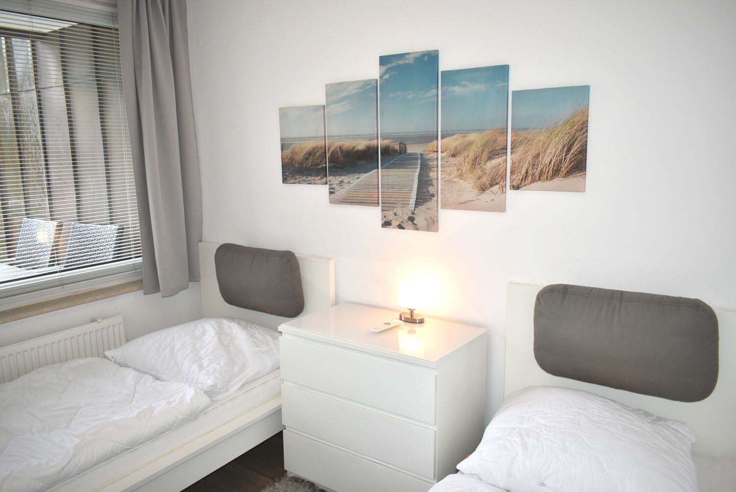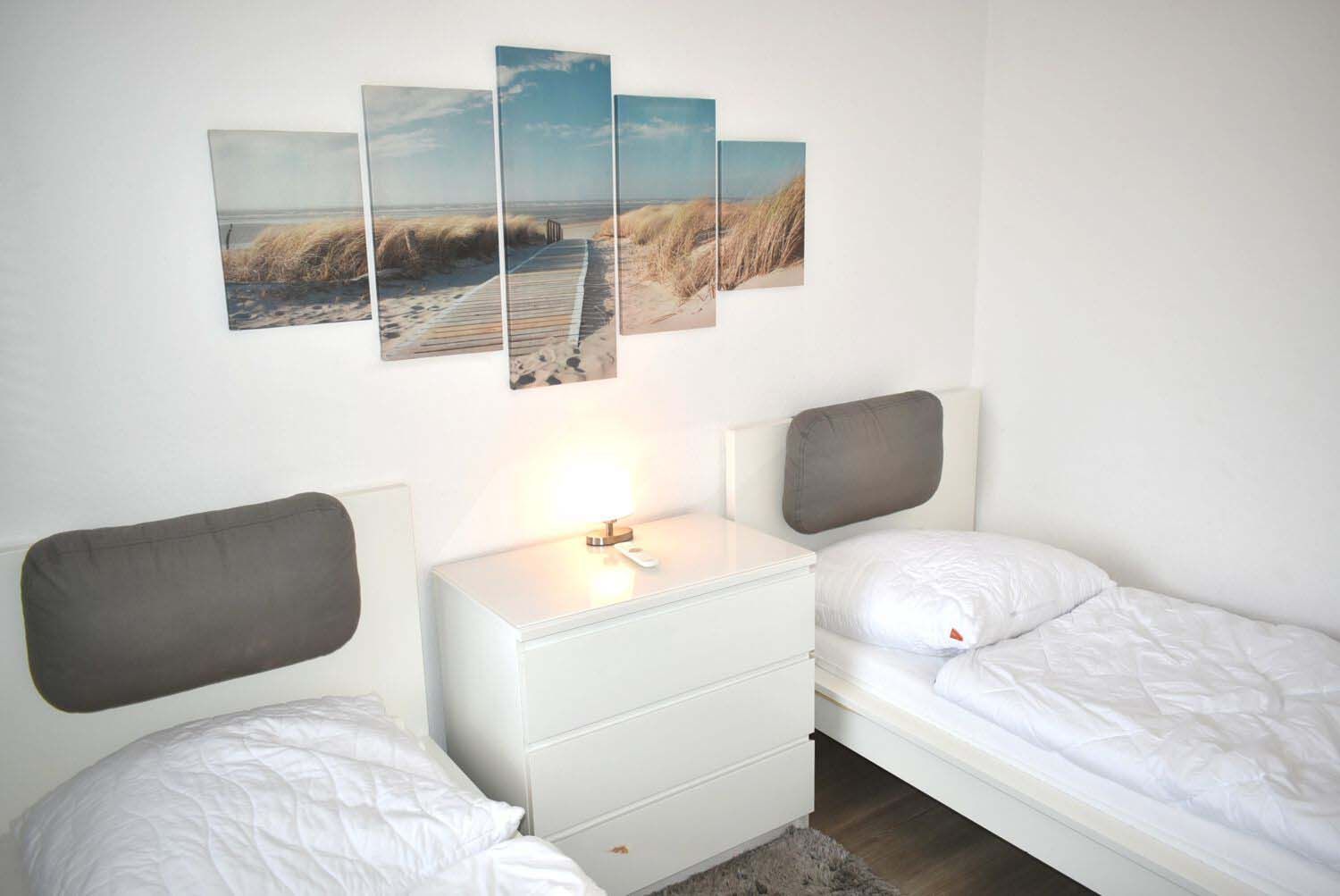 Schlafzimmer 1: 2 Einzelbetten, Kommode, Nachttischlampe, Stuhl, Tischlampe, wandhängender Sat-TV Flachbildschirm, Wecker