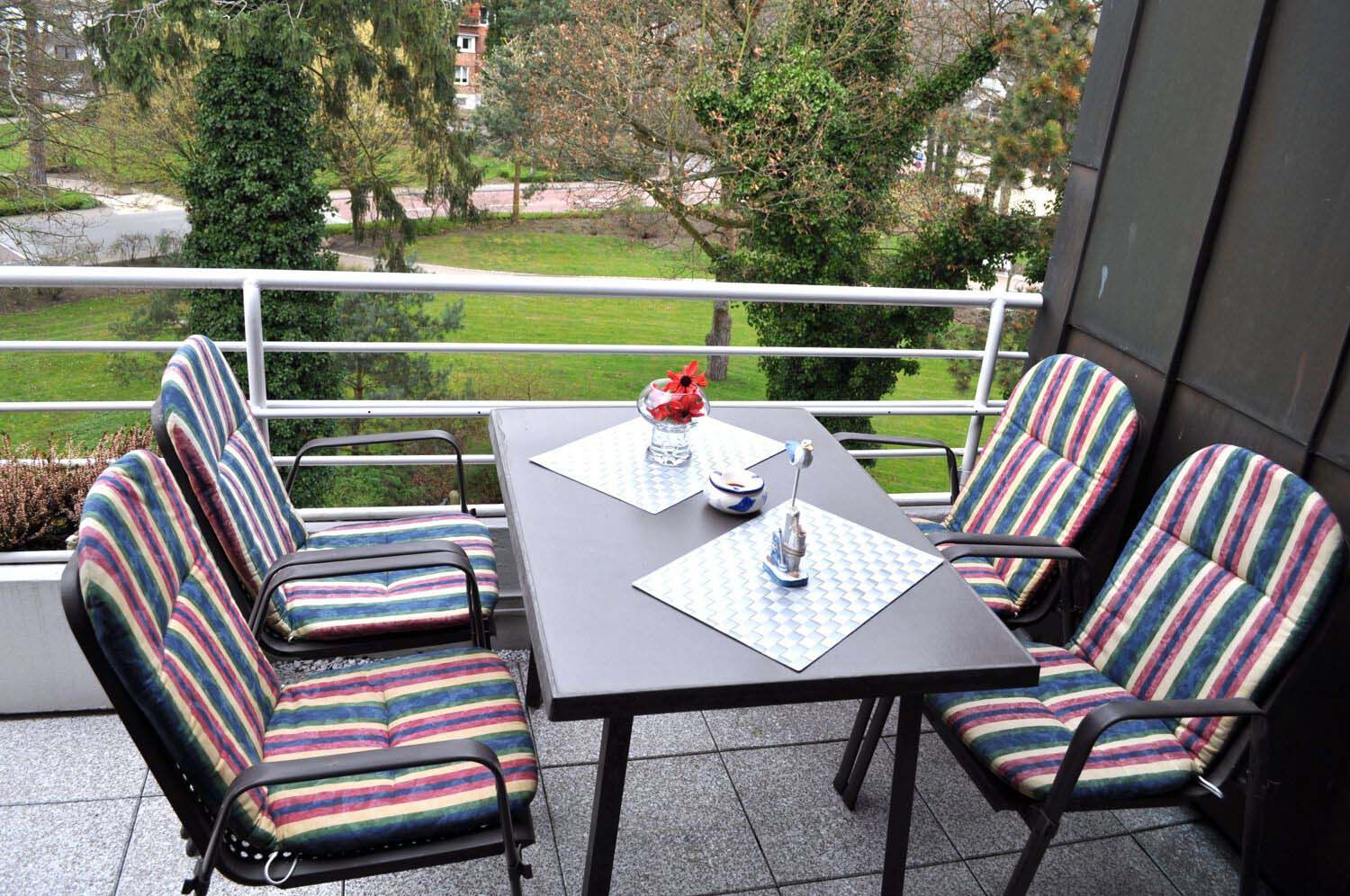 Balkon: 4 Stühle, halb überdacht, Markise, Nord- Westlage, Sichtmöglichkeit vom Balkongeländer seitlich auf die Ostsee, Tisch, Wäscheständer