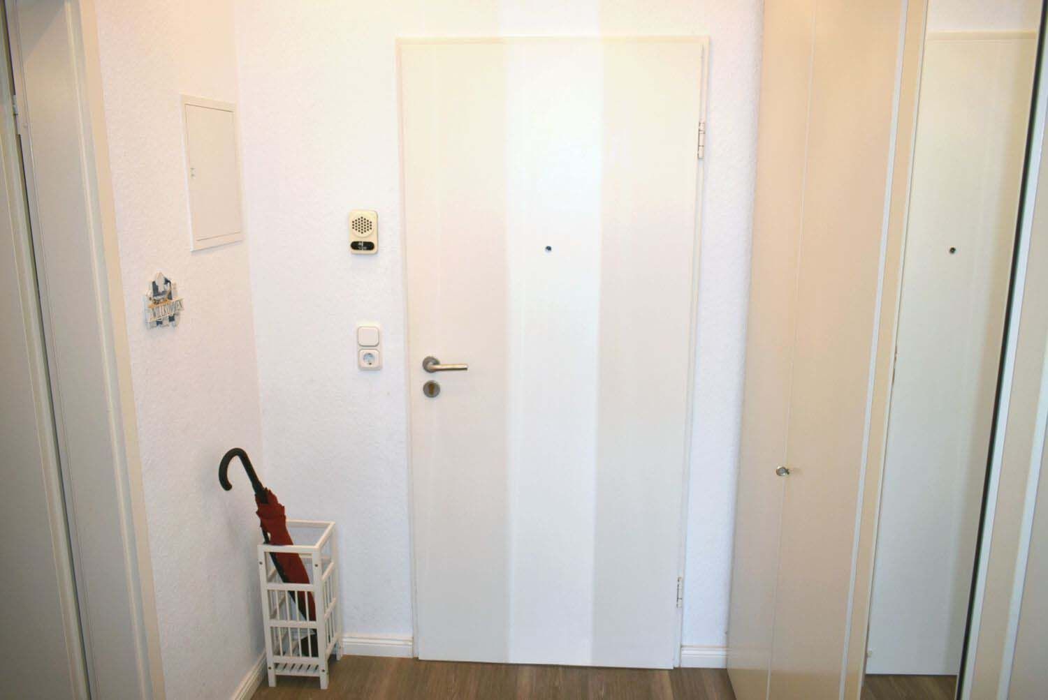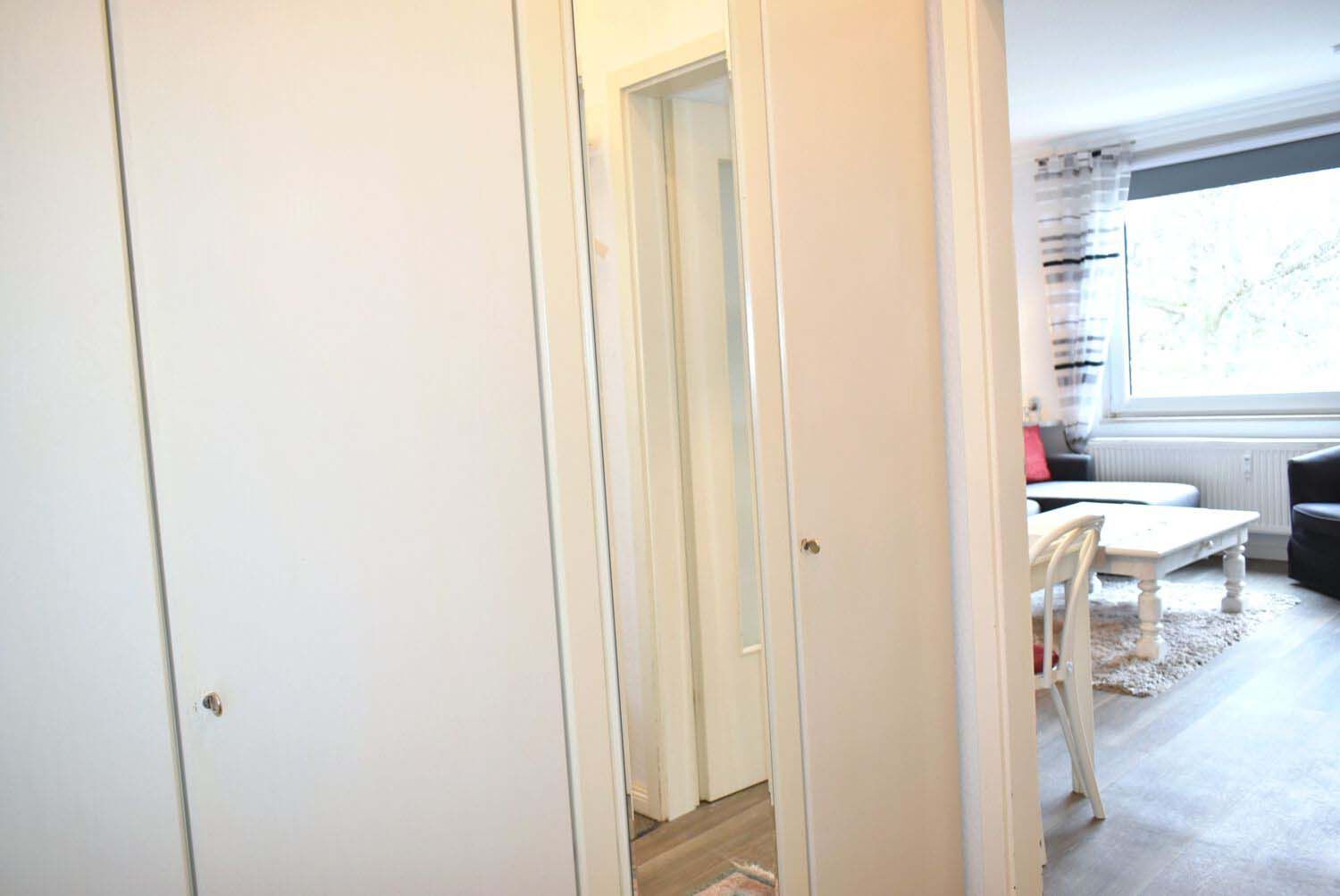 Flur: Einbaukleiderschrank, Garderobe, Schirmständer, Spiegel, Staubsauger