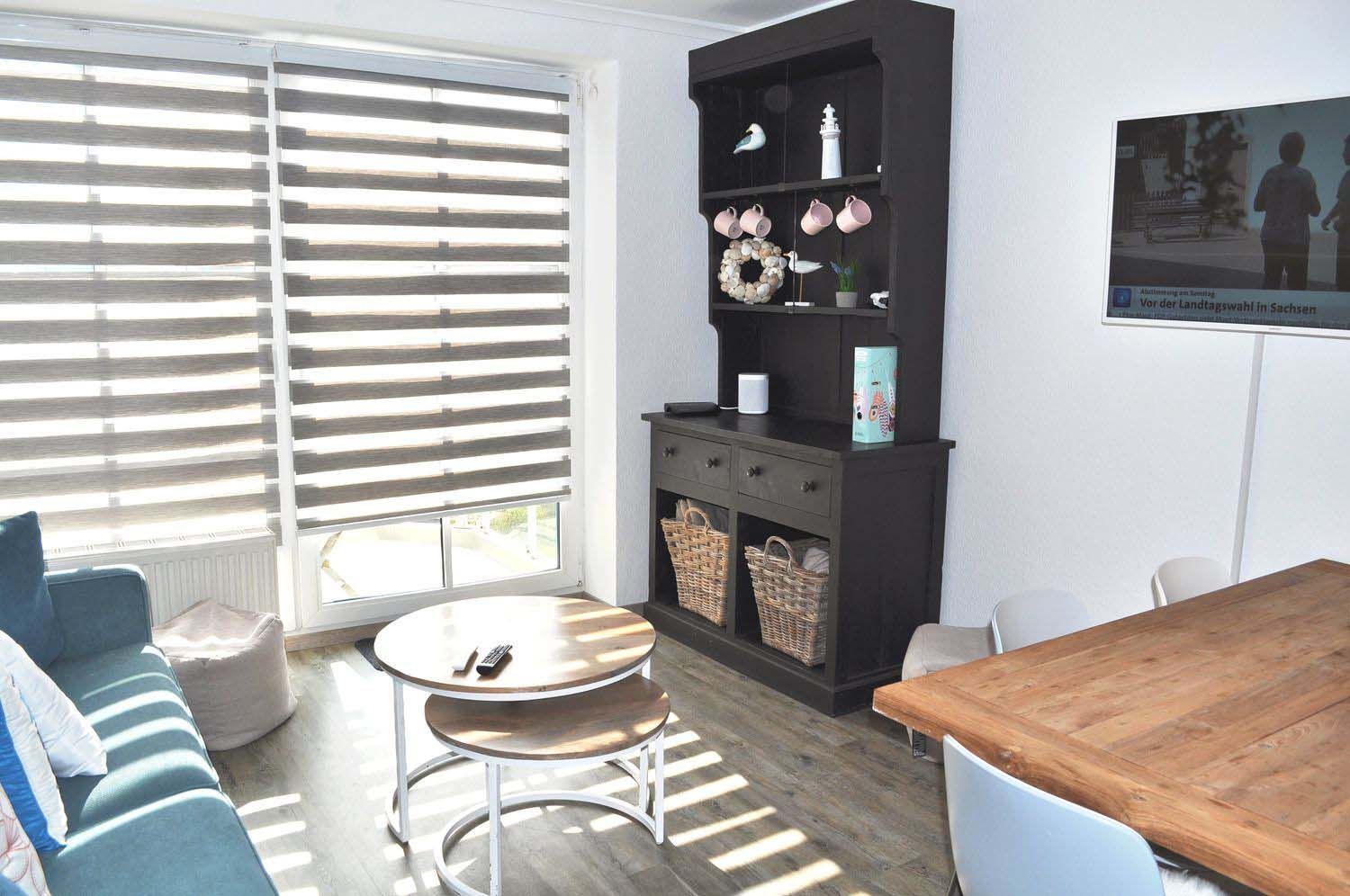 Wohnzimmer: 4 Plattenherd Induktion mit Ceranfeld und Backofen, 4 Stühle, Anrichte, Couchtisch, Dunstabzugshaube, Eierkocher, Einbauküche, Esstisch, Flachbildschirm, Geschirr, Kaffeemaschine, Kochtöpfe, Kühlschrank mit 3* Gefrierfach, Mikrowelle, Nespresso Maschine, Raclette, Regalschrank, Sat-TV, Schlafcouch 1,42 x 1,97 m, Sonos One Lautsprecher, Spülmaschine, Stehlampe, Toaster, Wasserkocher