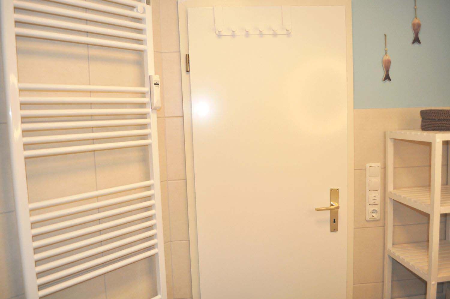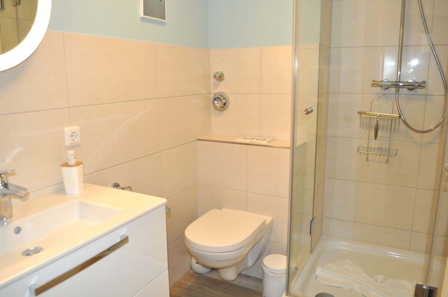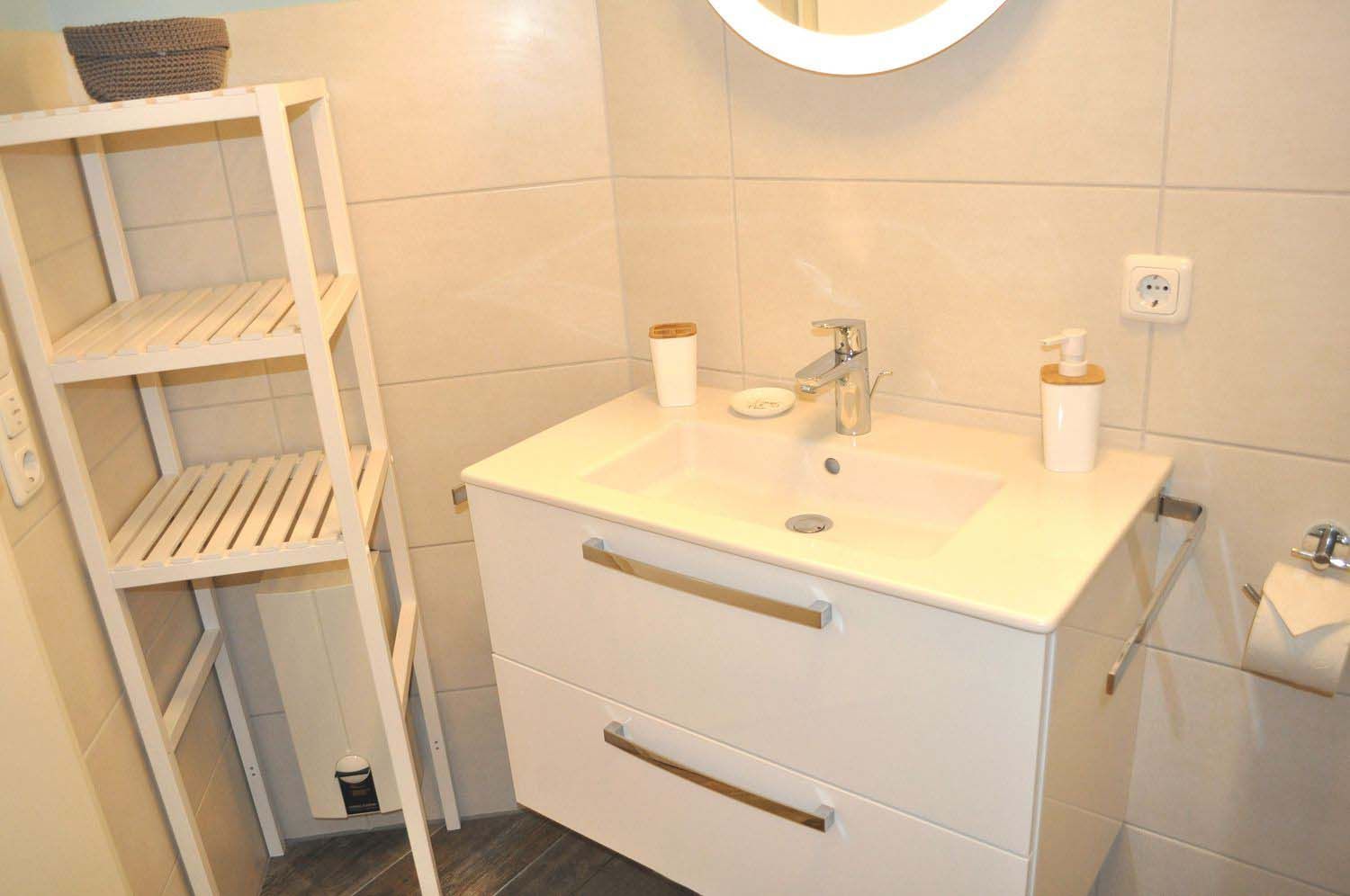 Bad 1: Dusche, Duschkabine, Fön, Handtuchheizung, Regale, Spiegel, Waschtisch, WC