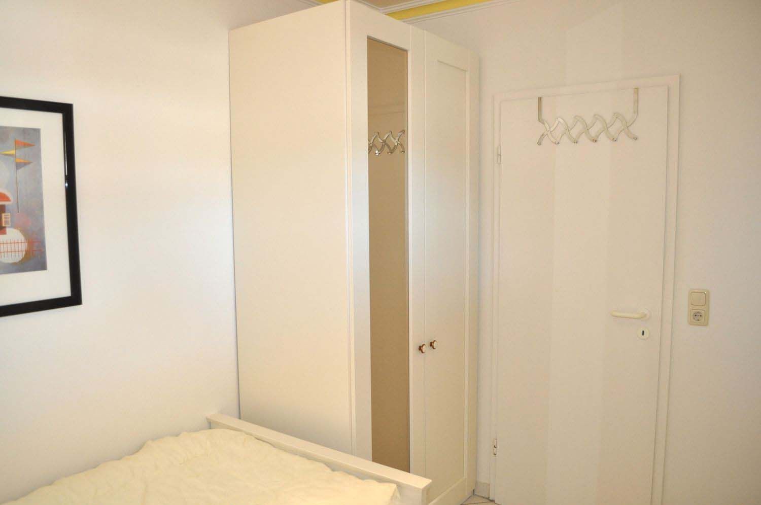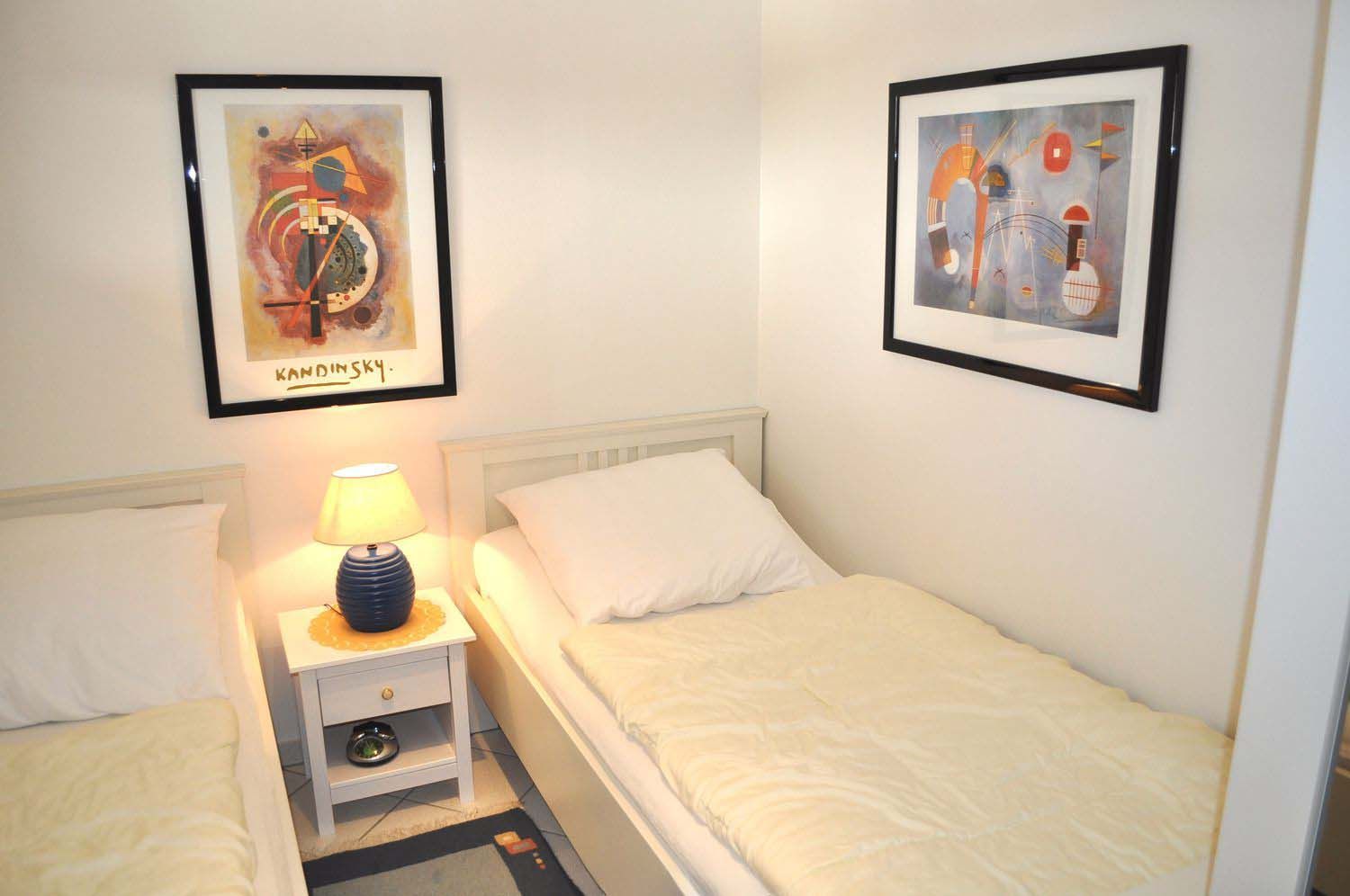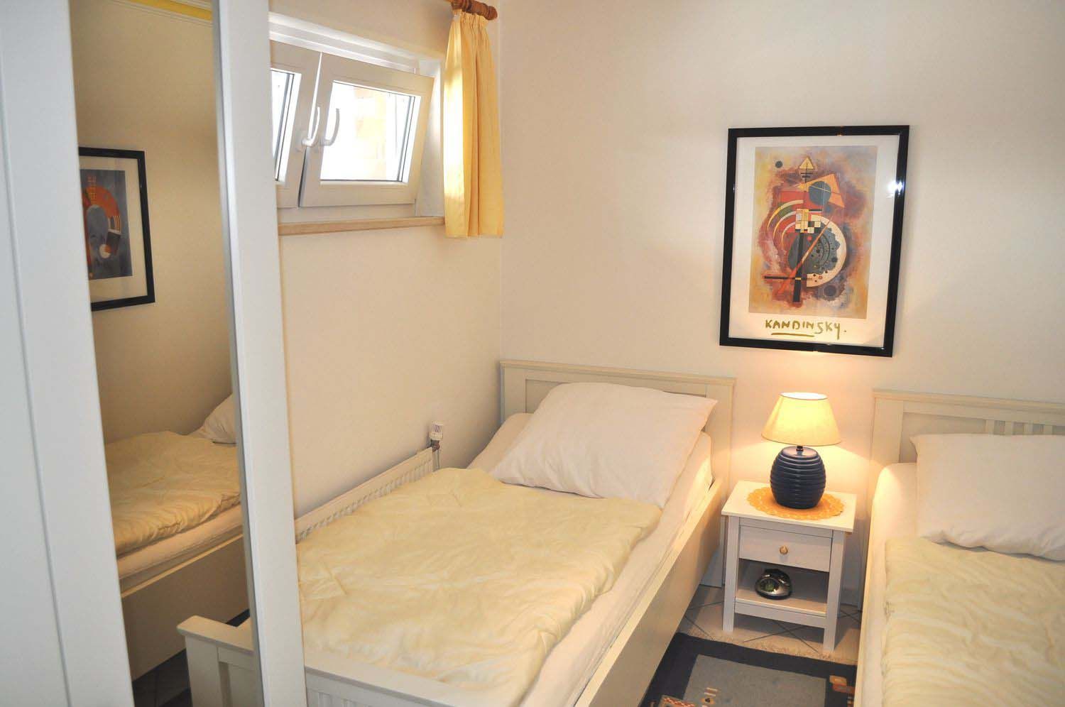 Schlafzimmer 1: 2 Einzelbetten 2,00 x 0,80 m, Kleiderschrank mit Spiegel, Nachttisch, Tischlampe, Wecker