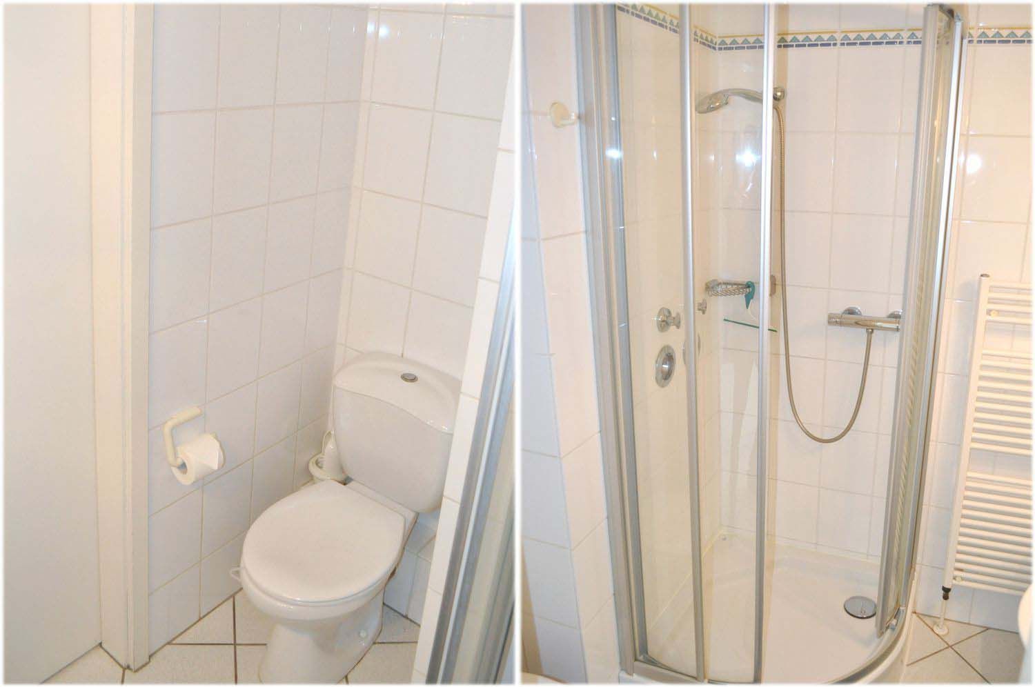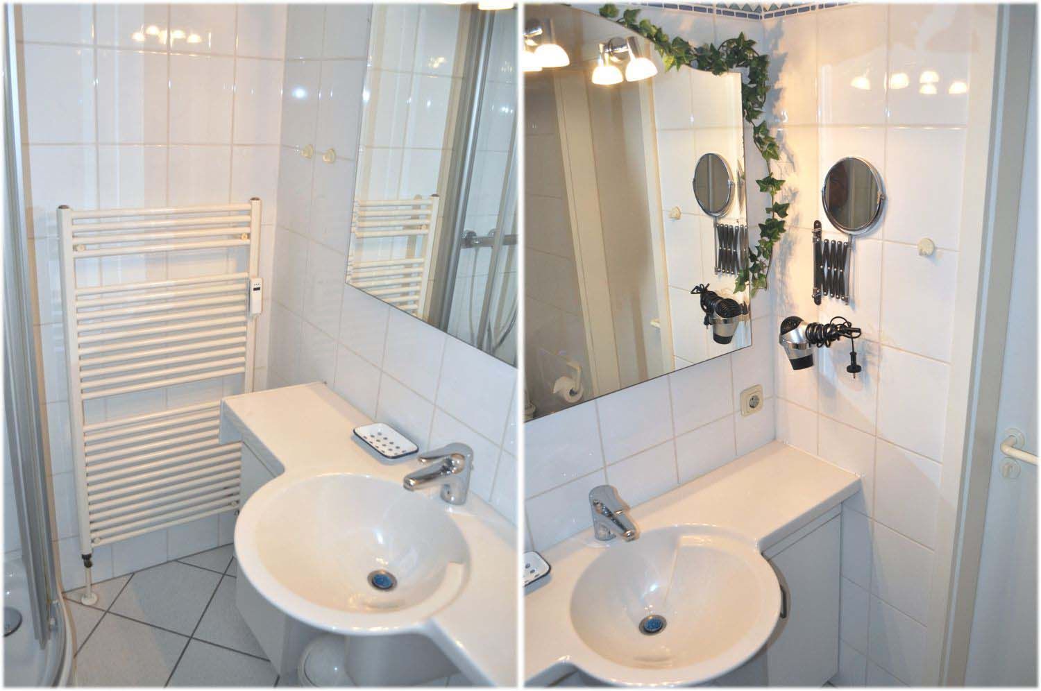 Bad 1: Dusche, Fön, Kosmetikspiegel, Spiegel, Waschbecken, Waschtisch mit Unterschrank, WC