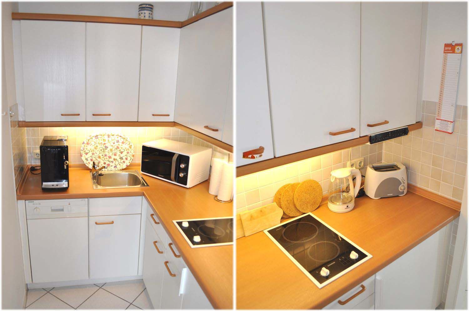 Küche: 2 Plattenherd mit Ceranfeld, Eierkocher, Einbauküche, elektrische Saftpresse, Geschirr, Handmixer, Kaffeemaschine, Kochtöpfe, Kühlschrank mit 3* Gefrierfach, Mikrowelle, Radio, Spülmaschine, Toaster, Wasserkocher