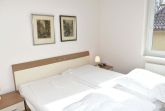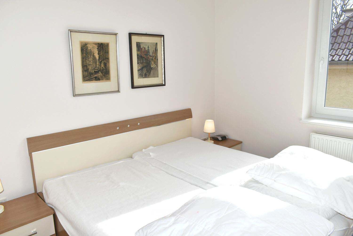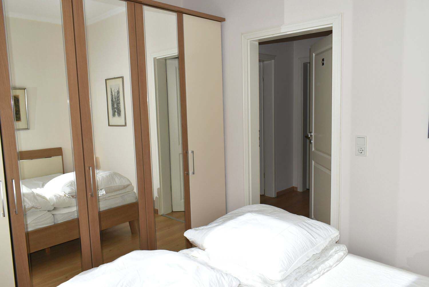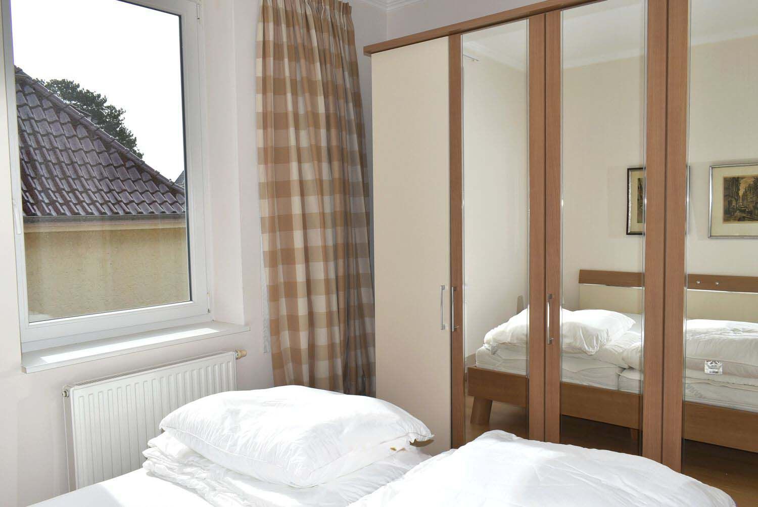 Schlafzimmer 1: 2 Matratzen, 2 Nachttische, Doppelbett 2,00 x 1,80 m, Kleiderschrank, Radiowecker, Spiegel, Verdunklungsstores