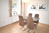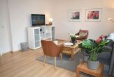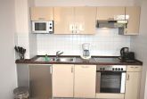 Wohnzimmer: 2 Sessel, 3 Stehlampen, 4 Plattenherd mit Ceranfeld und Backofen, 4 Stühle, Anrichte, Beistelltisch, Couchtisch, Dunstabzugshaube, Esstisch, Flachbildschirm, Geschirr, Kabel-TV, Kaffeemaschine, Kochtöpfe, Küchenzeile, Kühlschrank mit Gefrierfach, Mikrowelle, Schlafcouch, Spülmaschine, Stereoanlage mit CD-Player, Tischlampe, Toaster, Wasserkocher