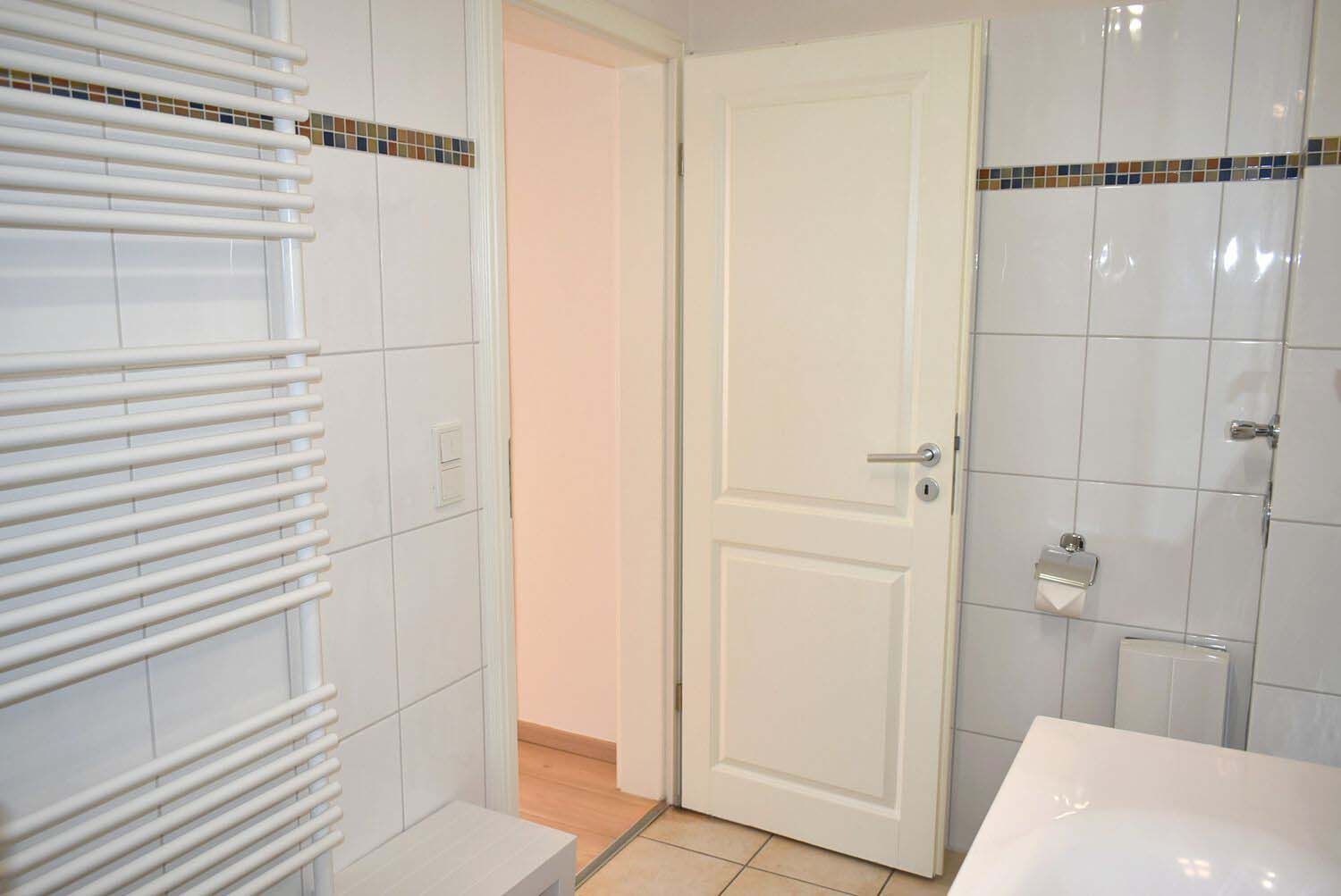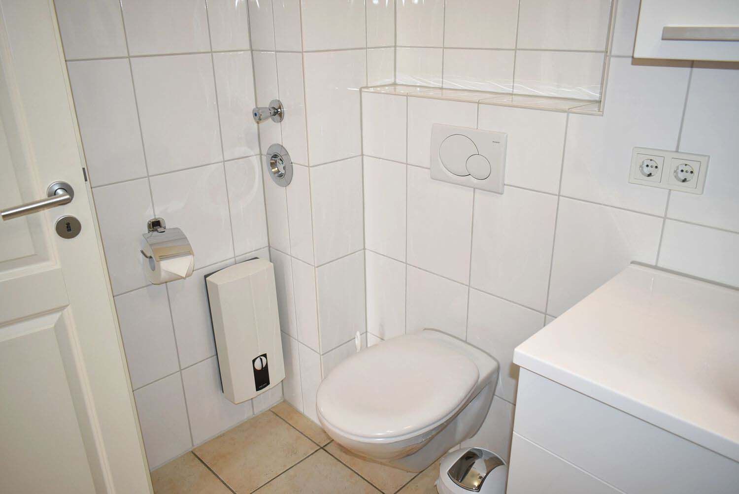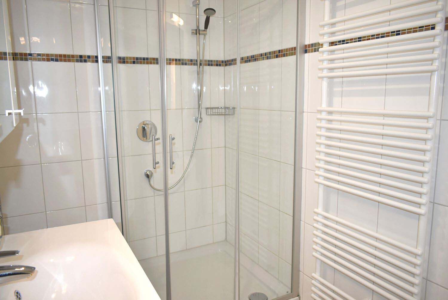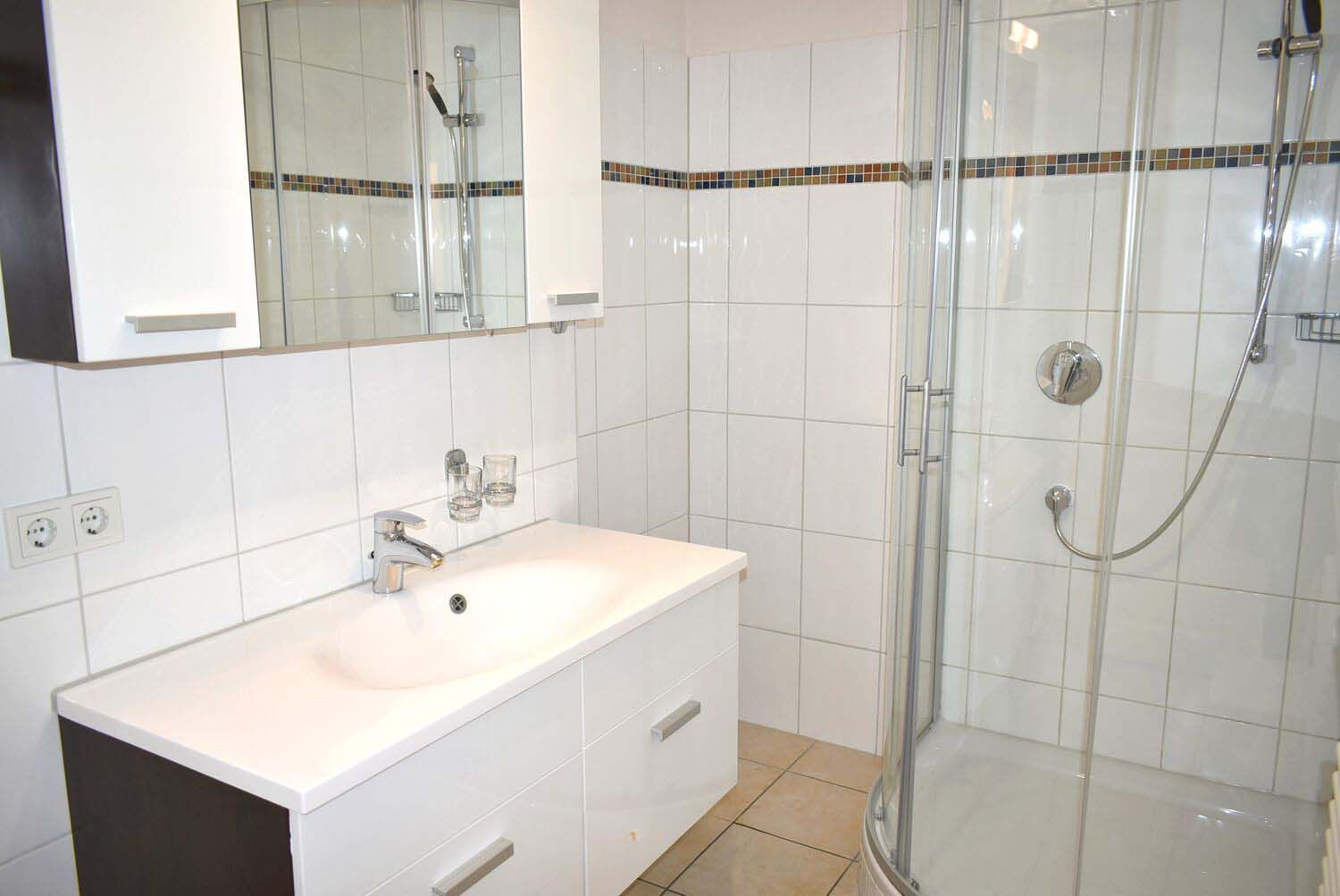 Bad 1: Dusche, Duschkabine, Fön, Hocker, Regal, Spiegelschrank, Waschtisch, WC