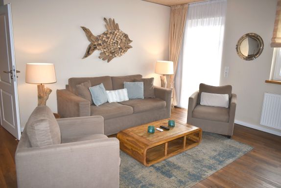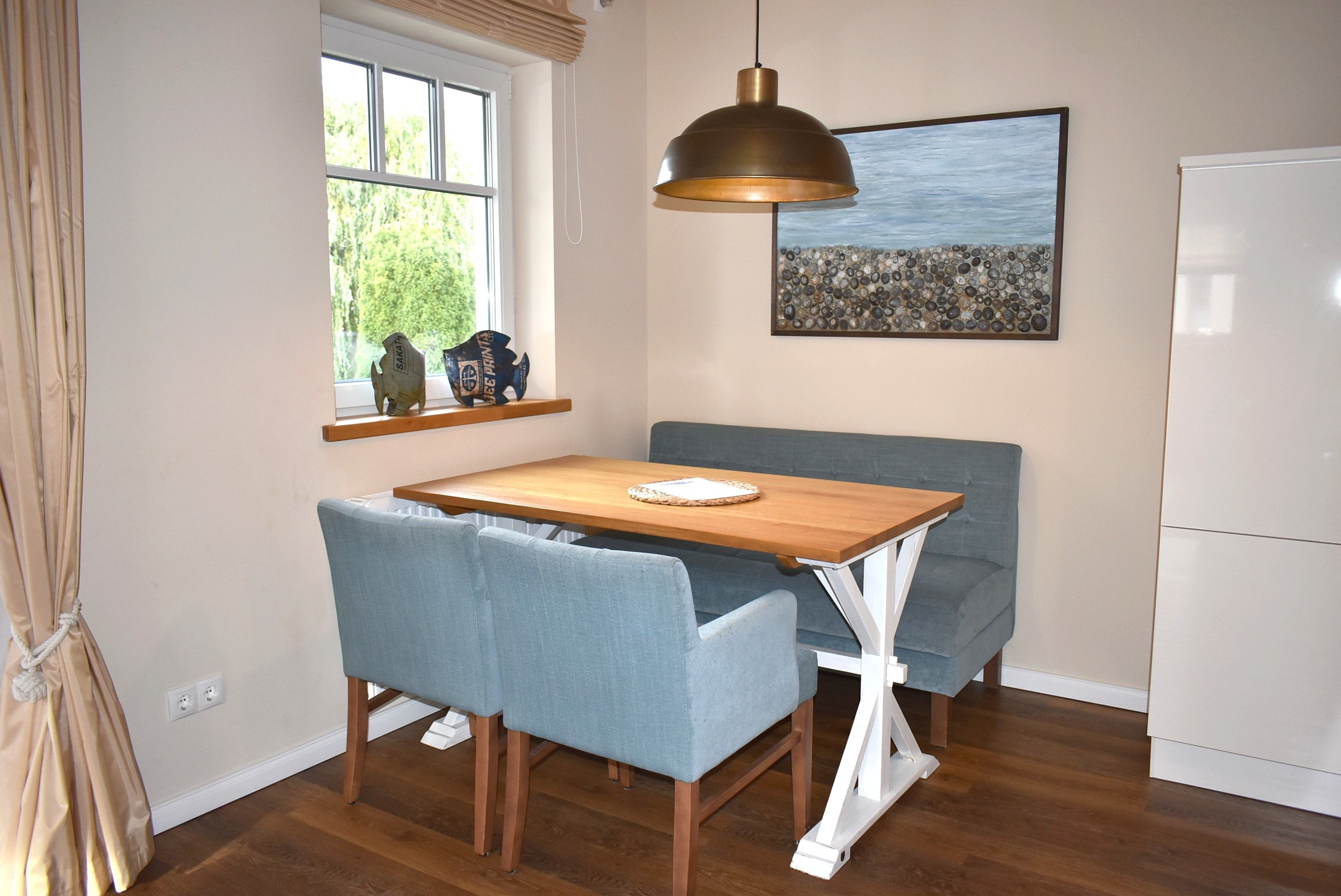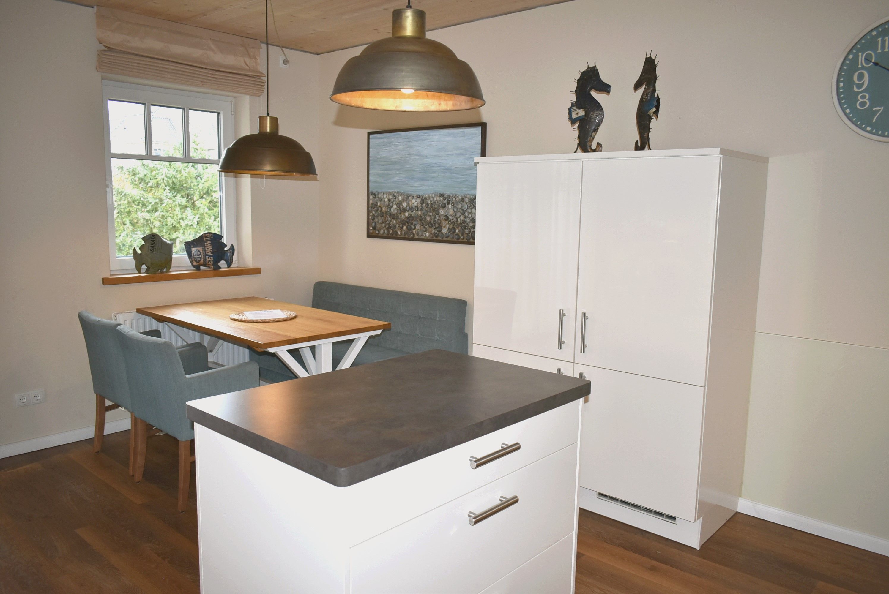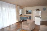 Wohnzimmer: 2 Beistelltische, 2 Sessel, 2 Stühle, 3 Tischlampen, 4 Plattenherd mit Ceranfeld und Backofen, Anrichte, Couchtisch, Dunstabzugshaube, Eierkocher, Esstisch, Flachbildschirm, Gefrierschrank mit 2 Schubladen, Geschirr, Handmixer, Kaffeemaschine, Kochtöpfe, Küchenzeile, Kühlschrank, Mikrowelle, Sat-TV, Schlafcouch, Sitzbank, Spülmaschine, Toaster, Waage, Wasserkocher