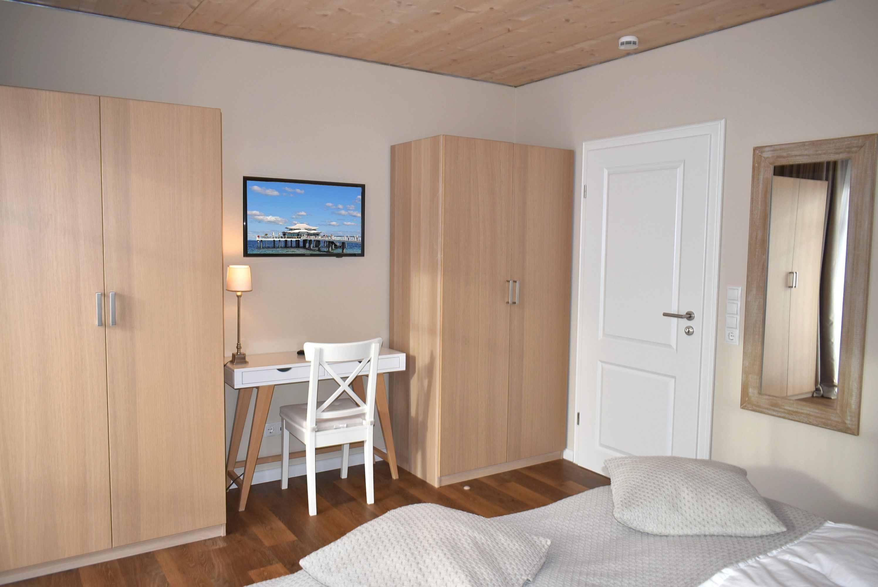 Schlafzimmer 1: 2 Kleiderschränke, 2 Matratzen, 2 Nachttische, Doppelbett 2,00 x 1,80 m, Flachbildschirm, Radiowecker, Sat-TV, Schreibtisch, Spiegel, Stuhl, Tischlampe