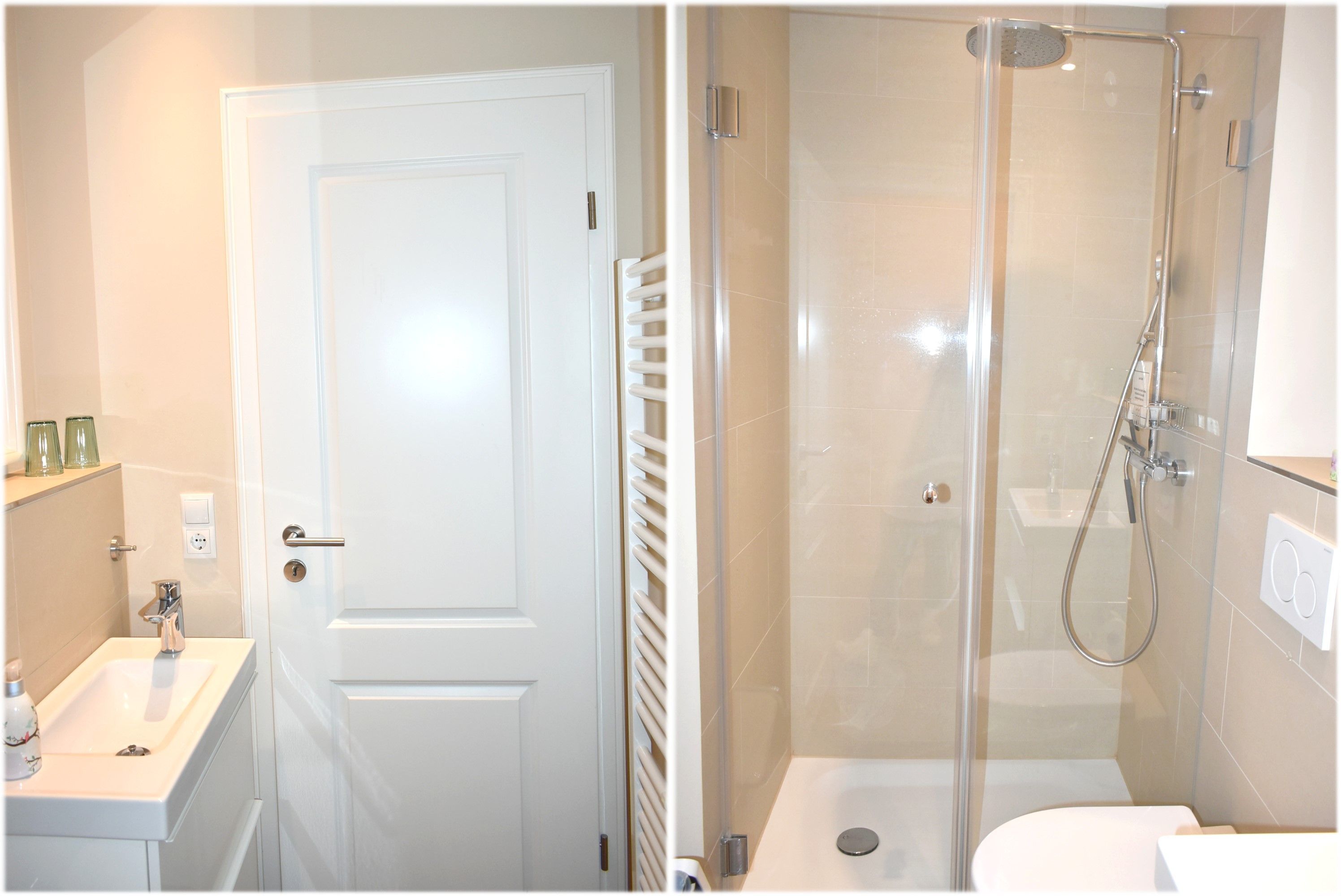 Bad 1: Duschkabine, Fön, Kosmetikspiegel, Regen-Dusche, Spiegel, Unterschrank, Waschtisch, WC