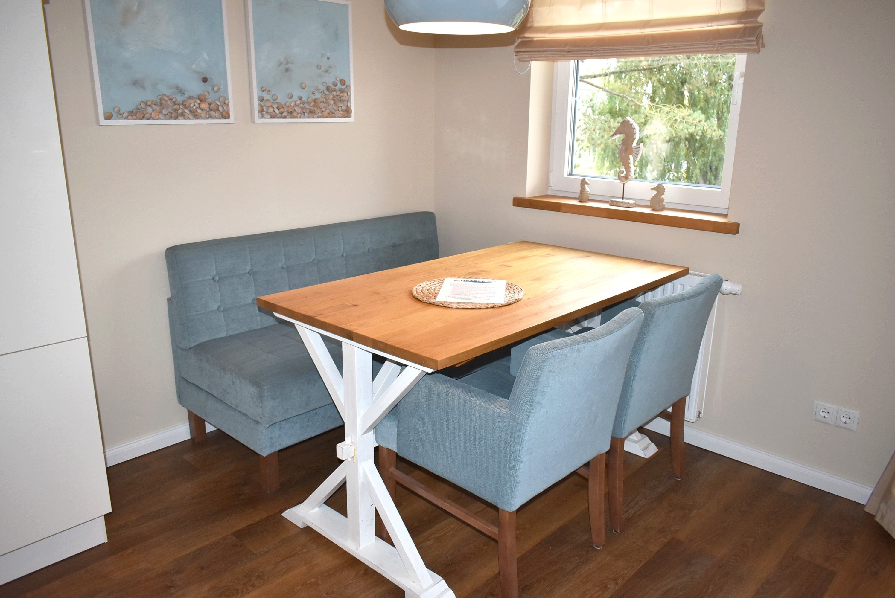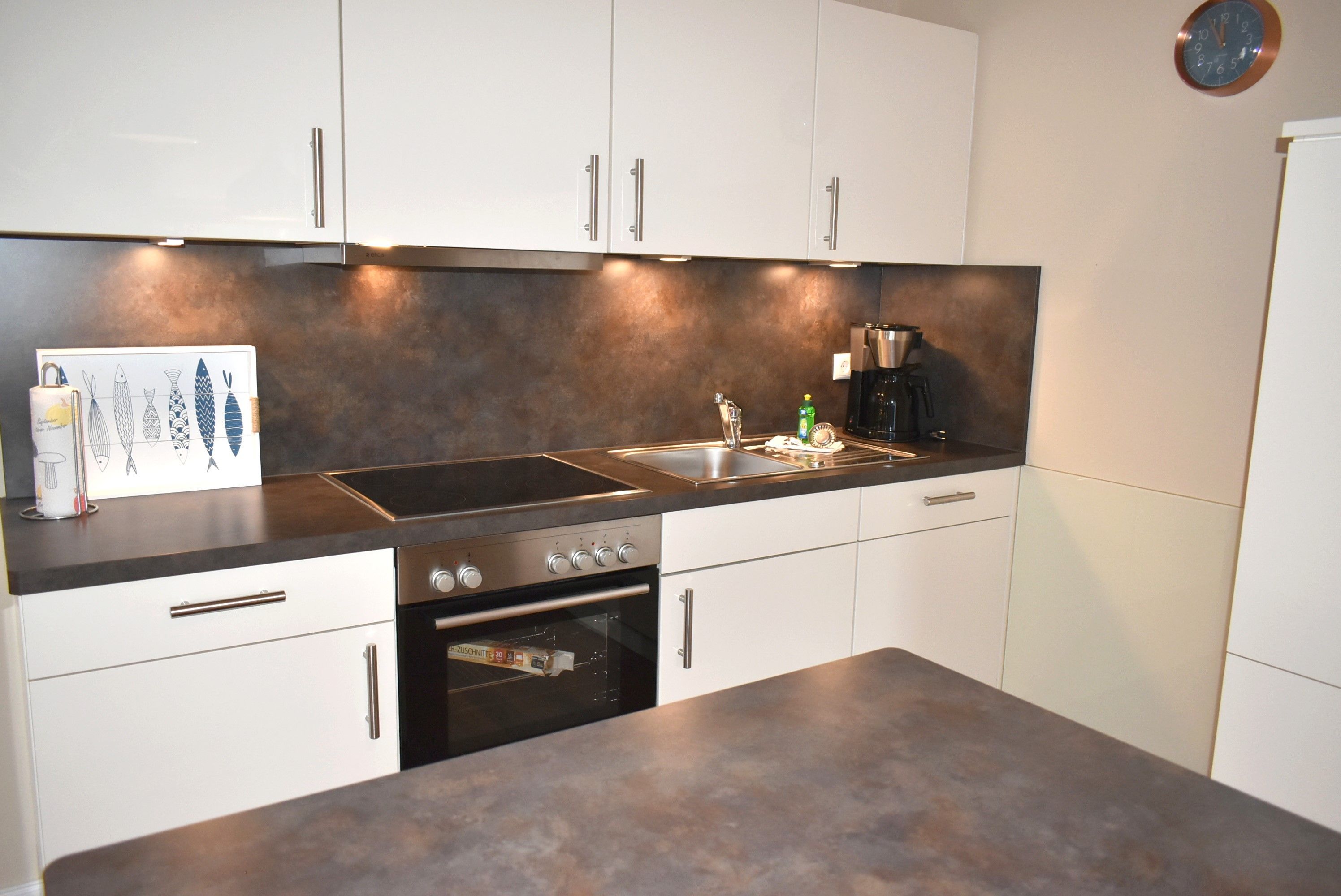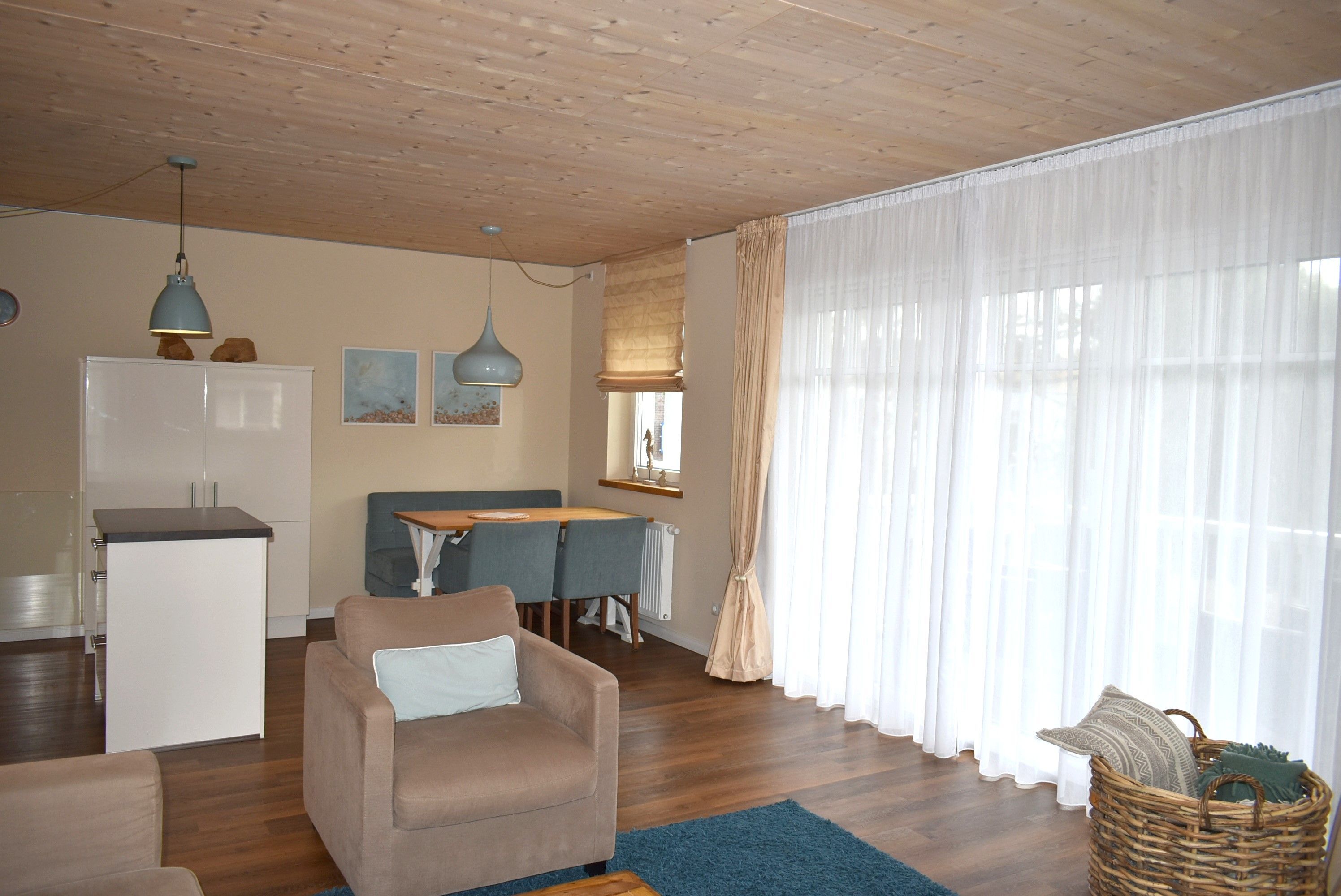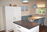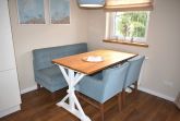 Wohnzimmer: 2 Beistelltische, 2 Sessel, 2 Stühle, 3 Tischlampen, 4 Plattenherd mit Ceranfeld und Backofen, Anrichte, Couchtisch, Dunstabzugshaube, Eierkocher, Esstisch, Flachbildschirm, Gefrierschrank mit 2 Schubladen, Geschirr, Handmixer, Kaffeemaschine, Kochtöpfe, Küchenzeile, Kühlschrank, Mikrowelle, Sat-TV, Schlafcouch, Sitzbank, Spülmaschine, Toaster, Waage, Wasserkocher