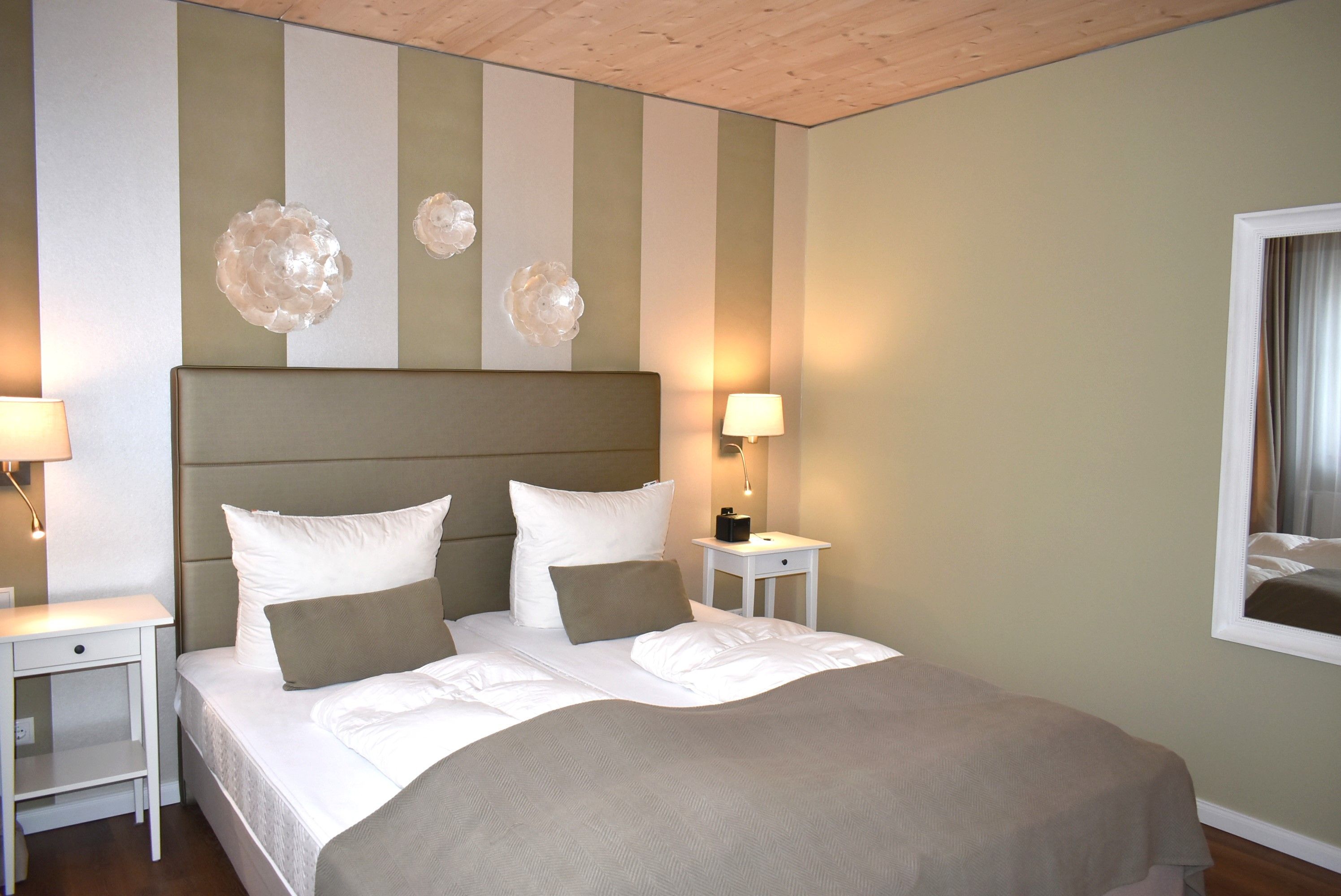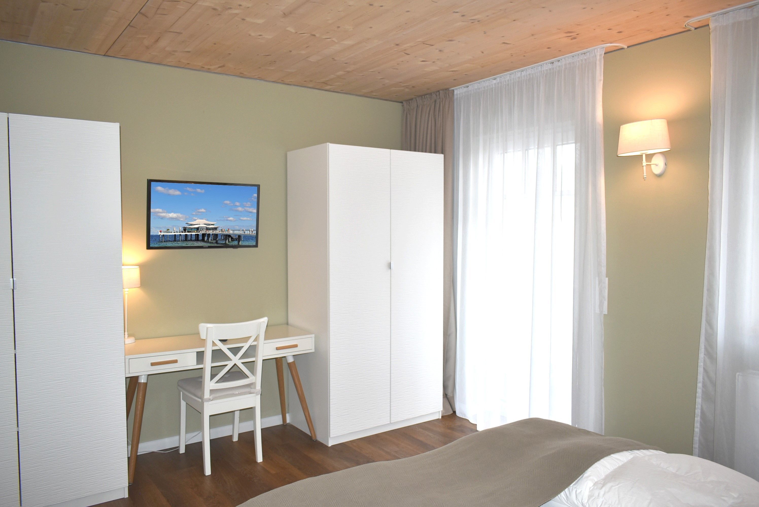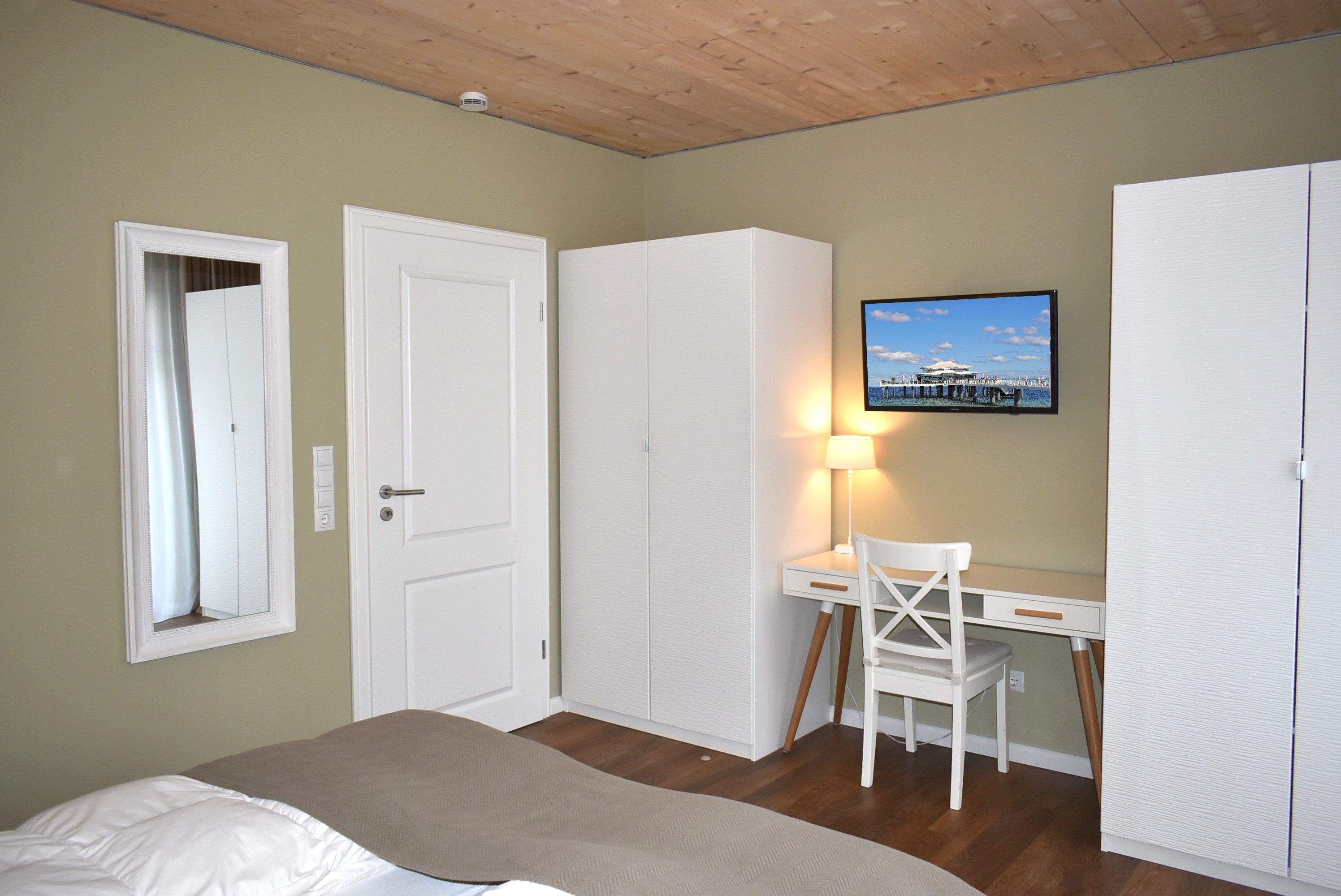 Schlafzimmer 1: 2 Kleiderschränke, 2 Matratzen, 2 Nachttische, Doppelbett 2,00 x 1,80 m, Flachbildschirm, Radiowecker, Sat-TV, Schreibtisch, Spiegel, Stuhl, Tischlampe