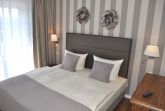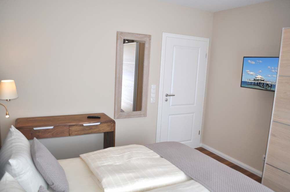 Schlafzimmer 1: 2 Kleiderschränke, 2 Matratzen, 2 Nachttische, Doppelbett 2,00 x 1,80 m, Flachbildschirm, Radiowecker, Sat-TV, Schreibtisch, Spiegel, Stuhl, Tischlampe