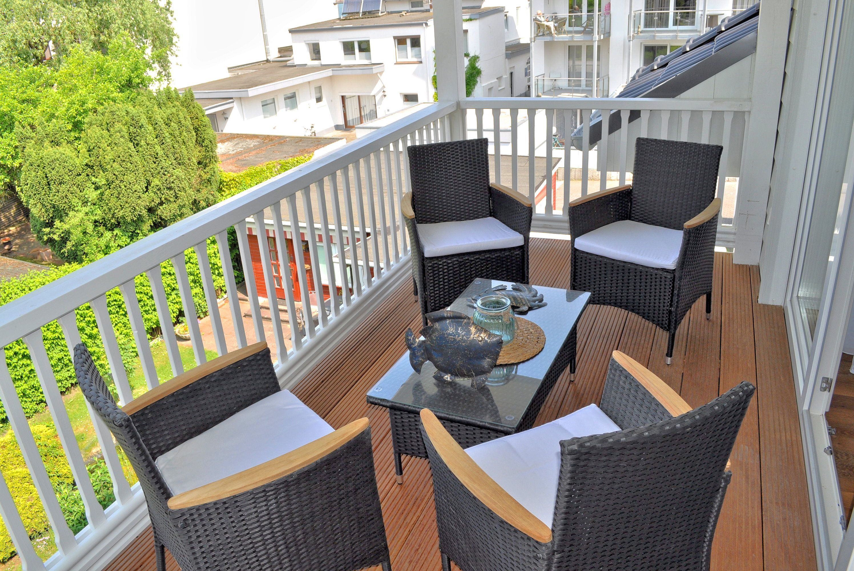 Balkon: 4 Korbstühle, Nord- Westlage, Tisch, überdacht