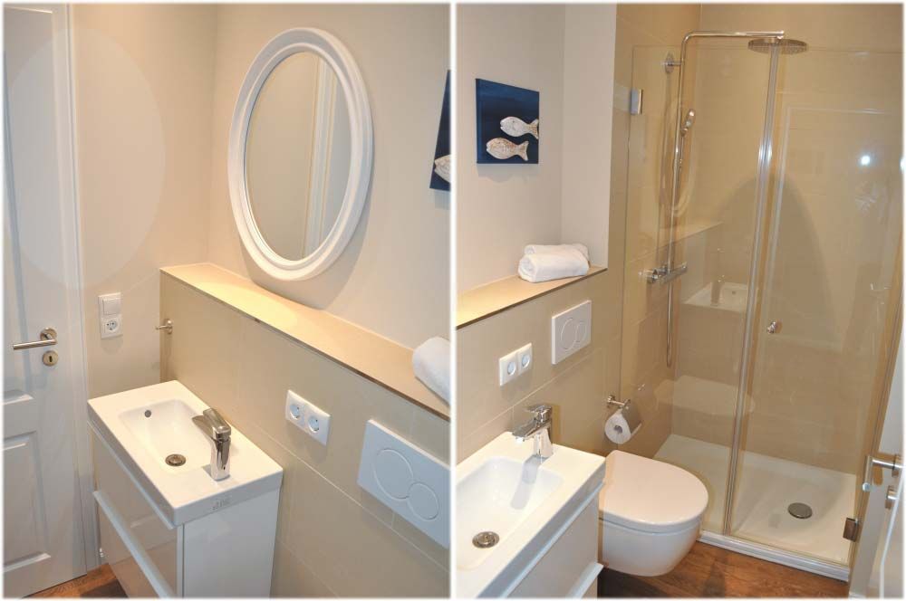 Bad 1: Duschkabine, Fön, Kosmetikspiegel, Regen-Dusche, Spiegel, Unterschrank, Waschtisch, WC