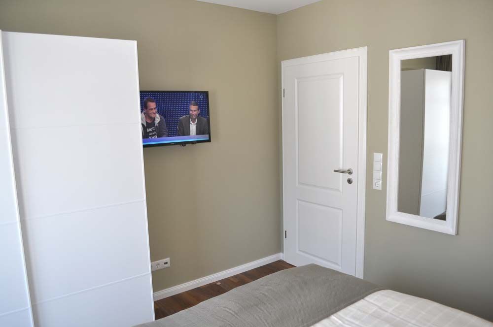 Schlafzimmer 1: 2 Kleiderschränke, 2 Matratzen, 2 Nachttische, Doppelbett 2,00 x 1,80 m, Flachbildschirm, Radiowecker, Sat-TV, Schreibtisch, Spiegel, Stuhl, Tischlampe