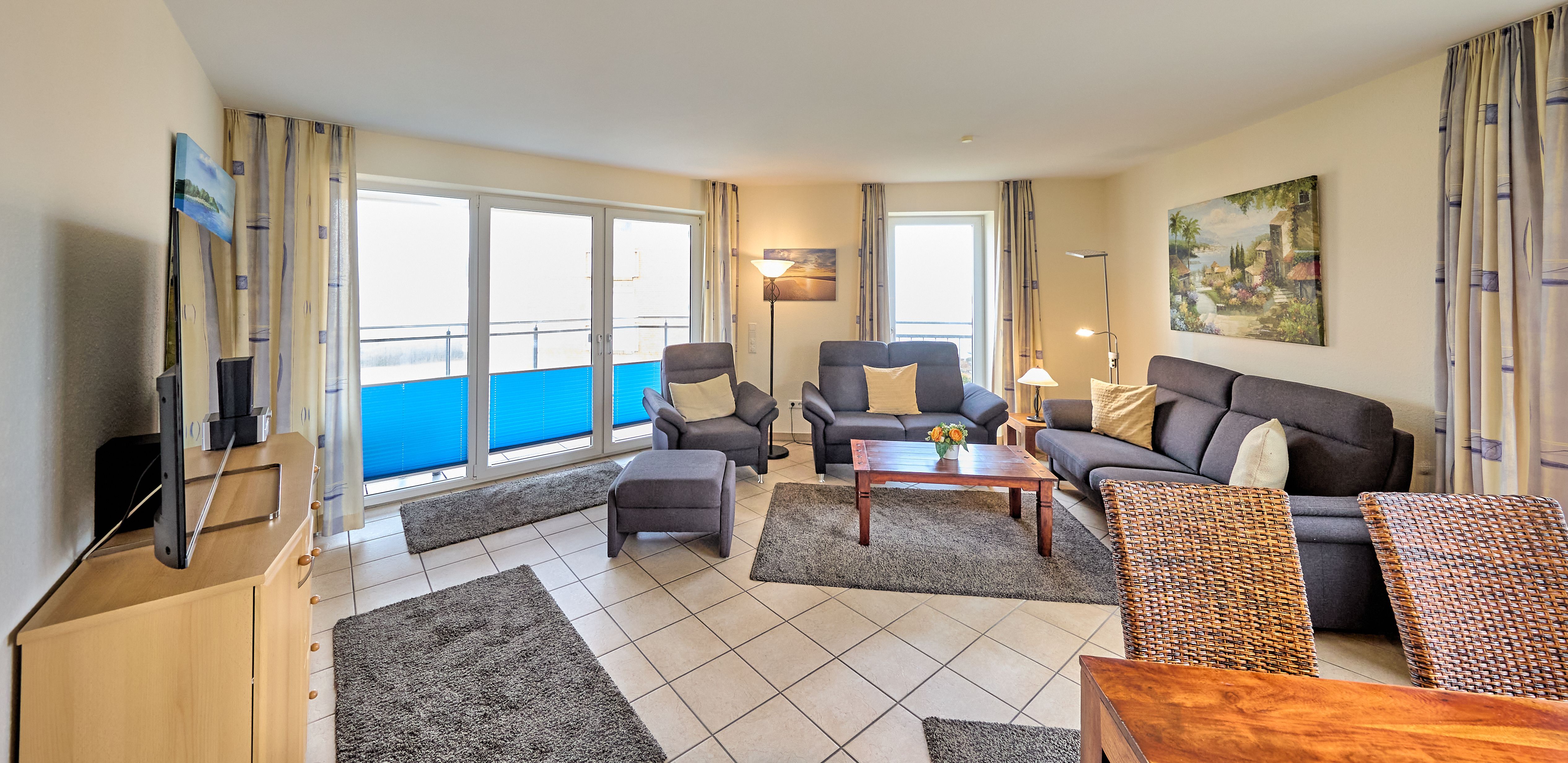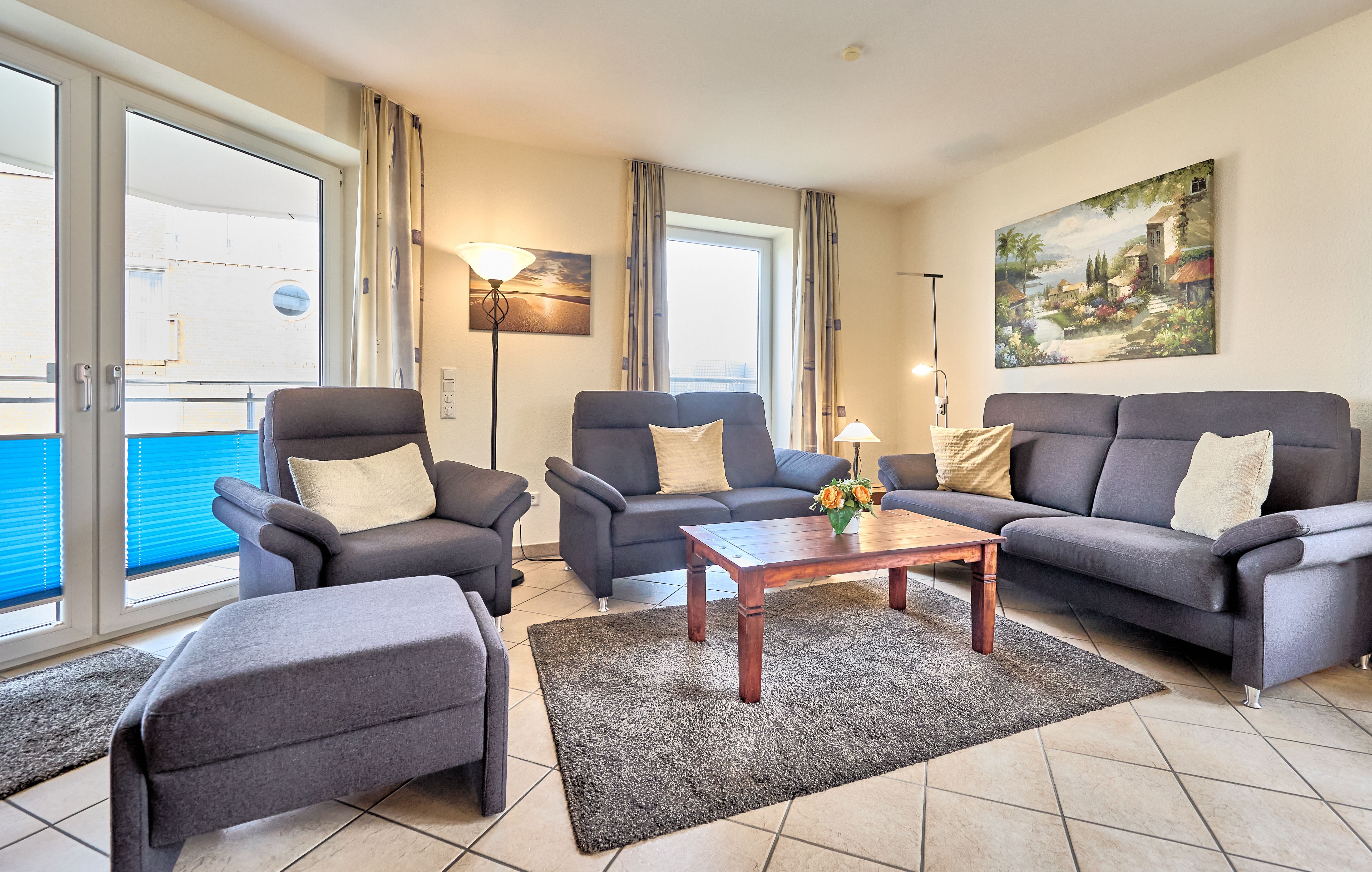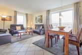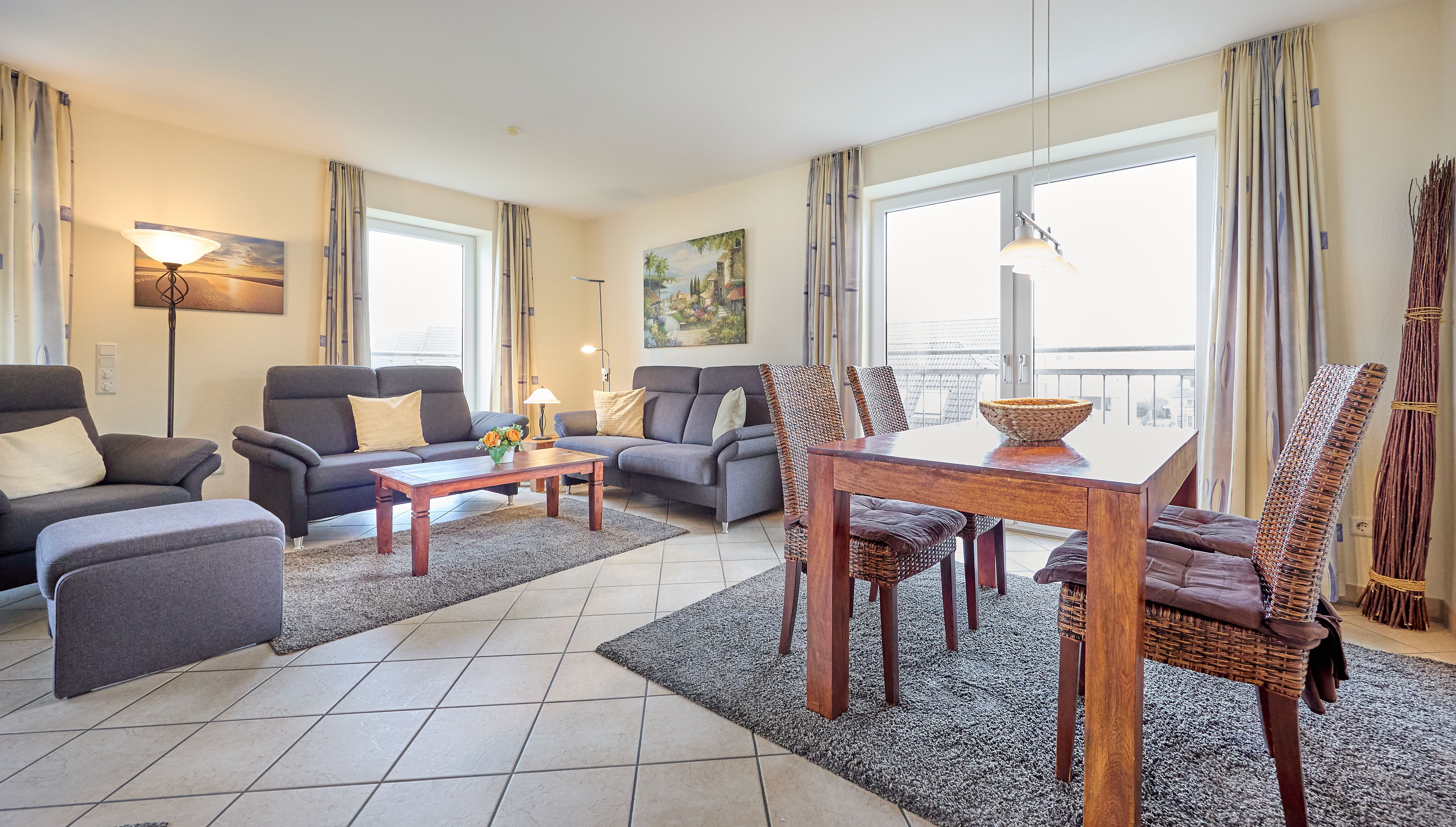 Die Wohnung besteht aus einem Eingangsbereich mit Flur und Garderobe, zwei Schlafzimmern (2x Komfort-Doppelbetten 180x200), einem Badezimmer mit WC, Dusche und Badewanne sowie einem Gäste-WC. Der große und helle Wohn- und Essbereich mit Fußbodenheizung bietet Zugang zum Balkon. Die separate Küche grenzt direkt an den Essbereich. Ein großer Esstisch und eine gemütliche Sofaecke mit verschiedenen Sitzmöglichkeiten bieten ausreichend Platz für alle Anwesenden.