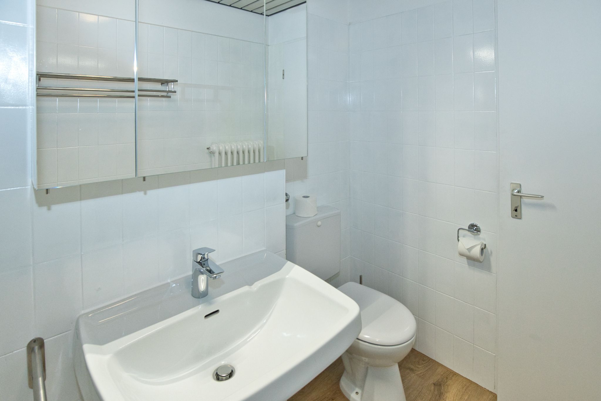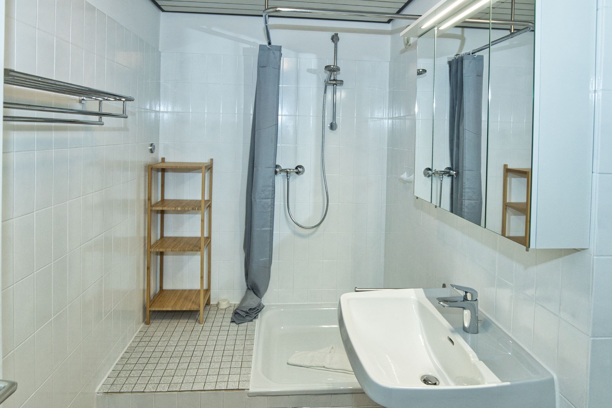 Das renovierte Duschbad mit funktionellen Ablageflächen für Ihre Bad-Utensilien und ein geräumiger Kleiderschrank im Wohnungsflur sorgen für genügend Stauraum.