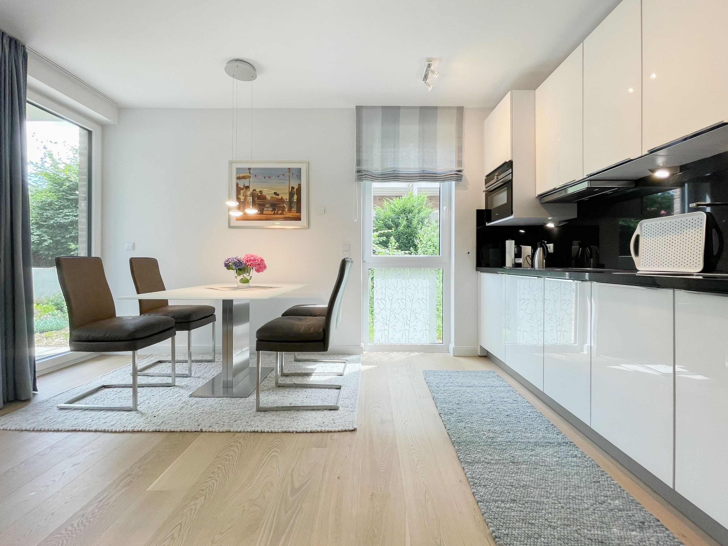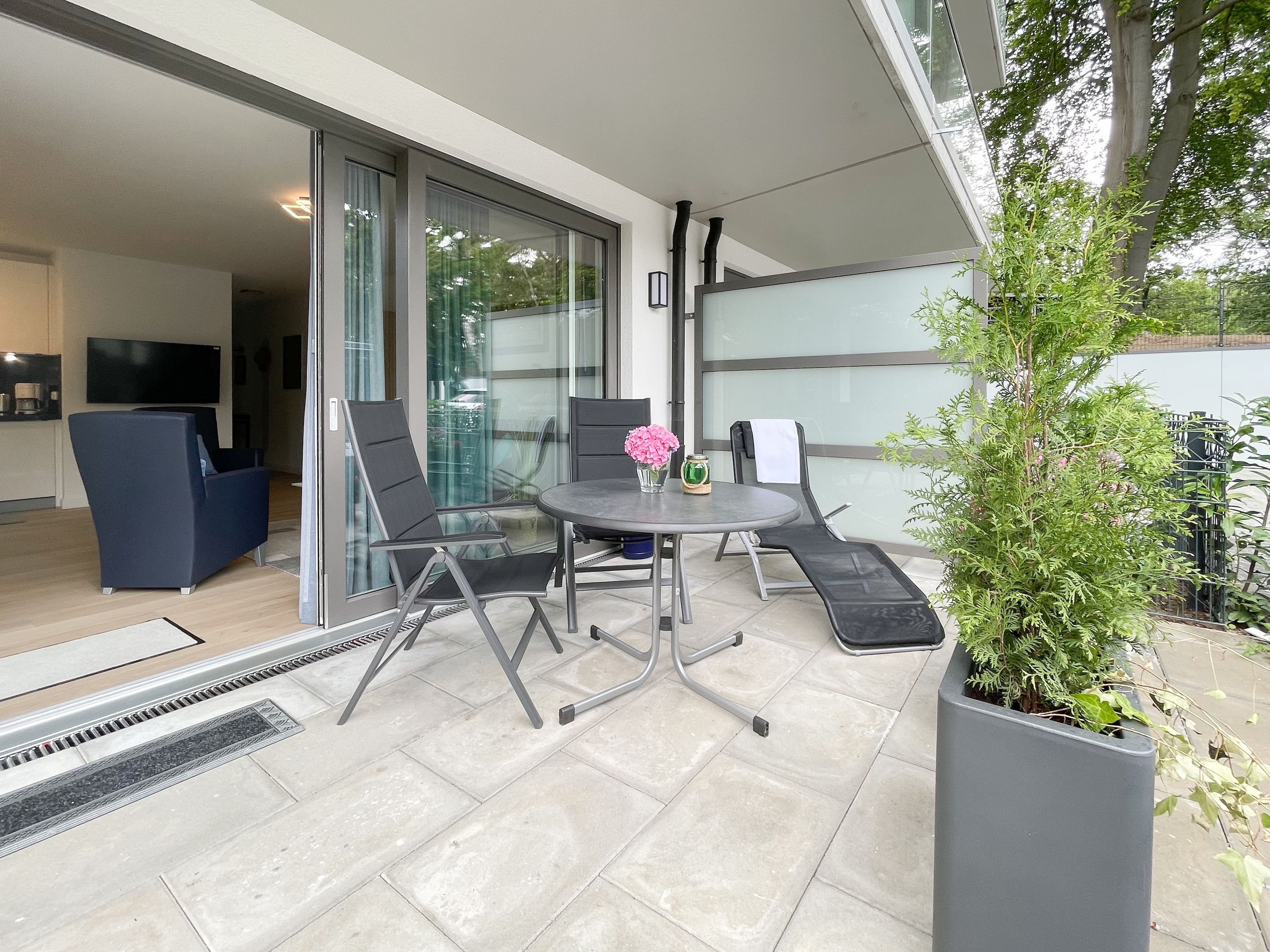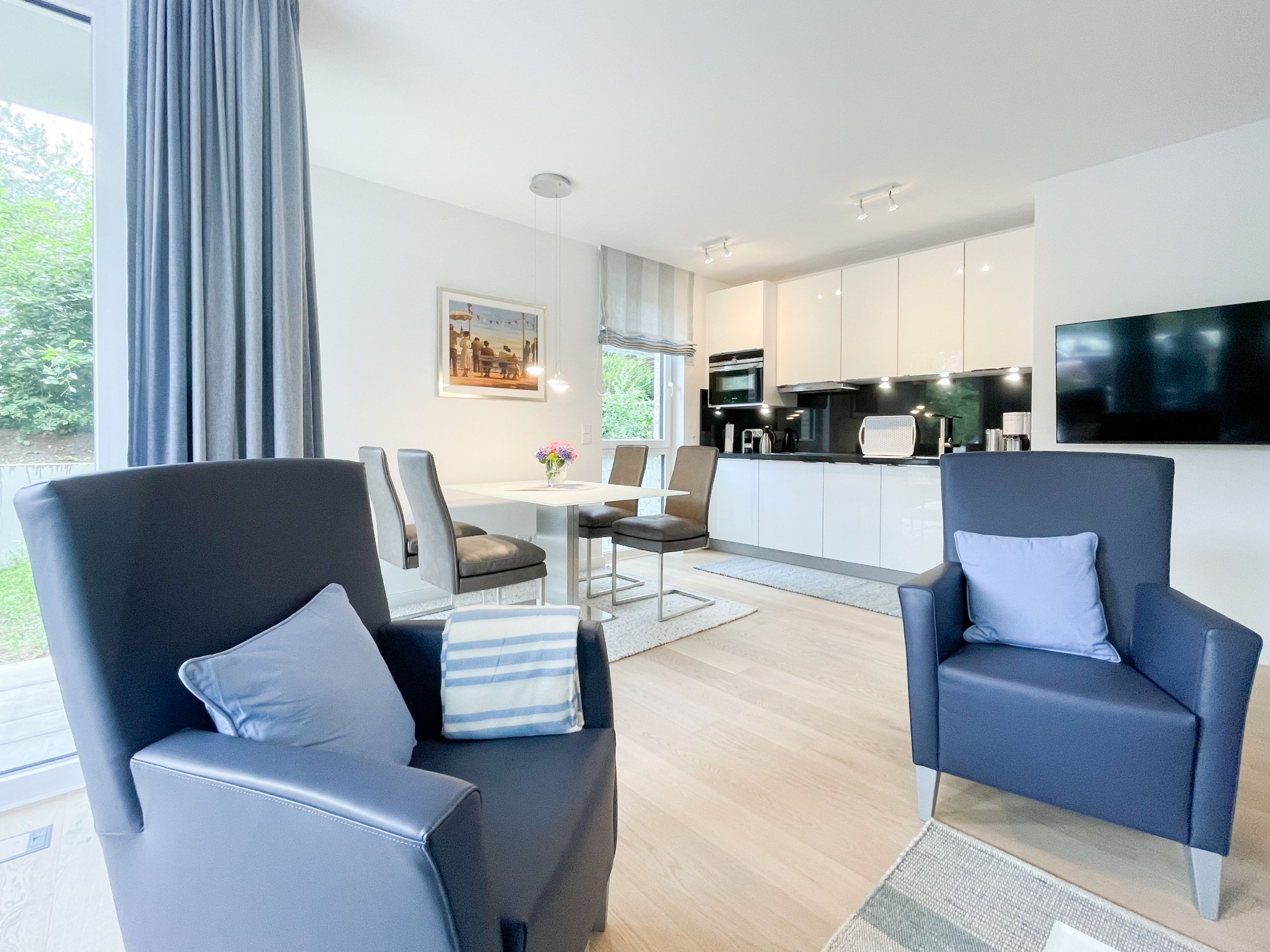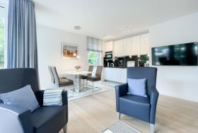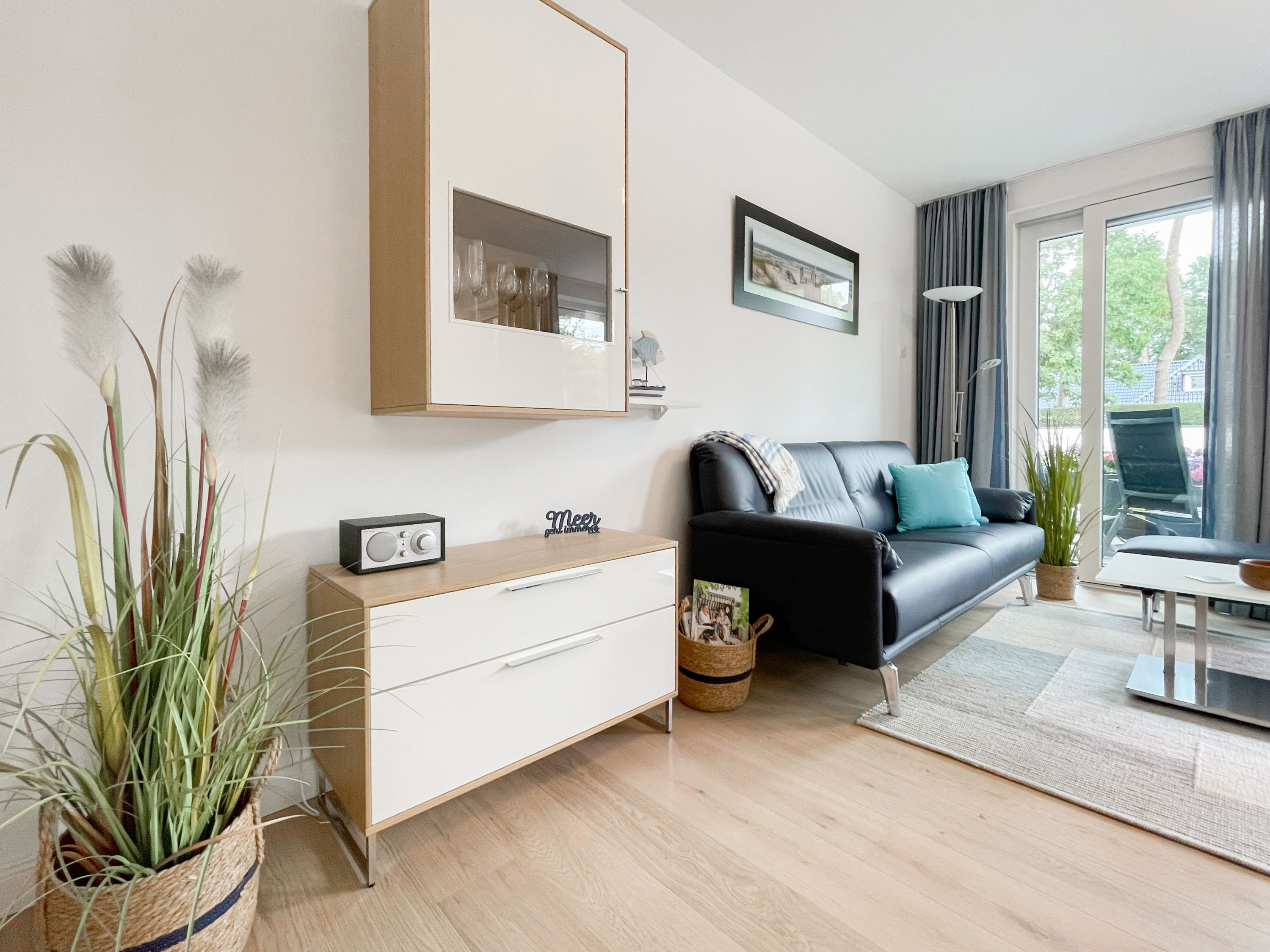Die perfekt ausgestattete Erdgeschosswohnung ist sehr hochwertig eingerichtet und bietet höchsten Wohnkomfort in großzügigen Räumlichkeiten. Bodentiefe Fensterelemente, Echtholzböden und Fußbodenheizung sorgen für eine wunderbare Atmosphäre zum wohlfühlen. Der lichtdurchflutete Wohnbereich ist mit einem Sofa, 2 Sesseln, TV und Radio eingerichtet und der anschließende Essbereich bietet ausreichend Platz für 4 Personen. Die Küche verfügt über wertige Markengeräte und die Ausstattung läßt keine Wünsche offen. Genießen Sie die Morgensonne beim ersten Kaffee auf der Ostterrasse, die sich über den gesamten Wohn- Essbereich erstreckt. Das große Schlafzimmer ist mit einem Doppelbett (180x200), einem Kleiderschrank mit reichlich Stauraum für die Urlaubsgarderobe, einem TV und Vorhängen zur Verdunkelung ausgestattet. Bettwäsche und Handtücher sind im Strandläufer inklusive, sodass bei Anreise die Betten bezogen sind und Handtücher bereit liegen. Das überaus großzügig angelegte Bad verfügt über eine XXL Walk In Dusche, Waschtisch, WC, Bidet, Handtuchtrockner und Fenster. W-LAN steht selbstverständlich zur kostenlosen Nutzung bereit. Die Wohnung ist fast barrierefrei (außer der minimalen Fensterleibung zur Terrasse) und für Allergiker geeignet.