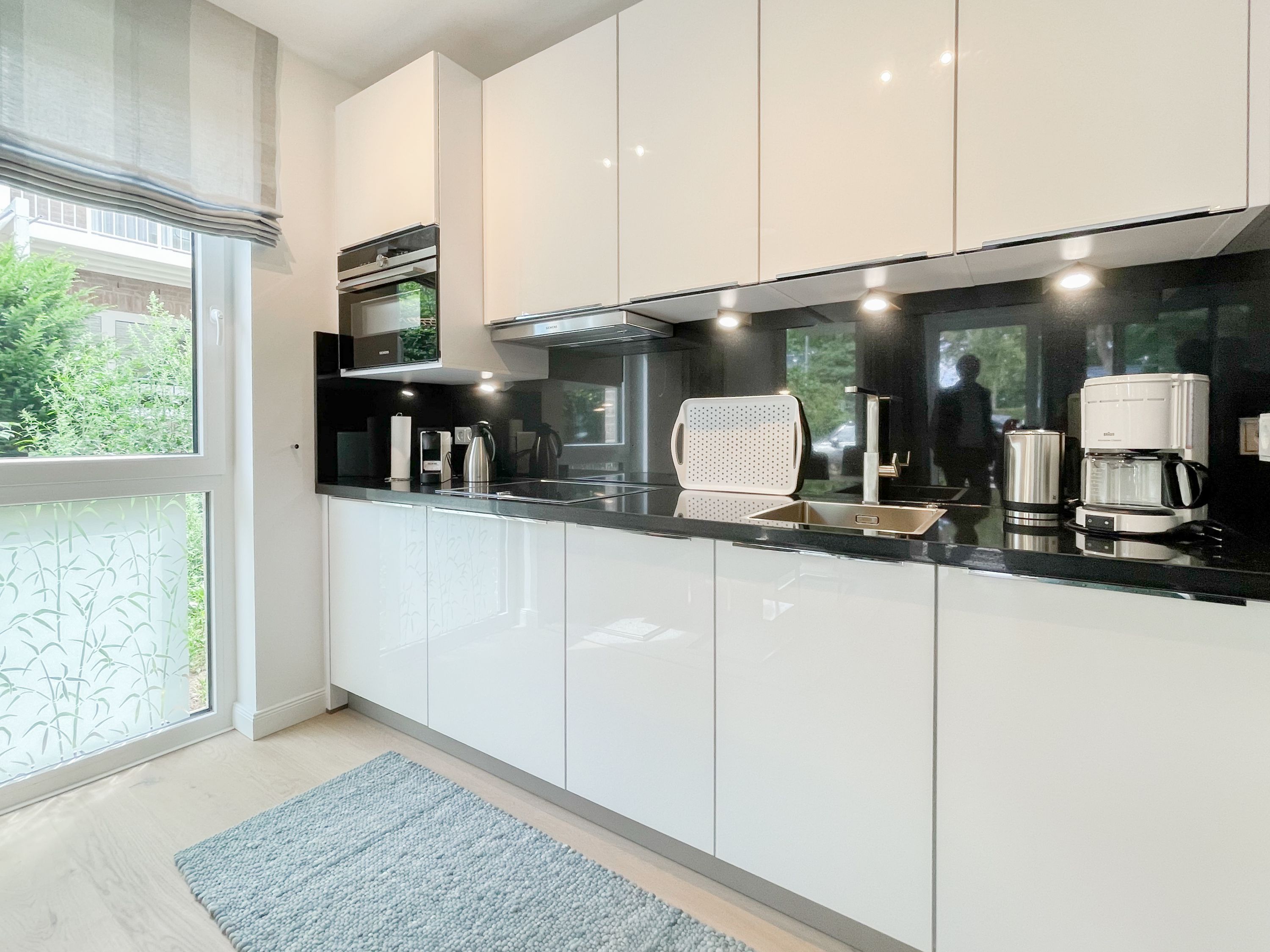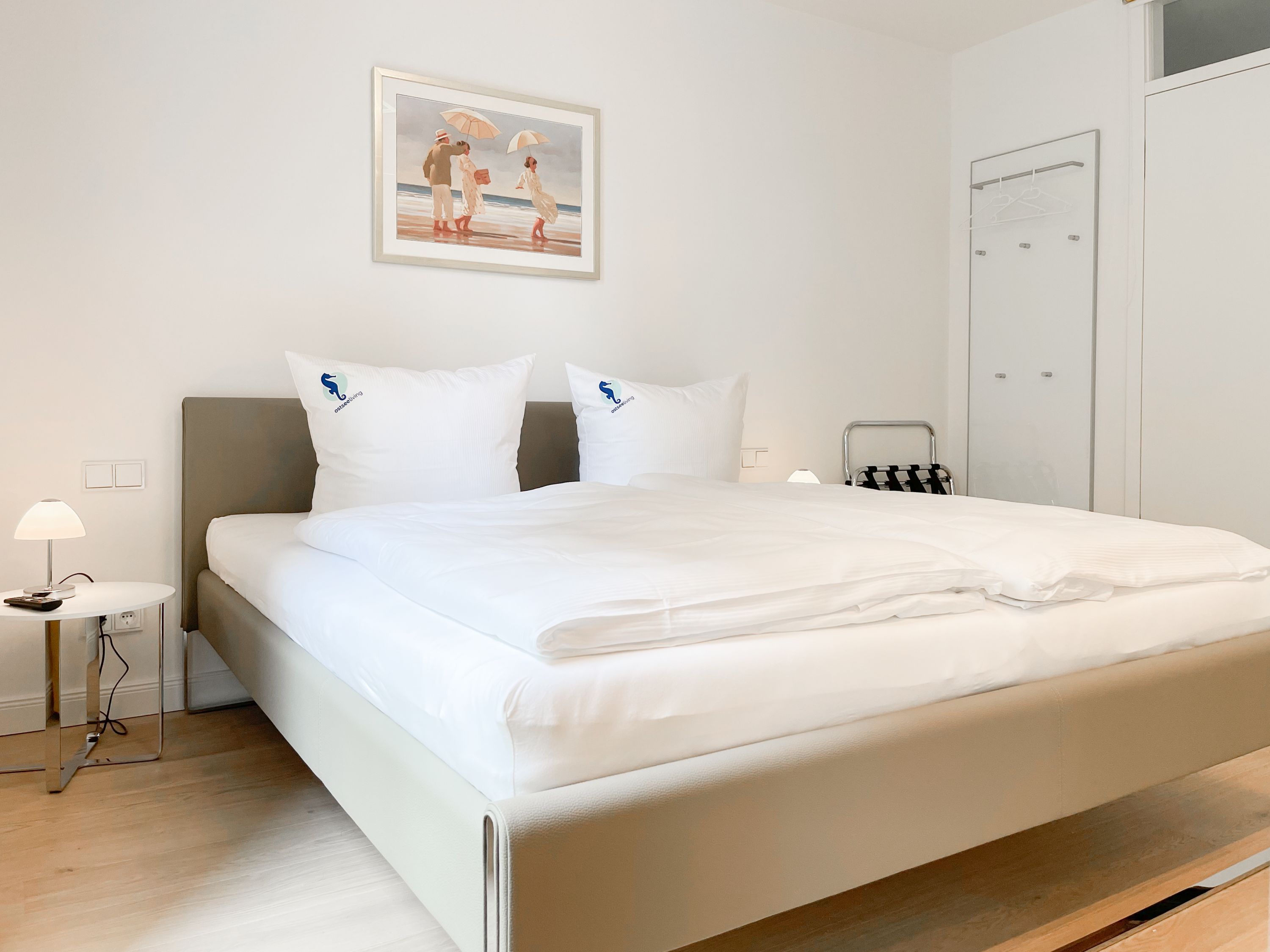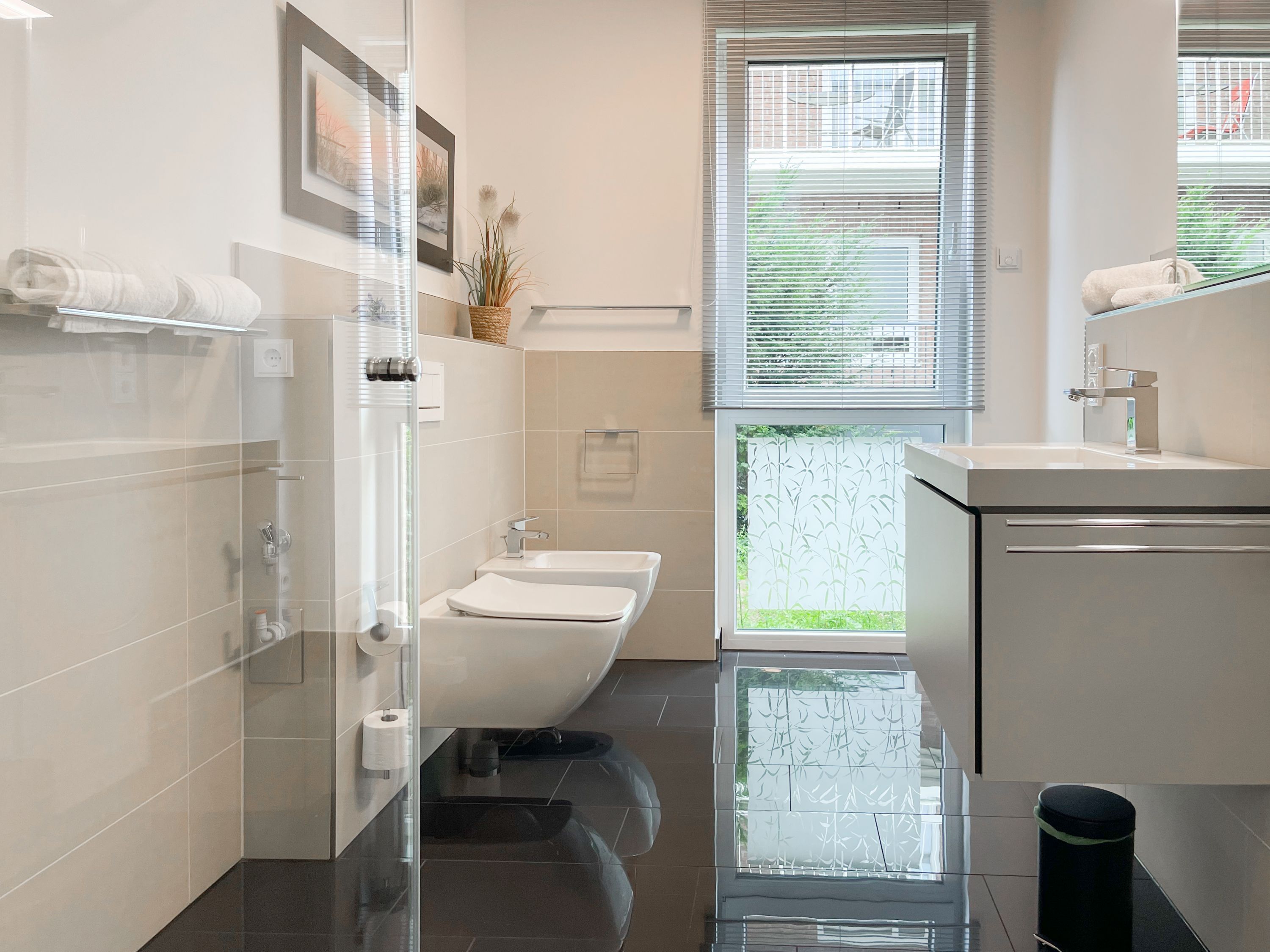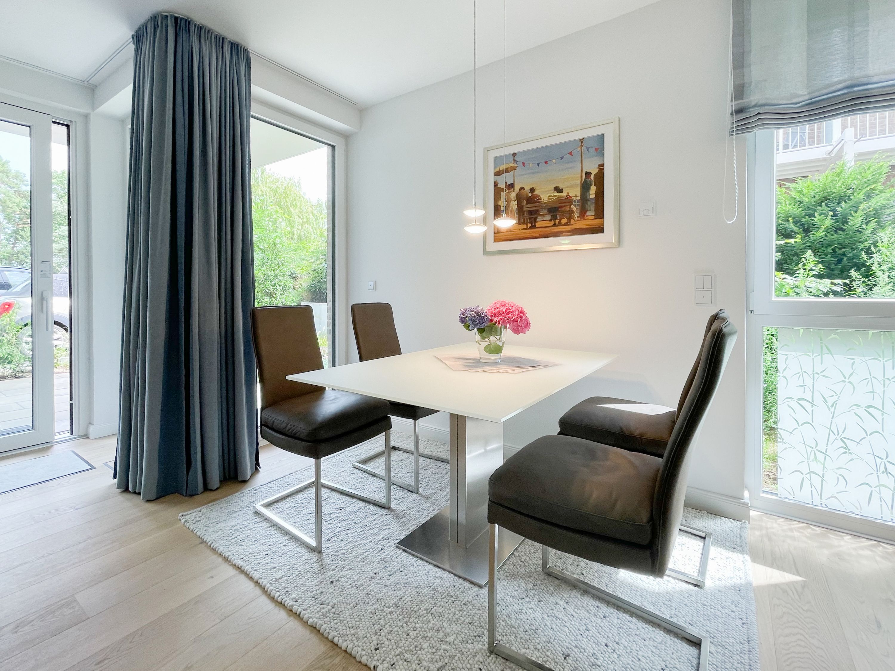 Die perfekt ausgestattete Erdgeschosswohnung ist sehr hochwertig eingerichtet und bietet höchsten Wohnkomfort in großzügigen Räumlichkeiten. Bodentiefe Fensterelemente, Echtholzböden und Fußbodenheizung sorgen für eine wunderbare Atmosphäre zum wohlfühlen. Der lichtdurchflutete Wohnbereich ist mit einem Sofa, 2 Sesseln, TV und Radio eingerichtet und der anschließende Essbereich bietet ausreichend Platz für 4 Personen. Die Küche verfügt über wertige Markengeräte und die Ausstattung läßt keine Wünsche offen. Genießen Sie die Morgensonne beim ersten Kaffee auf der Ostterrasse, die sich über den gesamten Wohn- Essbereich erstreckt. Das große Schlafzimmer ist mit einem Doppelbett (180x200), einem Kleiderschrank mit reichlich Stauraum für die Urlaubsgarderobe, einem TV und Vorhängen zur Verdunkelung ausgestattet. Bettwäsche und Handtücher sind im Strandläufer inklusive, sodass bei Anreise die Betten bezogen sind und Handtücher bereit liegen. Das überaus großzügig angelegte Bad verfügt über eine XXL Walk In Dusche, Waschtisch, WC, Bidet, Handtuchtrockner und Fenster. W-LAN steht selbstverständlich zur kostenlosen Nutzung bereit. Die Wohnung ist fast barrierefrei (außer der minimalen Fensterleibung zur Terrasse) und für Allergiker geeignet.