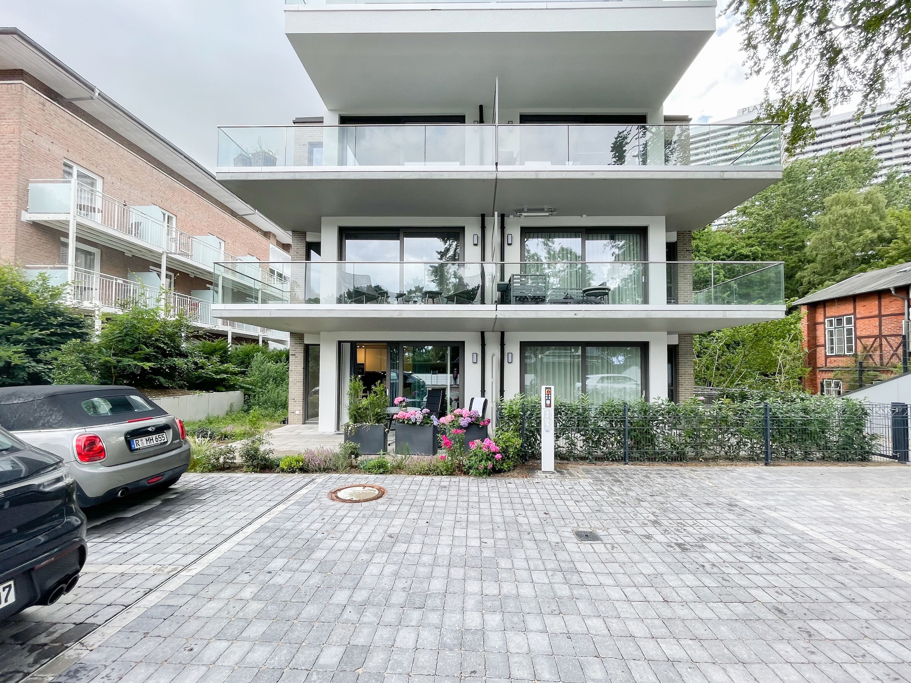 Ein fester Stellplatz (Doppelparker unten für Fahrzeuge bis 5 m Länge, 2m Höhe, 1,9 m Breite ohne Spiegel und maximal Gewicht bis 2,6 t, der Aufzug ist mit dem Wohnungsschlüssel zu bedienen) befindet sich am Haus, der Fahrradkeller ist über eine Außentreppe zu erreichen. Ein Fahrstuhl ist vorhanden.