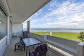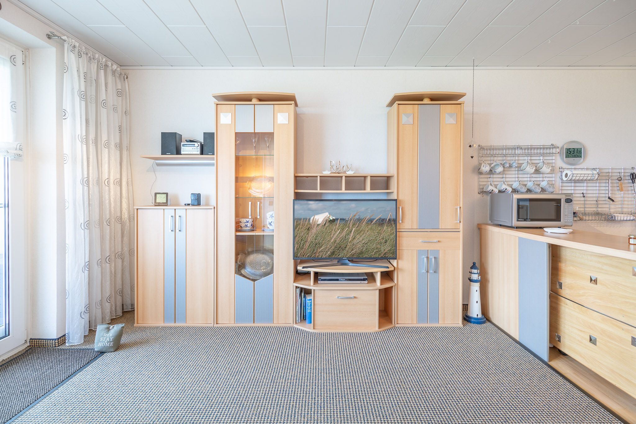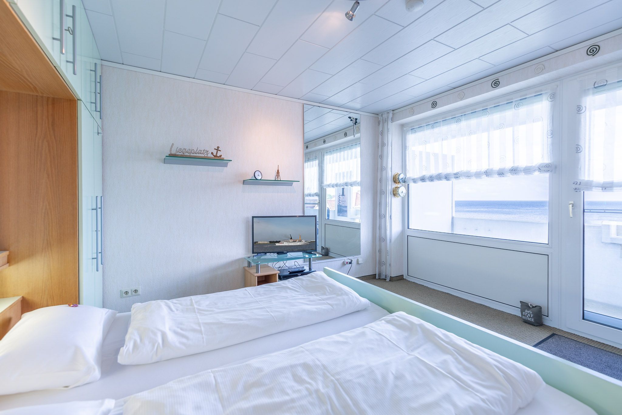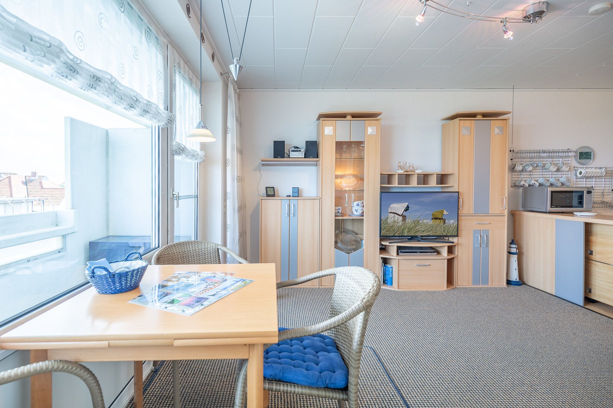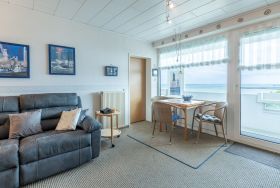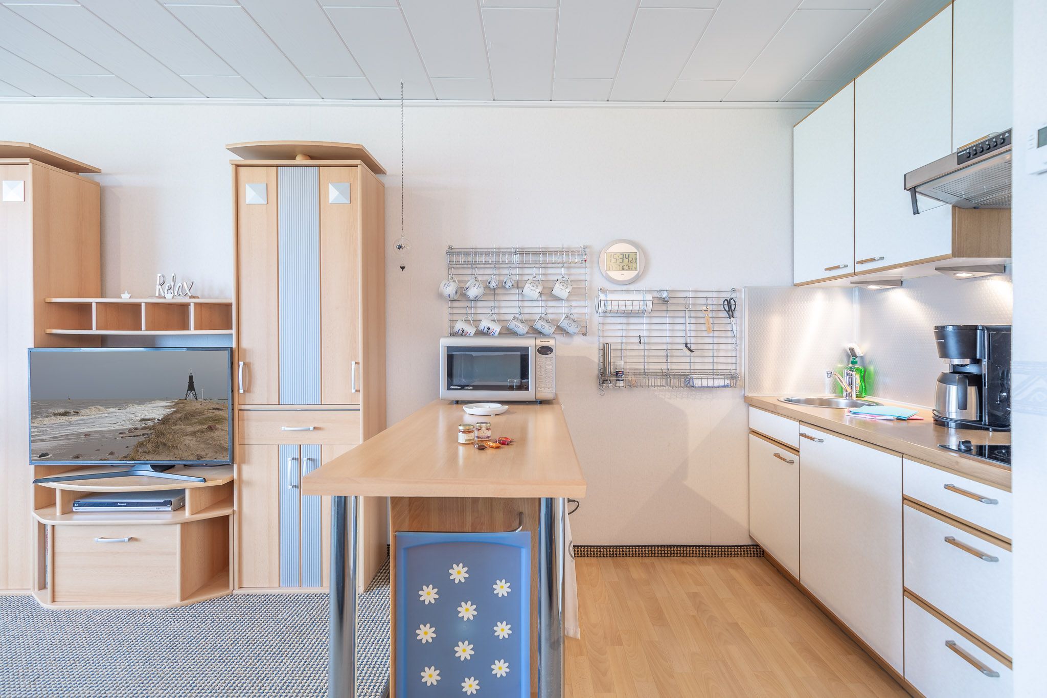 Im kombinierten Wohn- und Essbereich ist eine funktionale Küchenzeile mit Kühlschrank, 2 Plattenherd und Mikrowelle integriert. Dank Flachbildfernseher müssen Sie auch im Urlaub nicht auf einen entspannten Fernsehabend verzichten. Darüber hinaus gehört kostenloses W-Lan zum Standard dieser Wohnung. Der Balkon ist eine wahre Freiluft-Nordseeloge und erstreckt sich über die gesamte Fläche des Wohn- und Schlafzimmers. Selbstverständlich genießen Sie auch vom Balkon den traumhaften Meerblick.
