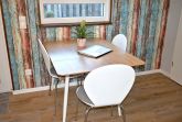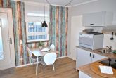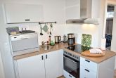 Wohnzimmer: 2 Beistelltische, 3 Stühle, 4 Plattenherd mit Ceranfeld und Backofen, Couchtisch, Dunstabzugshaube, Einbauküche, Esstisch, Flachbildschirm, Garderobe, Geschirr, Kaffeemaschine, kleine Spülmaschine, Kochtöpfe, Kühlschrank mit 3* Gefrierfach, Regal, Sat-TV, Schlafcouch 1,80 x 1,20 m, Schuhständer, Sessel, Stehlampe, Toaster, Vitrine, Wasserkocher