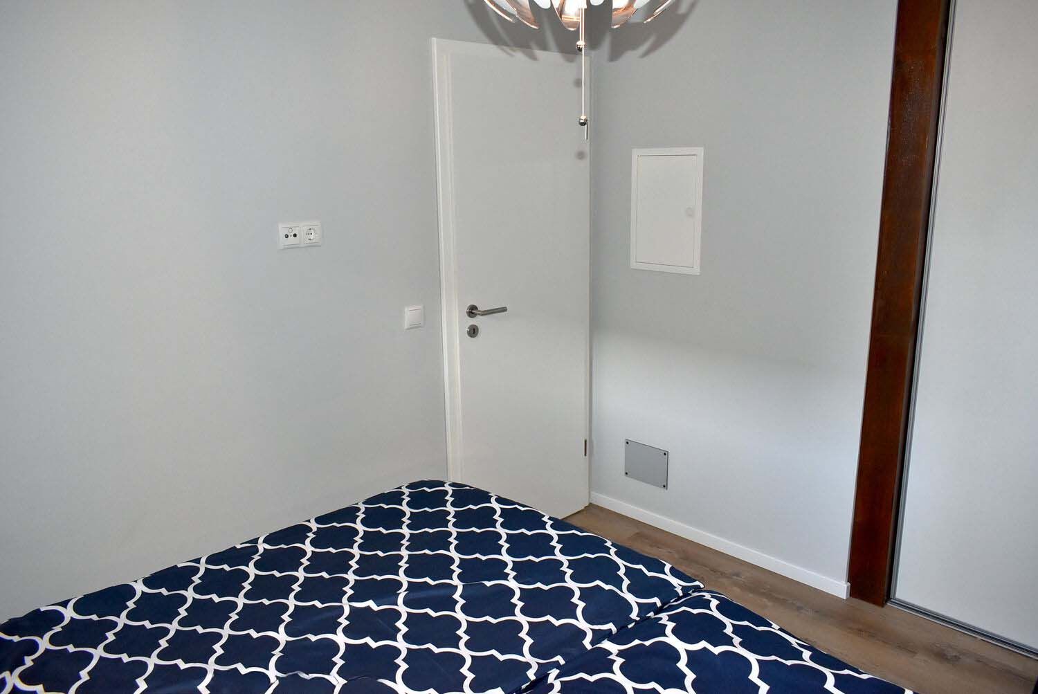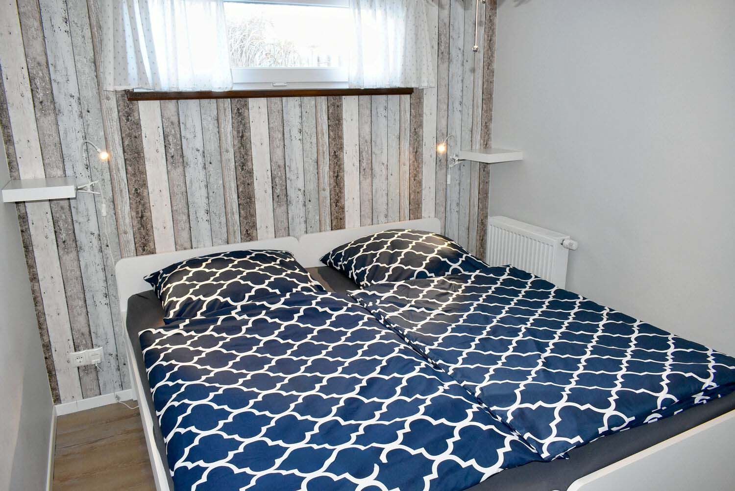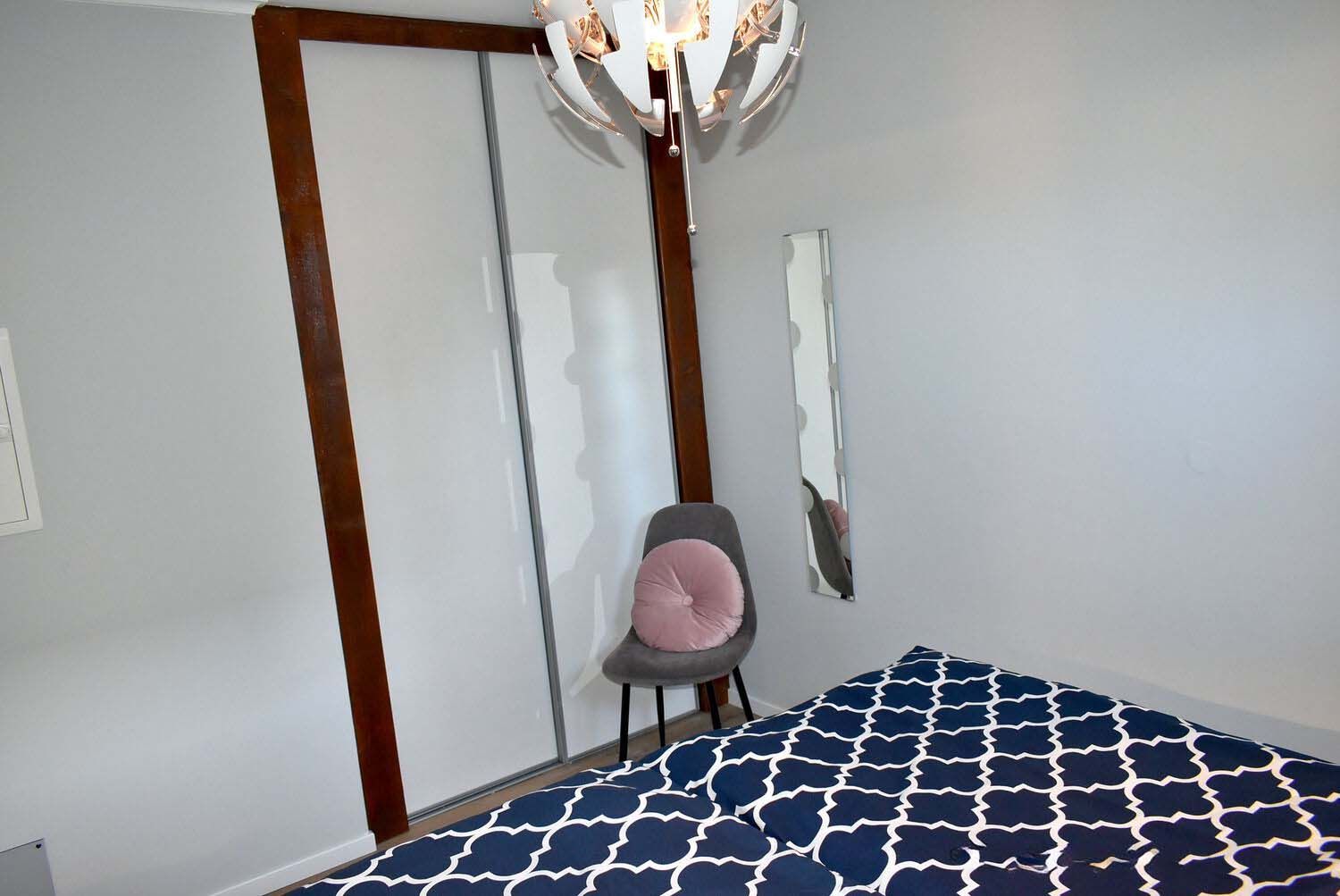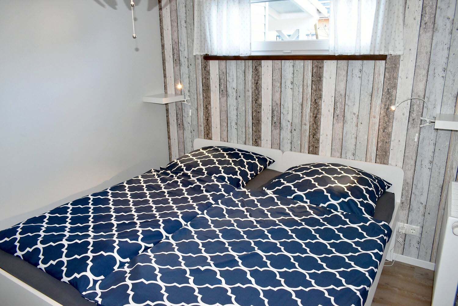 Schlafzimmer 1: 2 Ablagen, 2 Matratzen, Doppelbett 2,00 x 1,80 m, Einbauschrank, Spiegel, Staubsauger, Stuhl