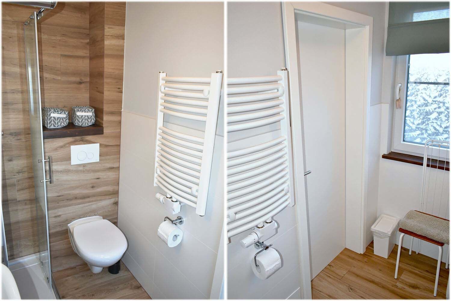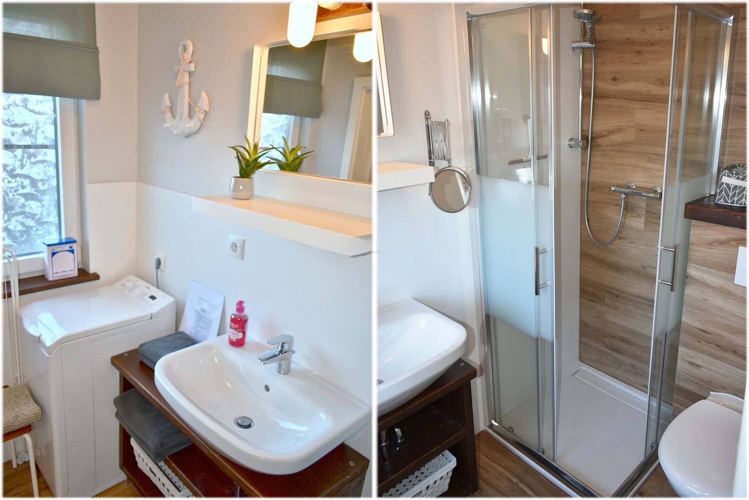 Bad 1: Dusche, Duschkabine, Hocker, Kosmetikspiegel, Regal, Spiegel, Waschbecken, Wäscheständer, Waschmaschine, WC