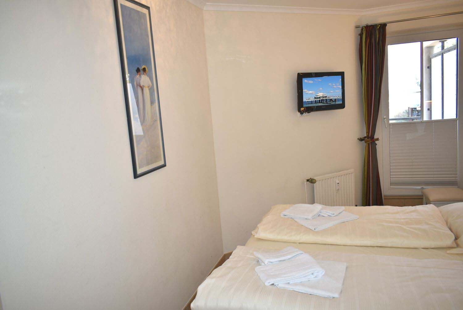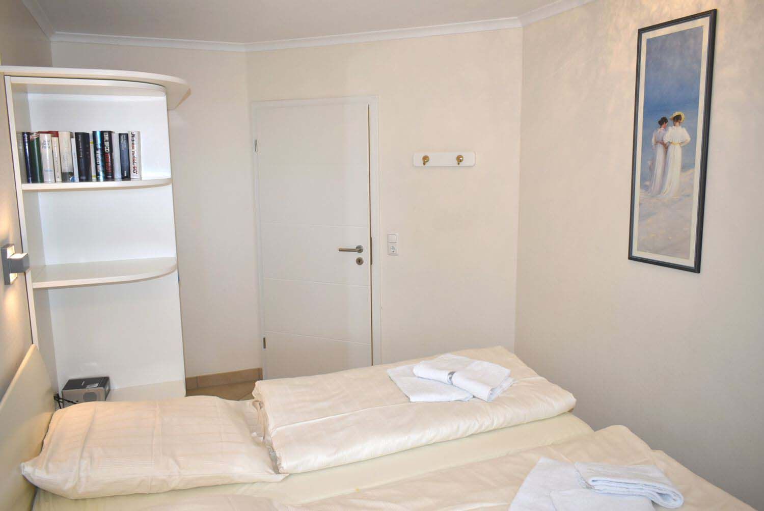 Schlafzimmer 1: Doppelbett 2,00 x 1,80 m Lattenrost Kopf- und Fussteil verstellbar, Flachbildschirm, Garderobe, Kabel-TV, Kleiderschrank, kleiner Meerblick zwischen den Häusern aus dem Bett, Kofferablage, Korbsessel, Nachttisch, Radiowecker, Regal, Spiegel