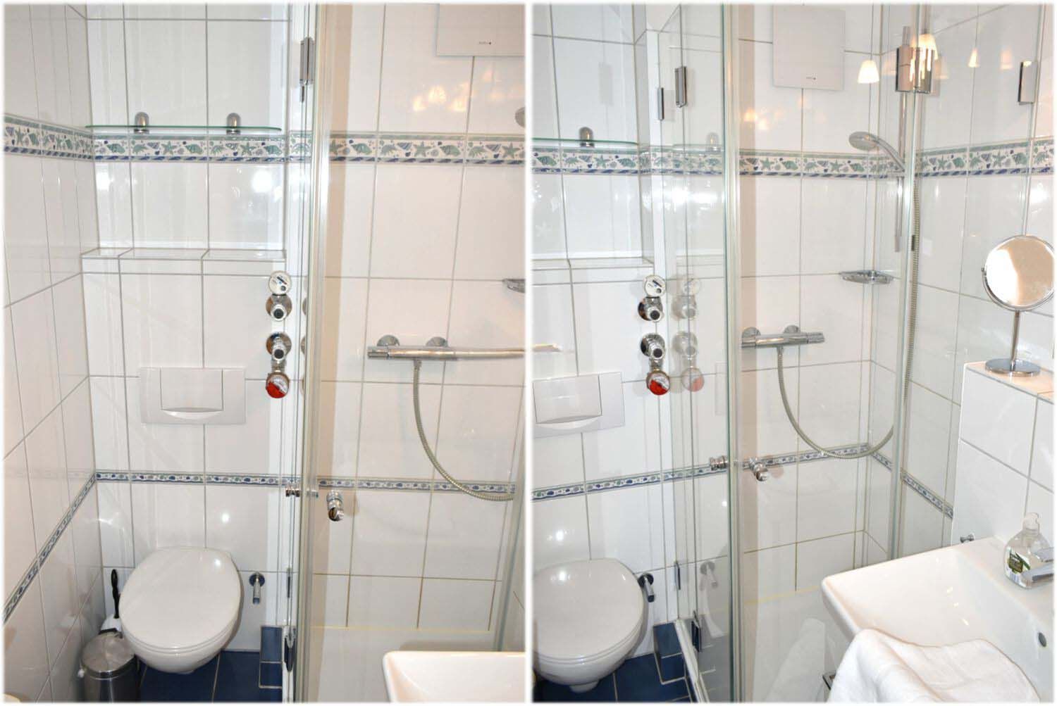 Bad 1: Dusche, Duschkabine, Fön, Kosmetikspiegel, Schrank, Spiegel, Waschbecken, WC
