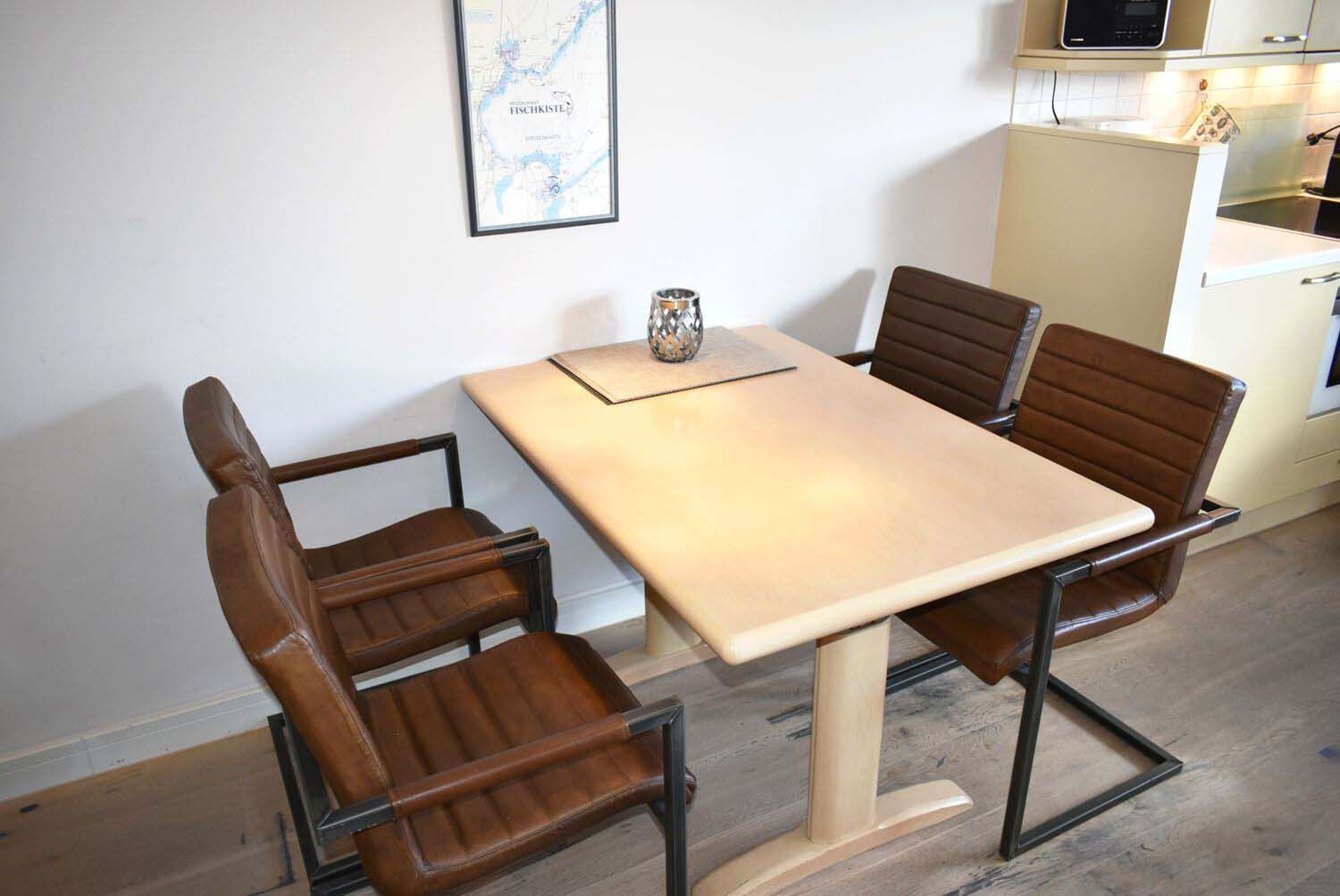 Balkon: 4 Fleecedecken, 4 Stühle mit Auflagen, Bodenwindlicht, Meerblick zwischen den Häusern, Nord- Ostlage, Tisch, Tischwindlicht, überdacht