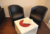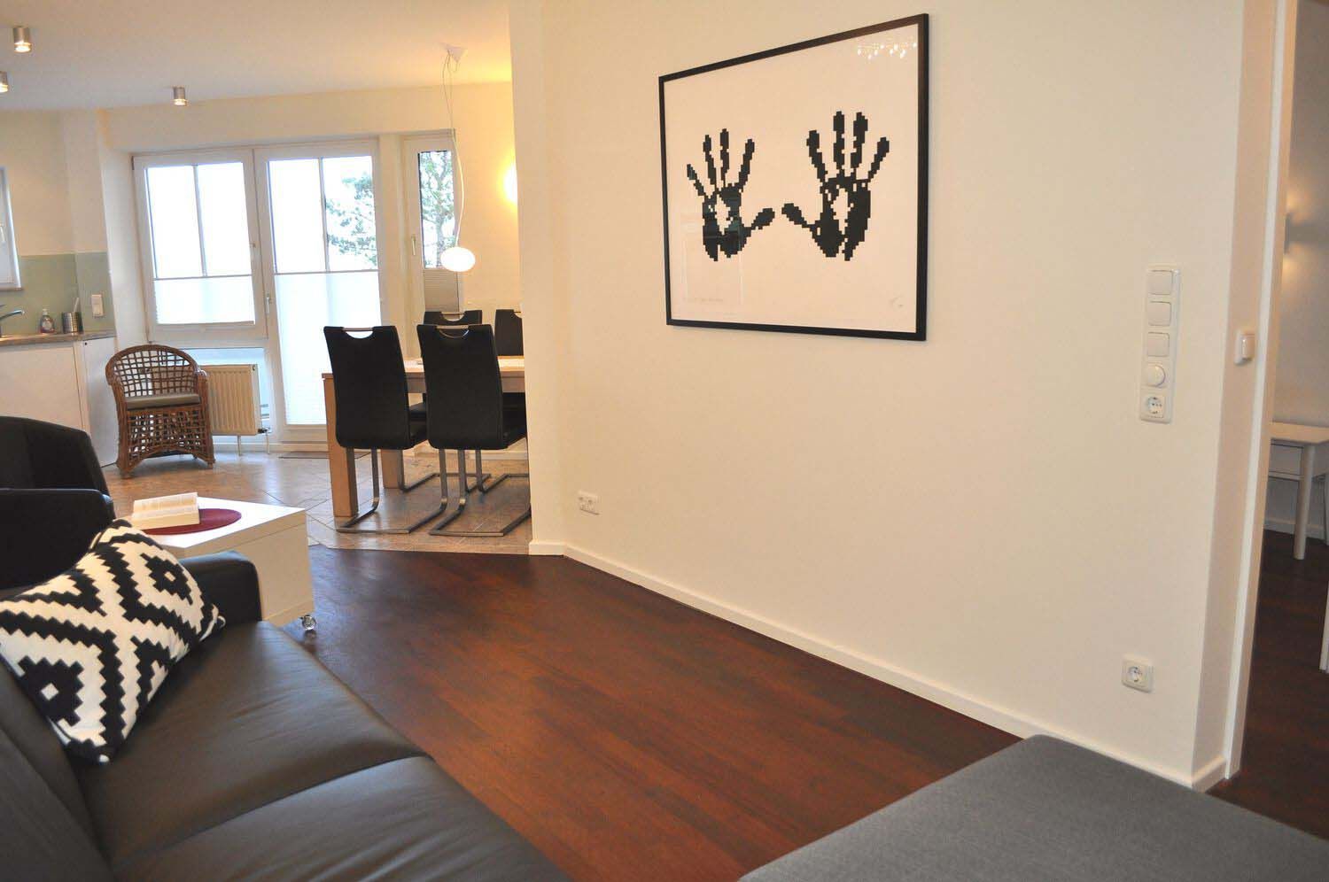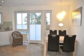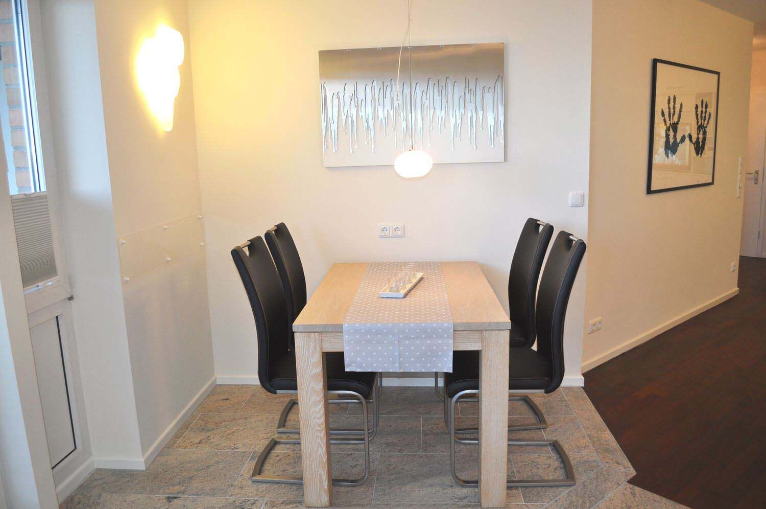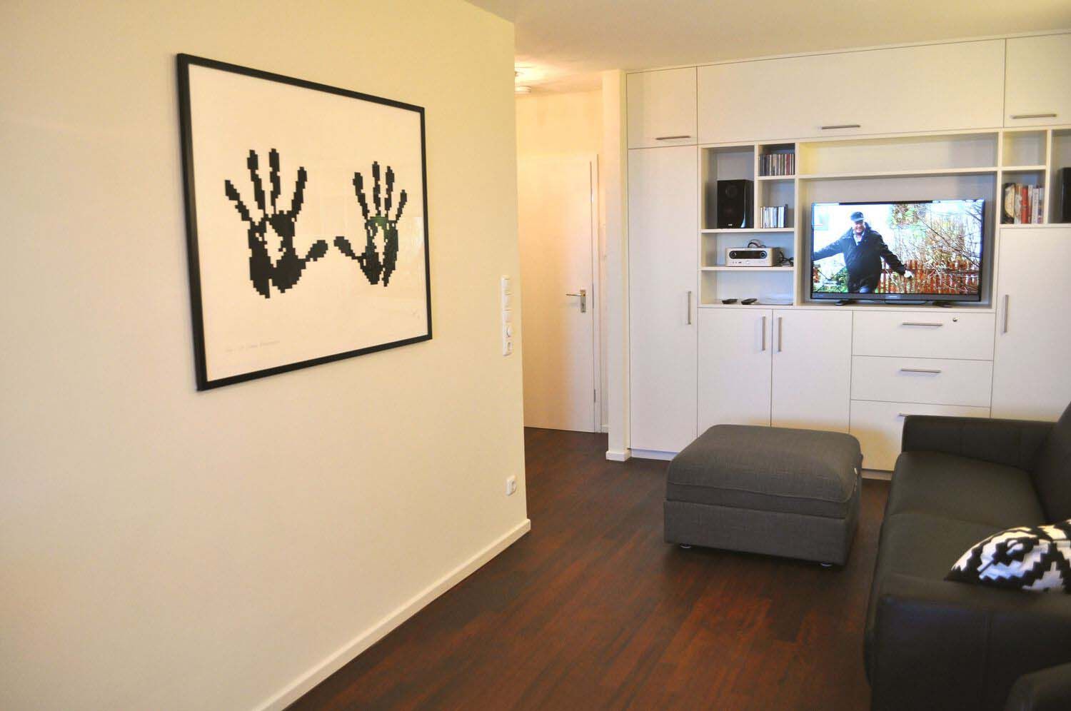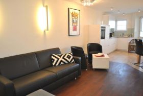 Wohnzimmer: 2 Sessel, 3 Designer-Wandleuchten, 4 Plattenherd mit Ceranfeld, 4 Stühle, Backofen, Couchtisch, Dunstabzugshaube, Einbauküche, Einbauschrank, Esstisch, Flachbildschirm, Geschirr, Kabel-TV, Kaffeemaschine, Kochtöpfe, Kühlschrank mit Gefrierfach, Lederschlafcouch, Nespresso Maschine, Spülmaschine, Staubsauger, Toaster, Wasserkocher