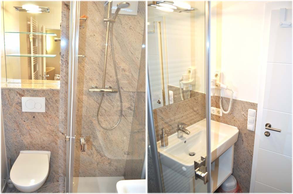 Bad 1: Duschkabine, Flachdusche mit Brauskopf und Regendusche, Fön, Lüfter, Spiegel, Waschtisch, WC