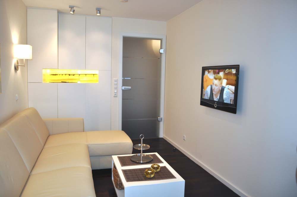 Wohnzimmer: 2 Wandlampen, 4 Plattenherd mit Ceranfeld, 4 Stühle, Backofen, Bügelbrett, Bügeleisen, Couchtisch, Dunstabzugshaube, E-Zitronenpresse, Eierkocher, Einbauküche, Einbauschrank (Kleiderschrank, Abstellschrank), Esstisch, Flachbildschirm, Geschirr, Handmixer, Kabel-TV, Kaffeemaschine, Kochtöpfe, Kühlschrank mit Gefrierfach, Lederschlafcouch 2,00 x 1,40 m Lattenrost 1 Matratze, Leselampe, Mikrowelle, Nespresso Maschine, Soundsystem mit Docking-Station für iPod-iPhone und iPad sowie Radio mit CD-Player und USB- MP3 Anschluss, Spülmaschine, Staubsauger, Teekanne, Toaster, Tritt, Wasserkocher